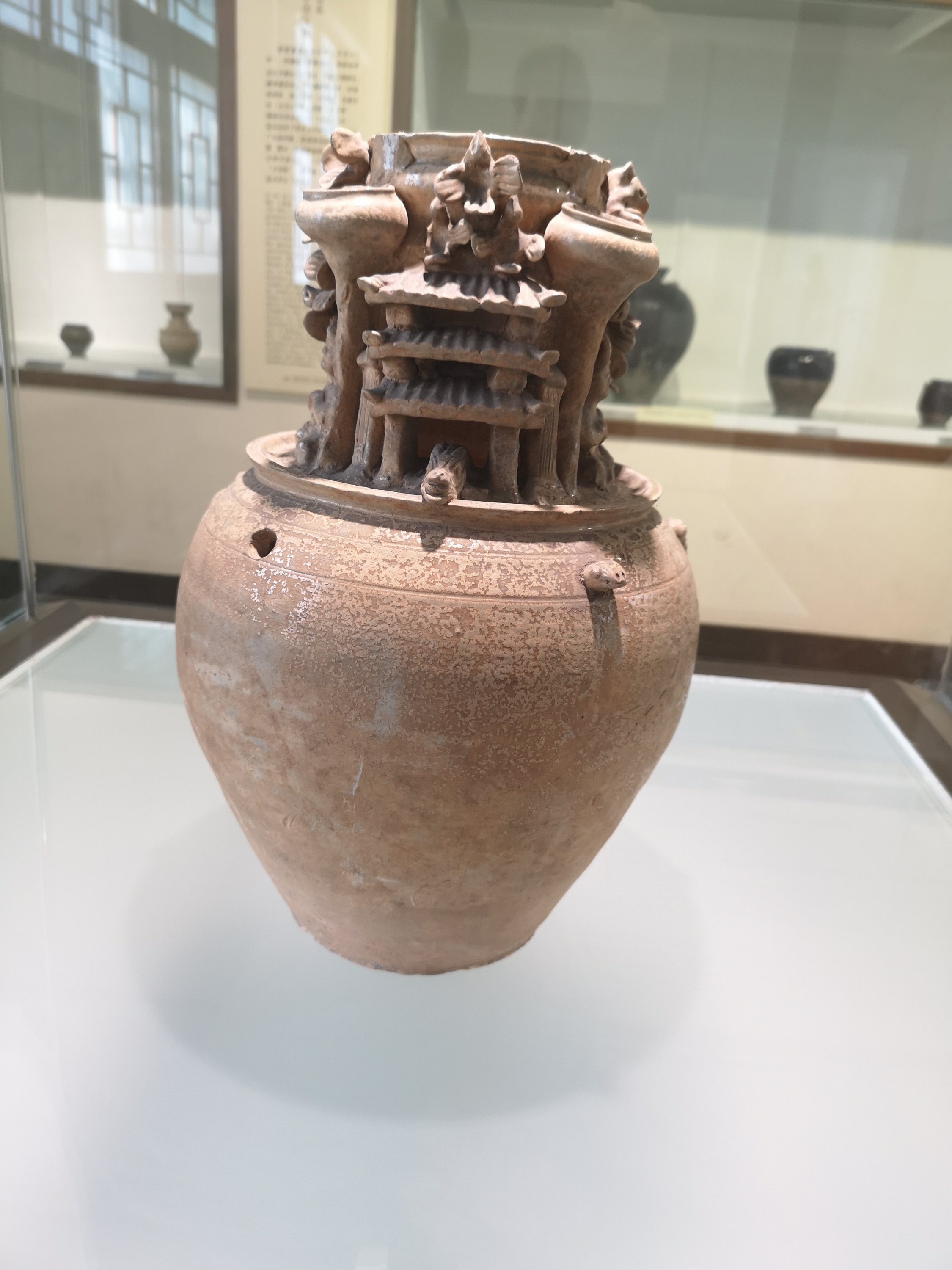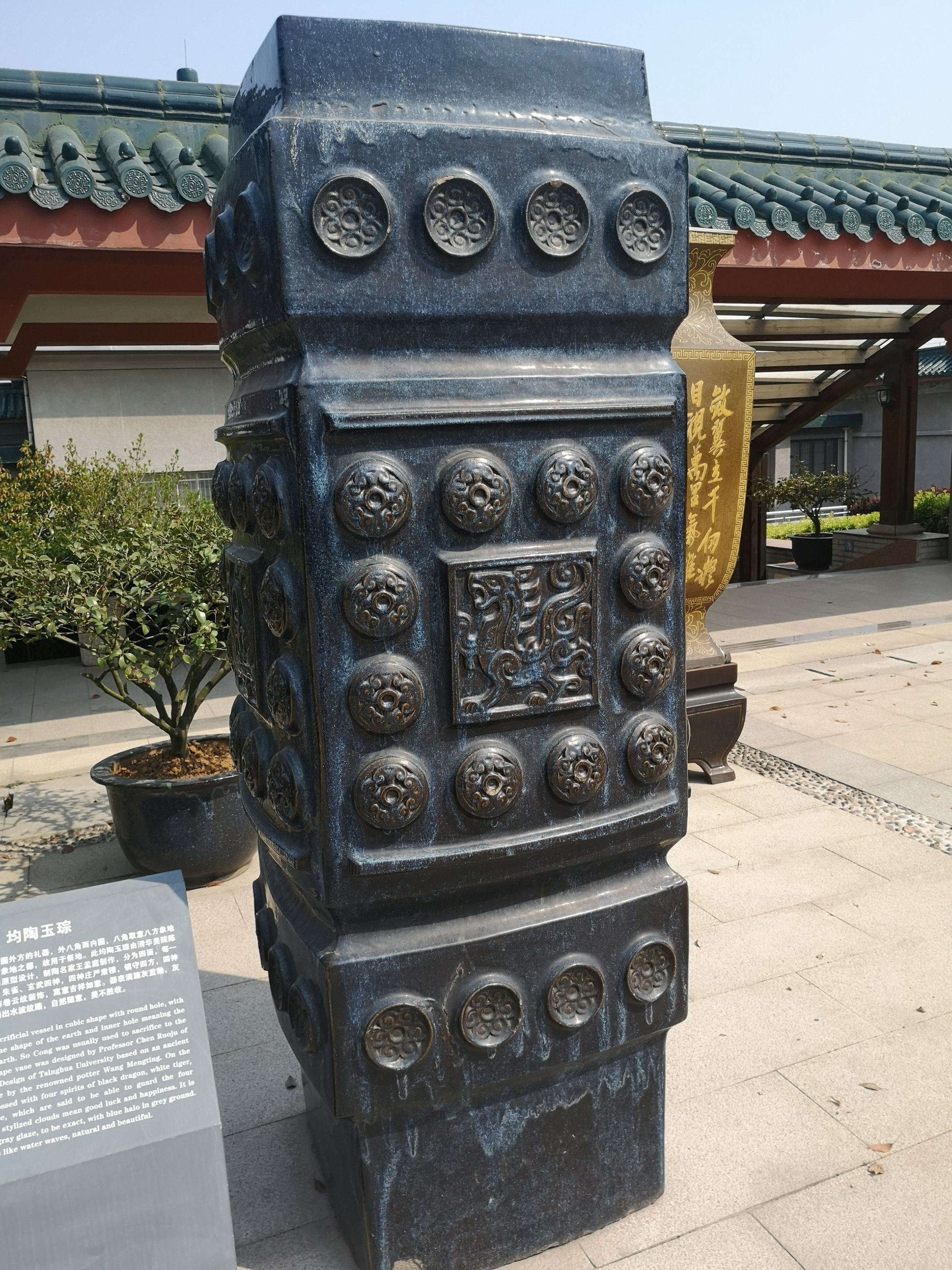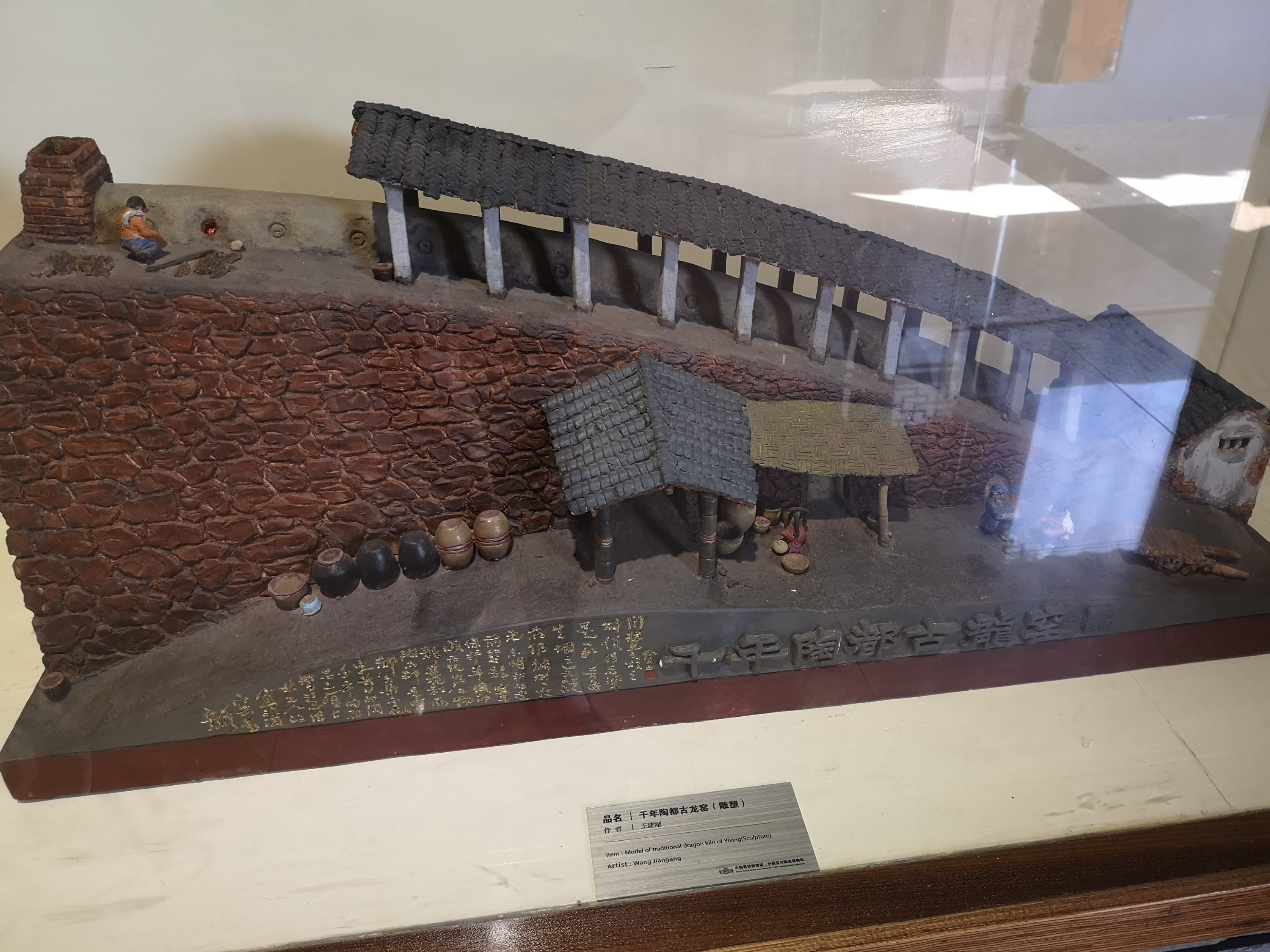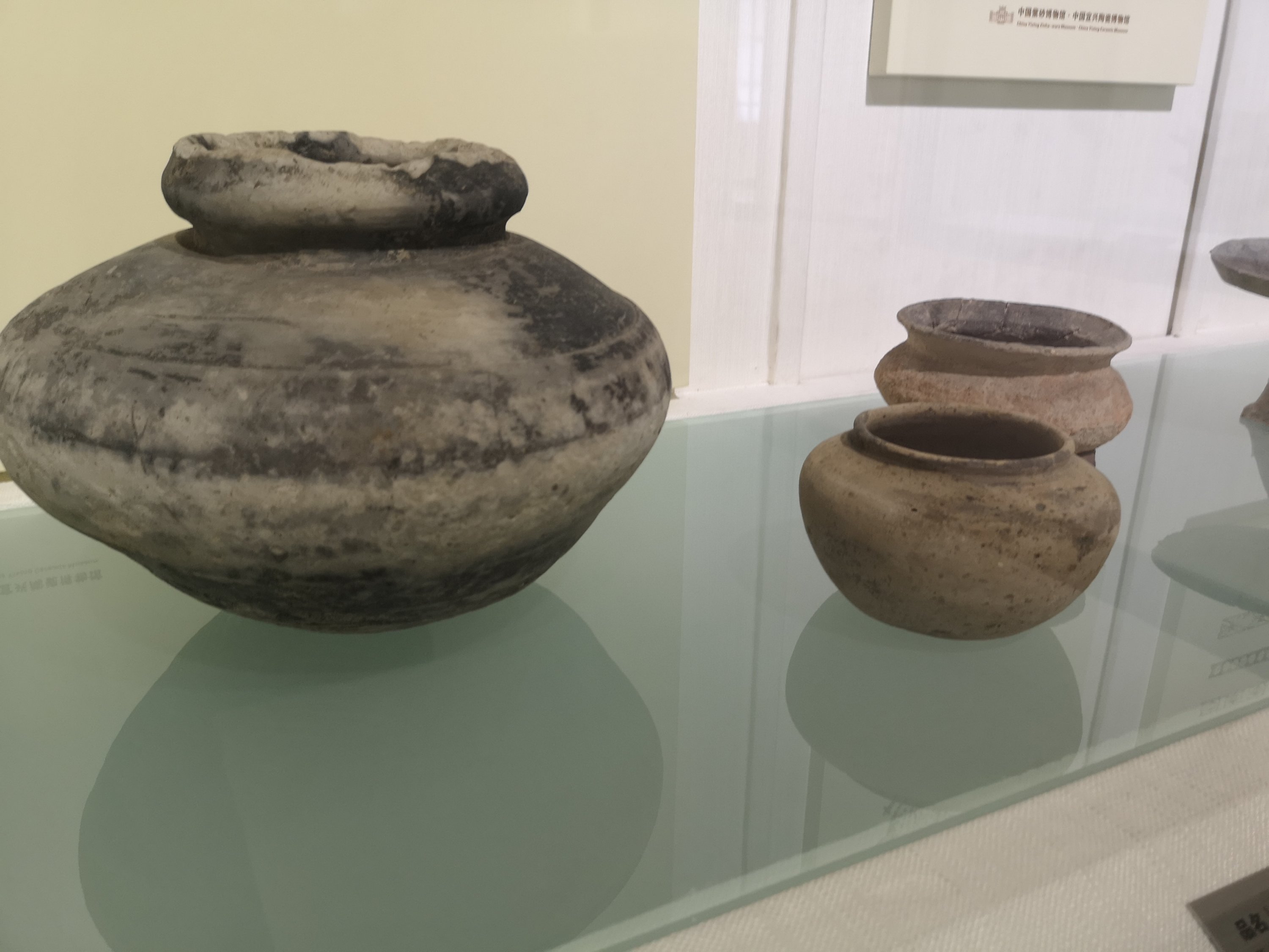 This is a Cong, an sacrificial vessel. Each symbol means something. Spirits to guard the 4 directions (dragon, suzaka, tiger, tortoise), clouds are for happiness, and waves for tranquility. The dragon is not painted, it is embossed clay.Much of the old pottery was found where dragon kilns were excavated. Shards and complete pieces of pottery would be found near them. This is a mock up of what one looks like.Pottery was also buried with people in grave pits. This was found from the Zhou tomb of the Jing Dynasty. It was used to celebrate bumper harvests of fruit and grain. It is called a soul bottle when used as a funeral object.Each Dynasty had access to different clays, tools, and established new techniques.Ming Dynasty.Qing Dynasty oil pot and mould for making impression designs.Suri and Tang DynastyHan DynastyLate Neolithic age.Warring States period.