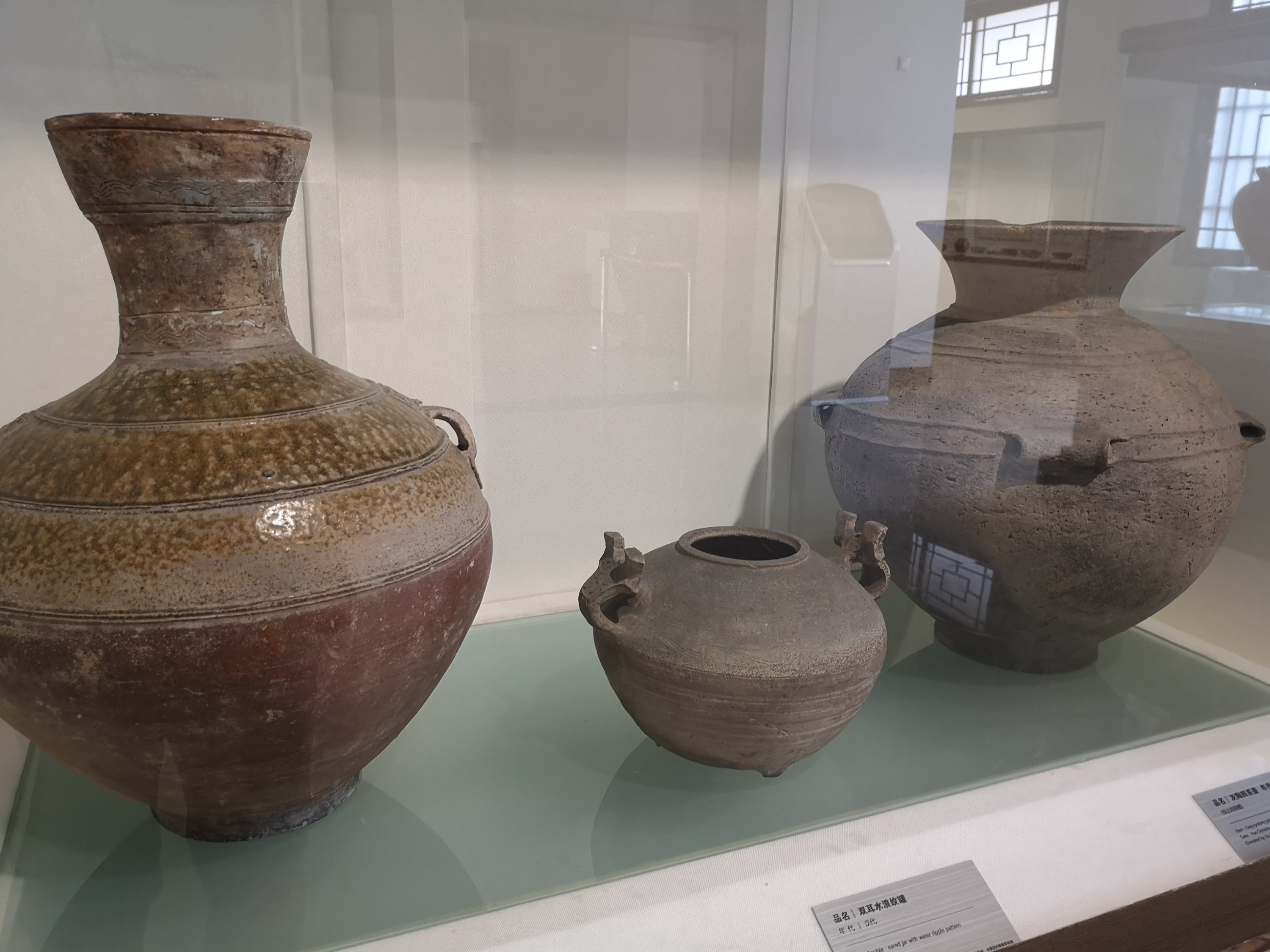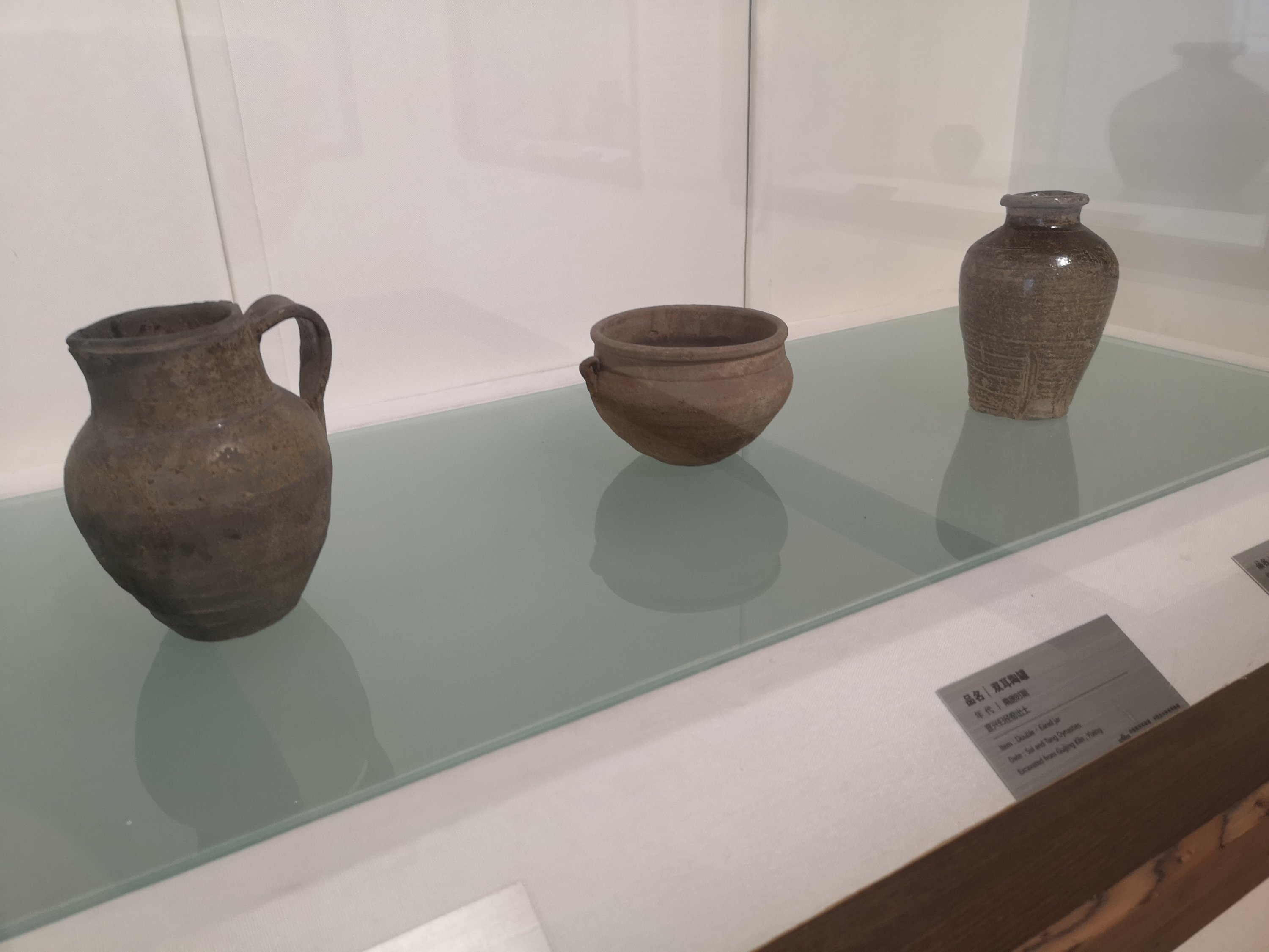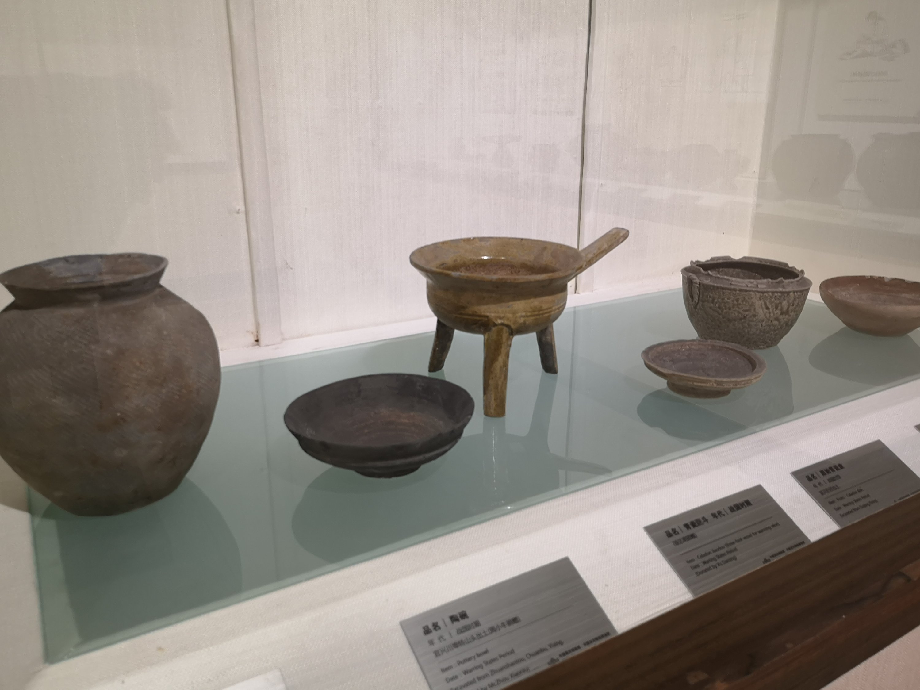 This is a Cong, an sacrificial vessel. Each symbol means something. Spirits to guard the 4 directions (dragon, suzaka, tiger, tortoise), clouds are for happiness, and waves for tranquility. The dragon is not painted, it is embossed clay.Much of the old pottery was found where dragon kilns were excavated. Shards and complete pieces of pottery would be found near them. This is a mock up of what one looks like.Pottery was also buried with people in grave pits. This was found from the Zhou tomb of the Jing Dynasty. It was used to celebrate bumper harvests of fruit and grain. It is called a soul bottle when used as a funeral object.Each Dynasty had access to different clays, tools, and established new techniques.Ming Dynasty.Qing Dynasty oil pot and mould for making impression designs.Suri and Tang DynastyHan DynastyLate Neolithic age.Warring States period.