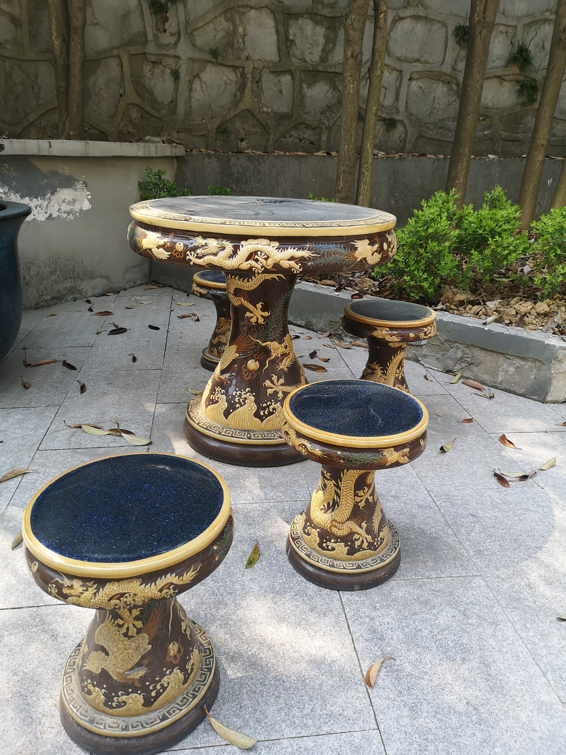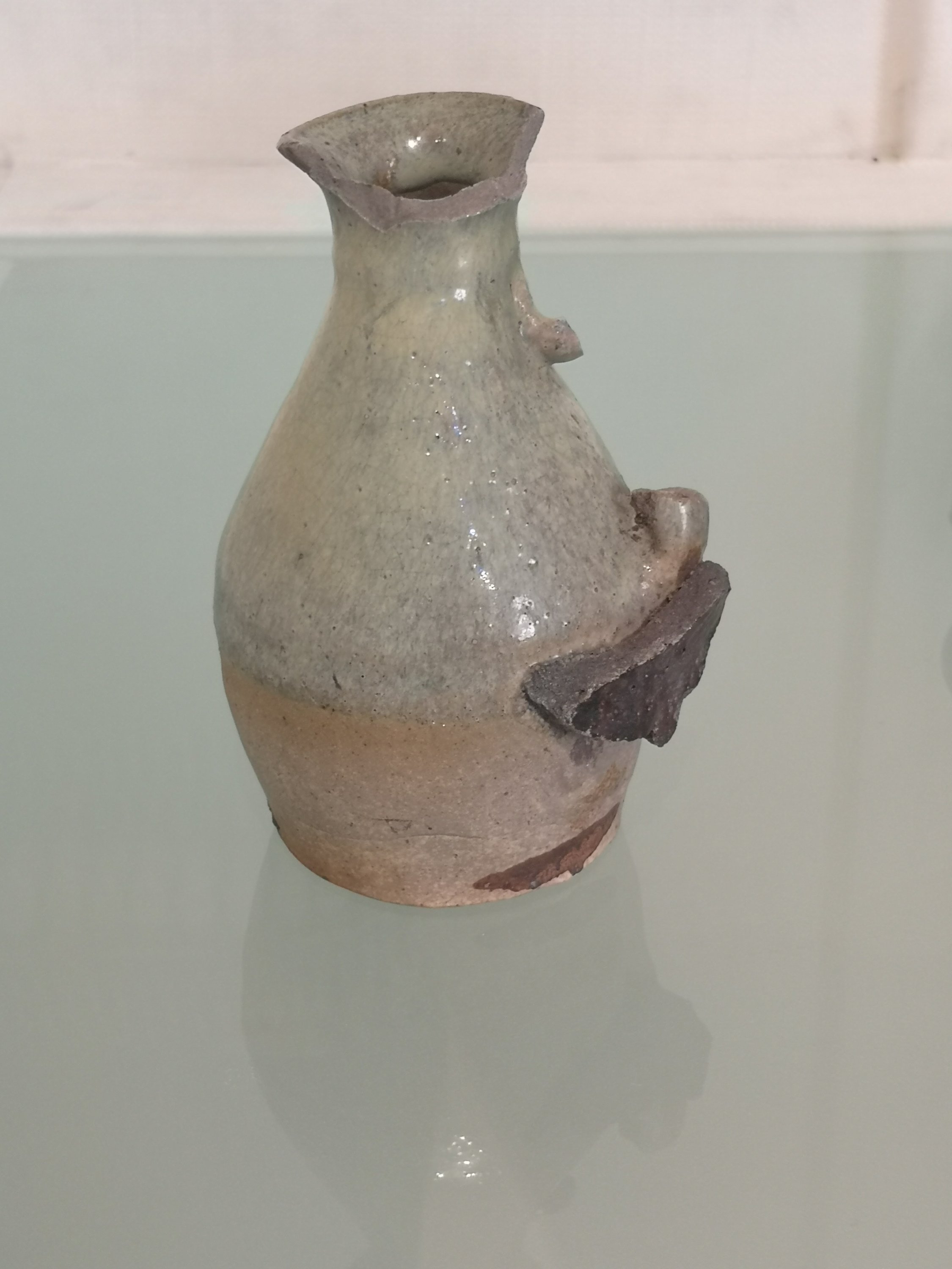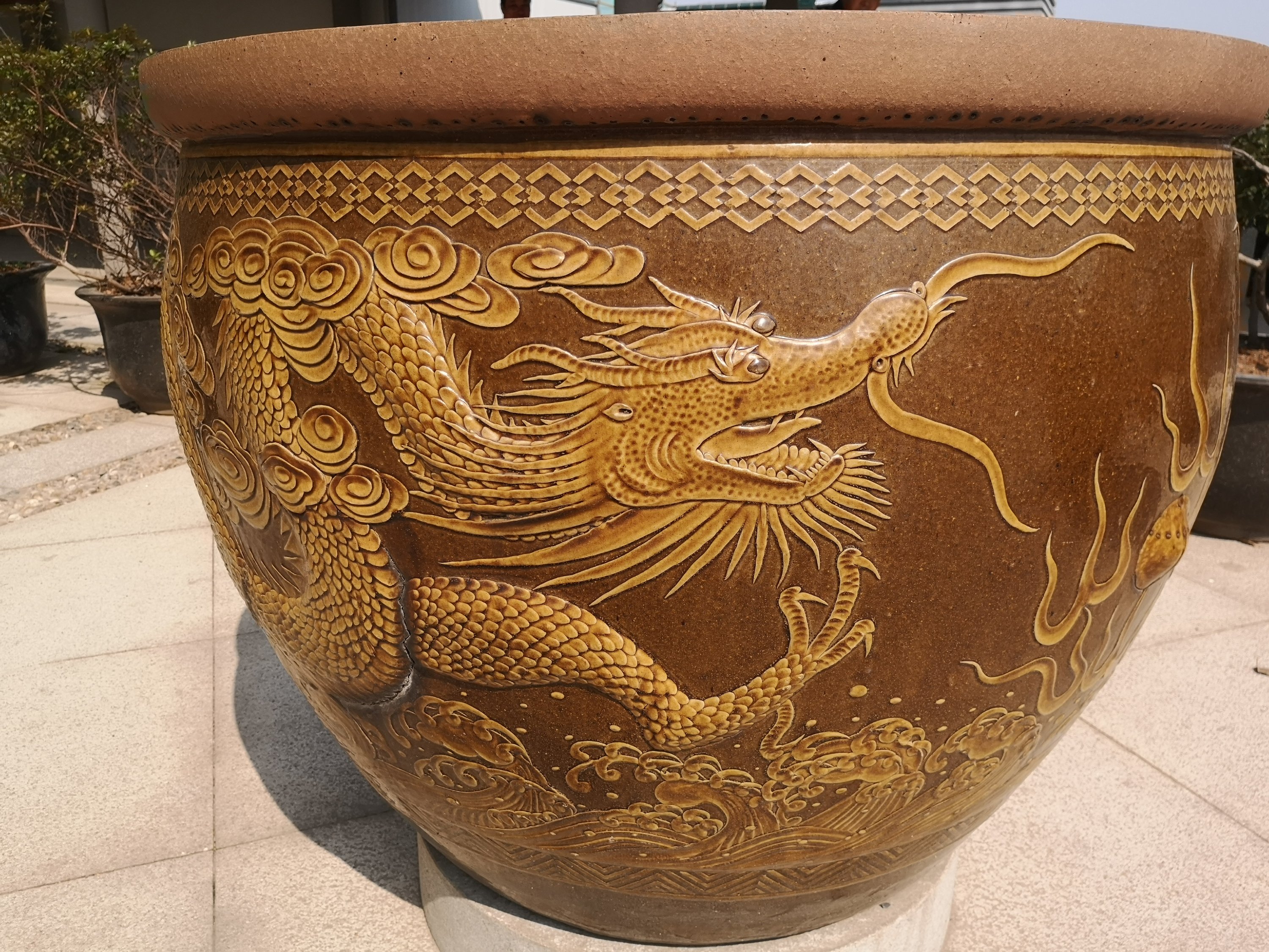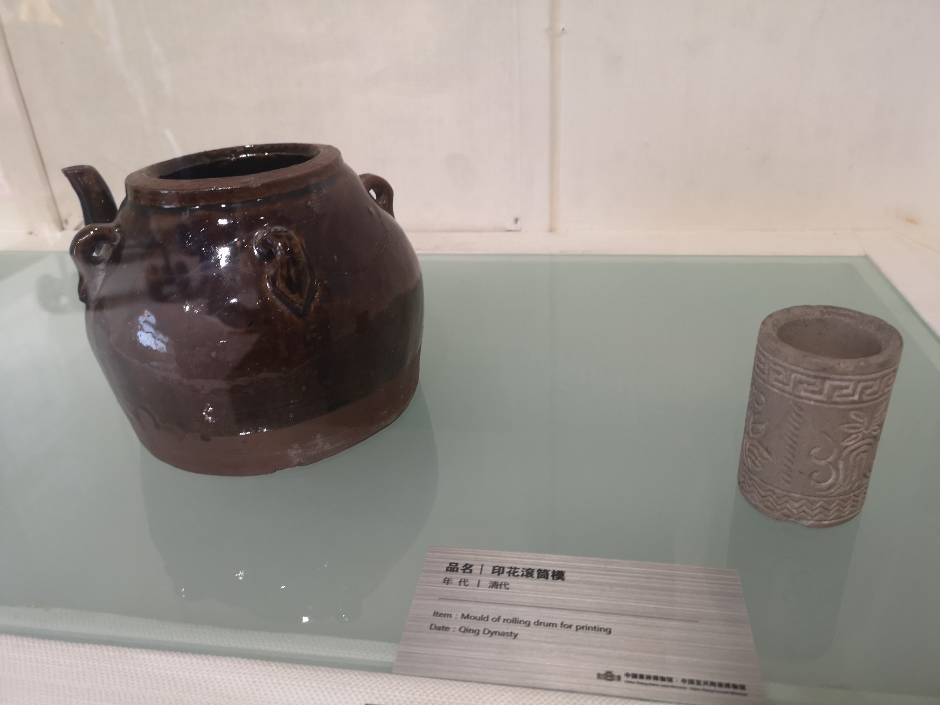 This is a Cong, an sacrificial vessel. Each symbol means something. Spirits to guard the 4 directions (dragon, suzaka, tiger, tortoise), clouds are for happiness, and waves for tranquility. The dragon is not painted, it is embossed clay.Much of the old pottery was found where dragon kilns were excavated. Shards and complete pieces of pottery would be found near them. This is a mock up of what one looks like.Pottery was also buried with people in grave pits. This was found from the Zhou tomb of the Jing Dynasty. It was used to celebrate bumper harvests of fruit and grain. It is called a soul bottle when used as a funeral object.Each Dynasty had access to different clays, tools, and established new techniques.Ming Dynasty.Qing Dynasty oil pot and mould for making impression designs.Suri and Tang DynastyHan DynastyLate Neolithic age.Warring States period.