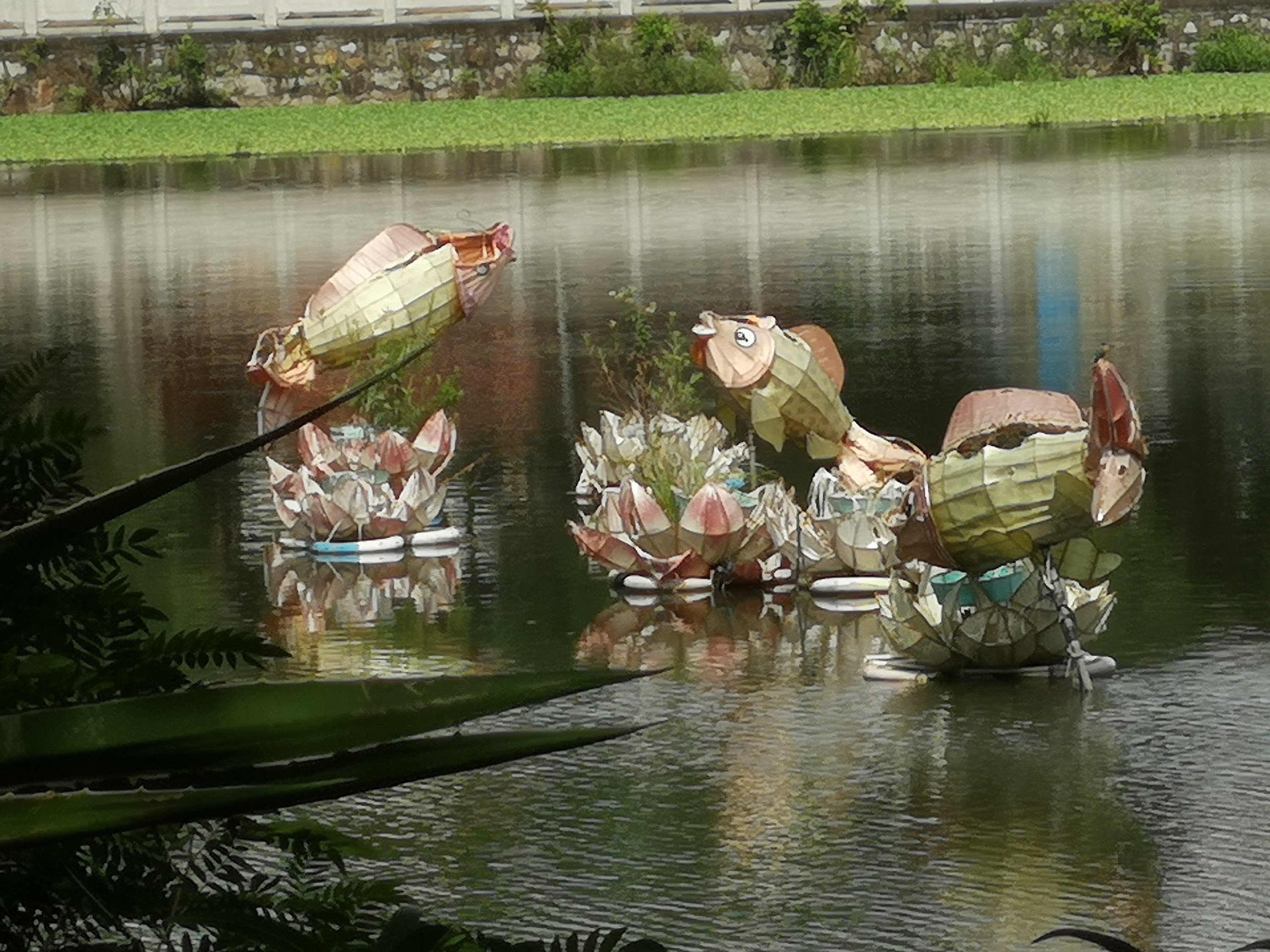 Fish sculptures in the lake.
