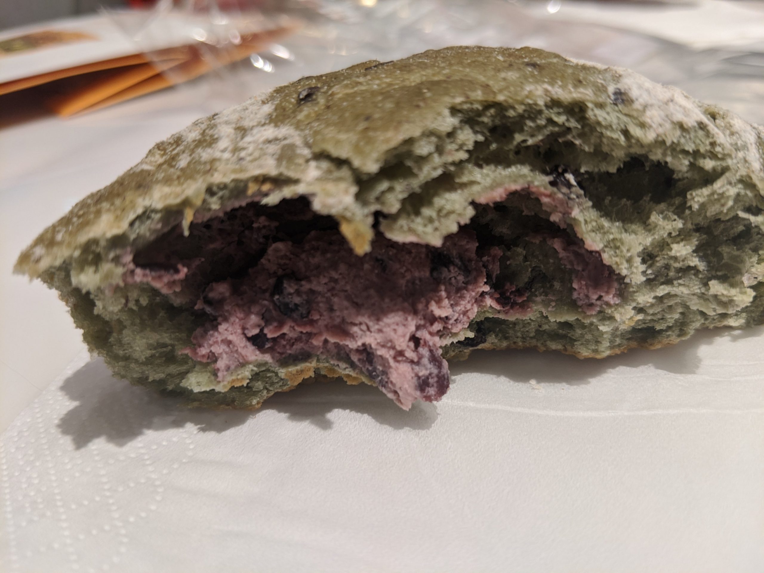 There is some odd looking good that taste fabulous. This is matcha, black rice, and blueberry cheese.