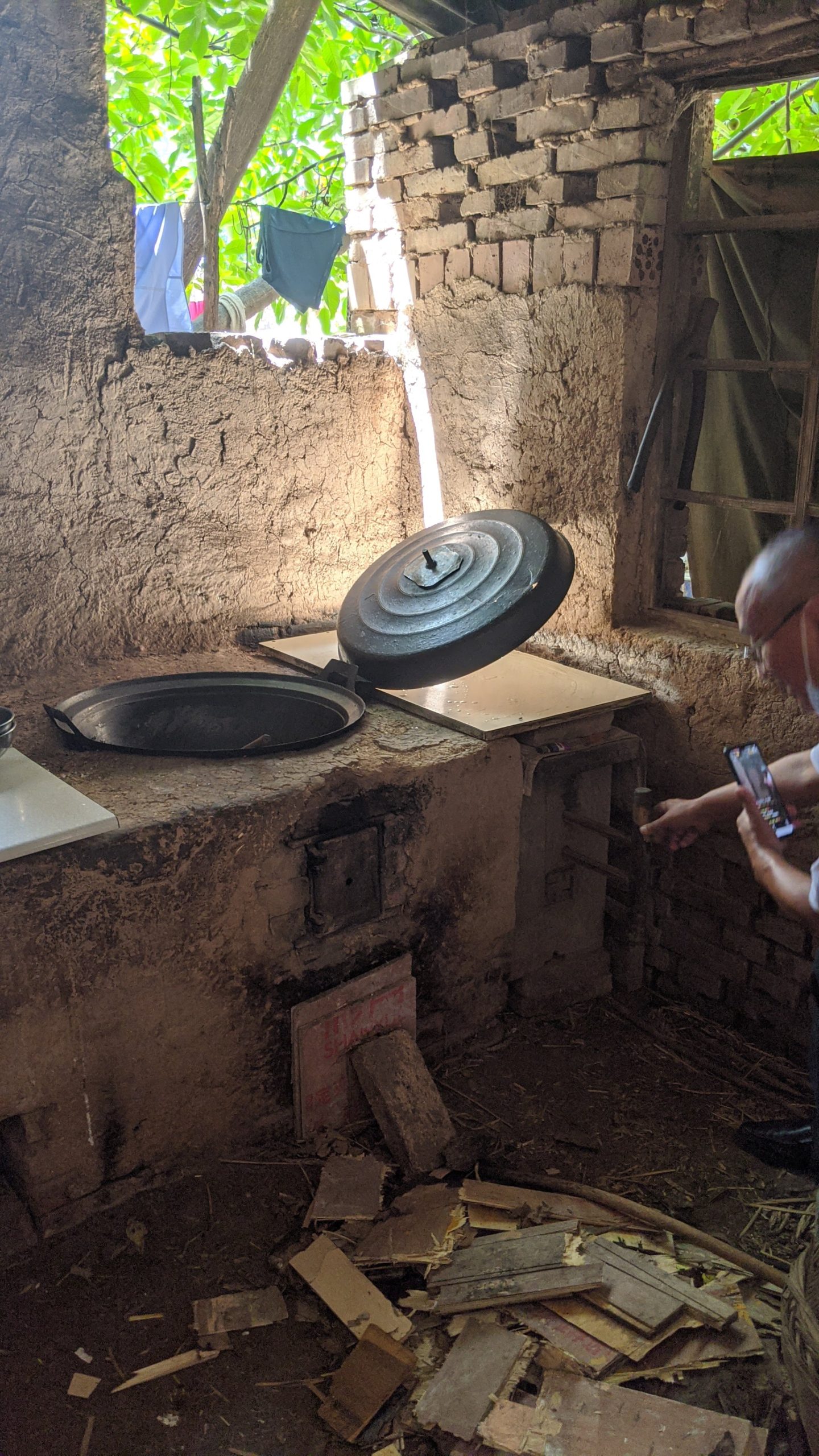 The kitchen is outside and on the right you can push and pull the bellows to fan the flames.