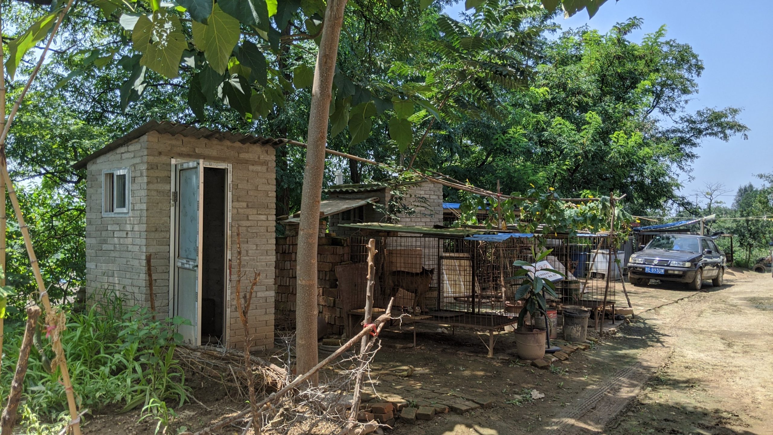 Community bathroom. To the right are did kennels. Unfortunately, one villager breeds dogs to sell for dog fighting. Yes they are pit bulls which are illegal in China.