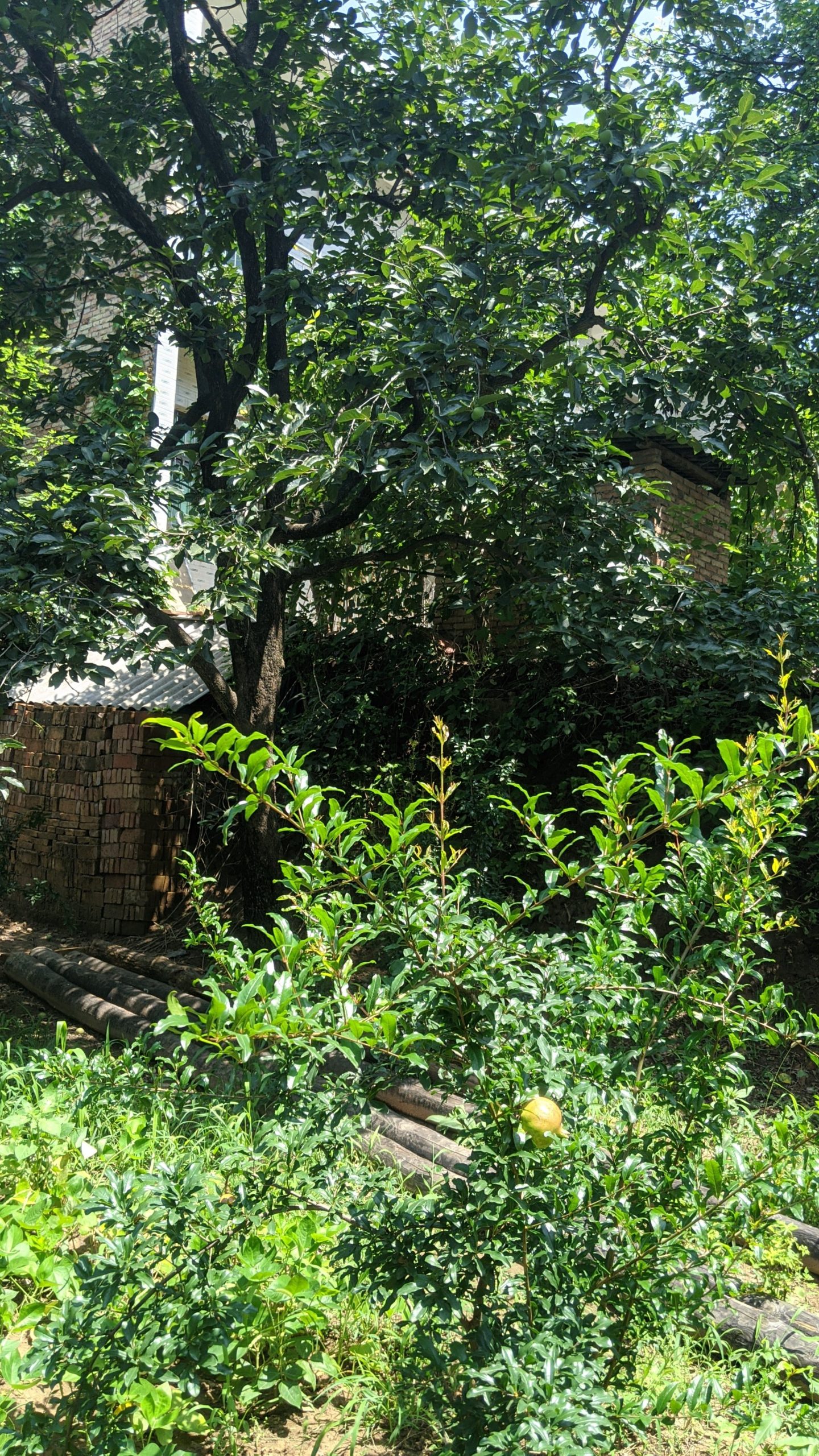 They have walnut trees and many others. In the front is pomegranate. Behind is a persimmon tree.