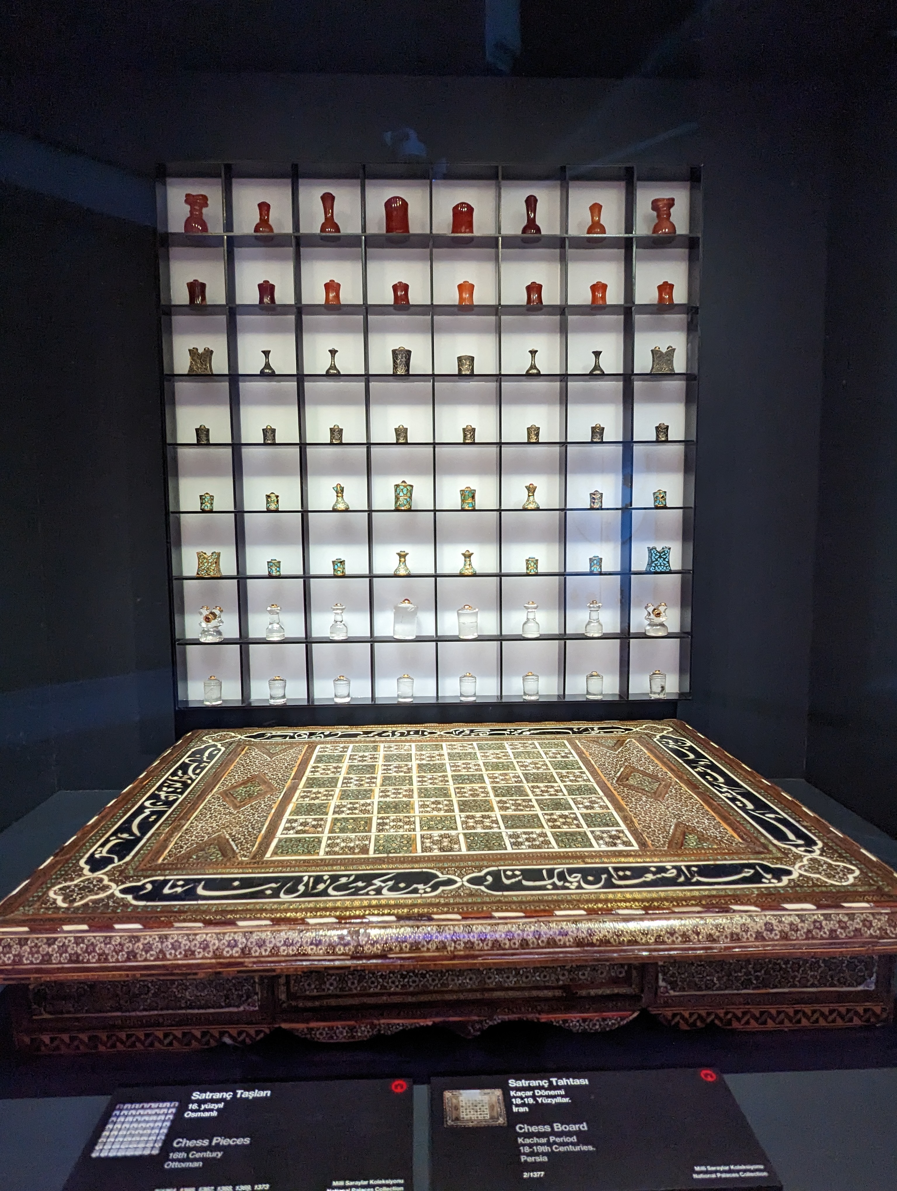 A chess board with jeweled pieces.