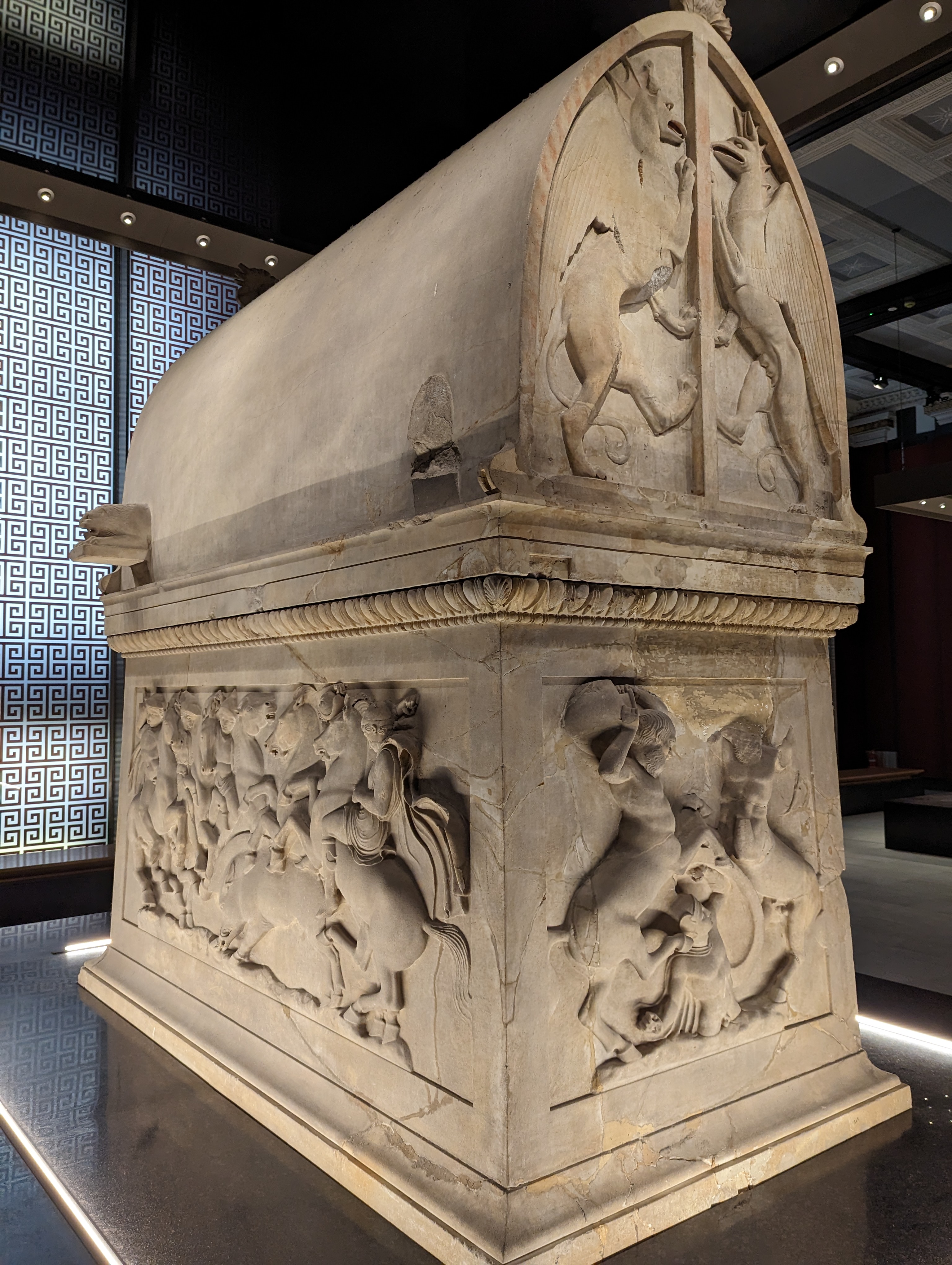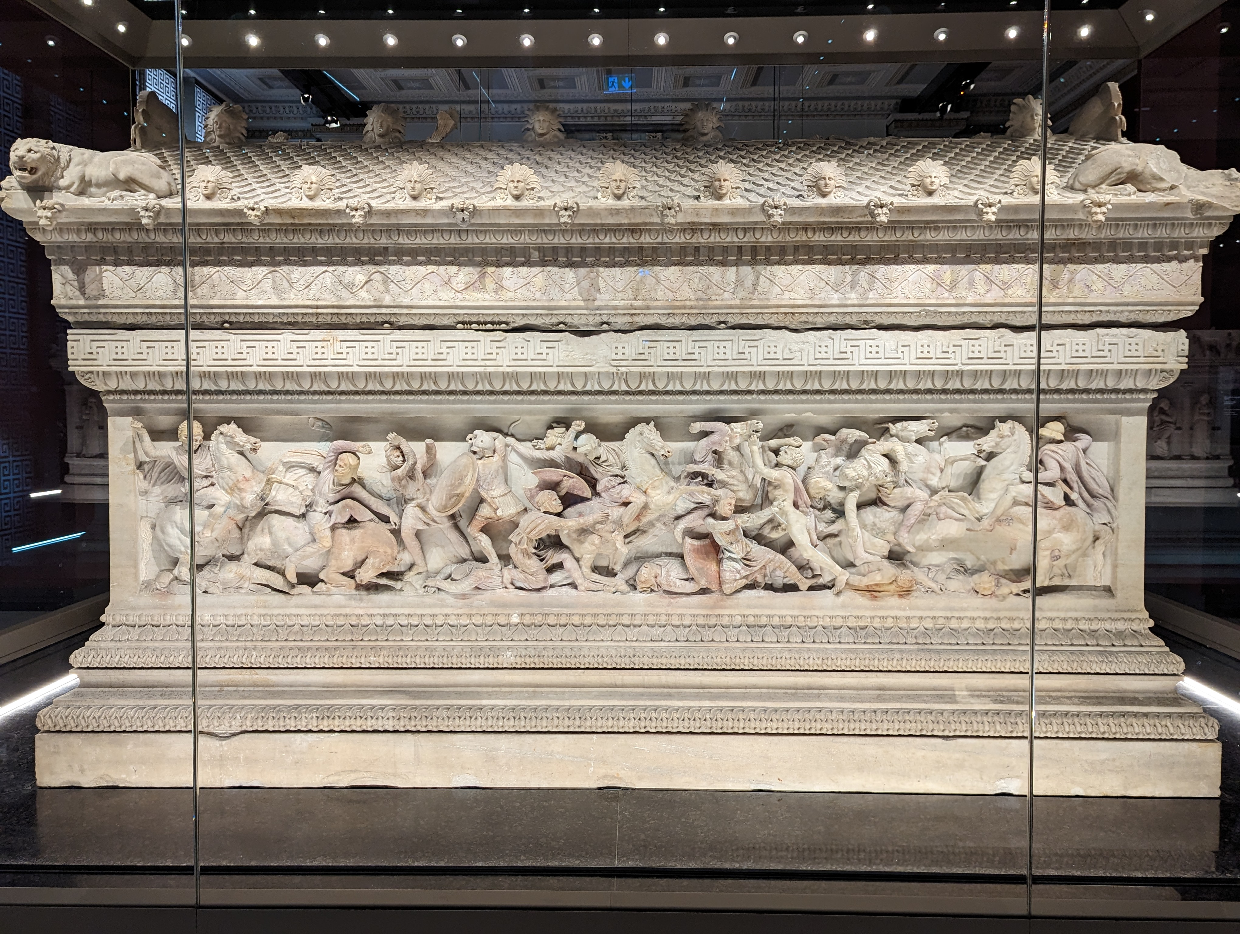 Alexander sarcophagus, 300 BCE. Sarcophagus of the lasr King of Sidon. The artwork is the winning of the battle of Issus which gave Alexander a gateway to Syria and made the deceased the king of Sidon.