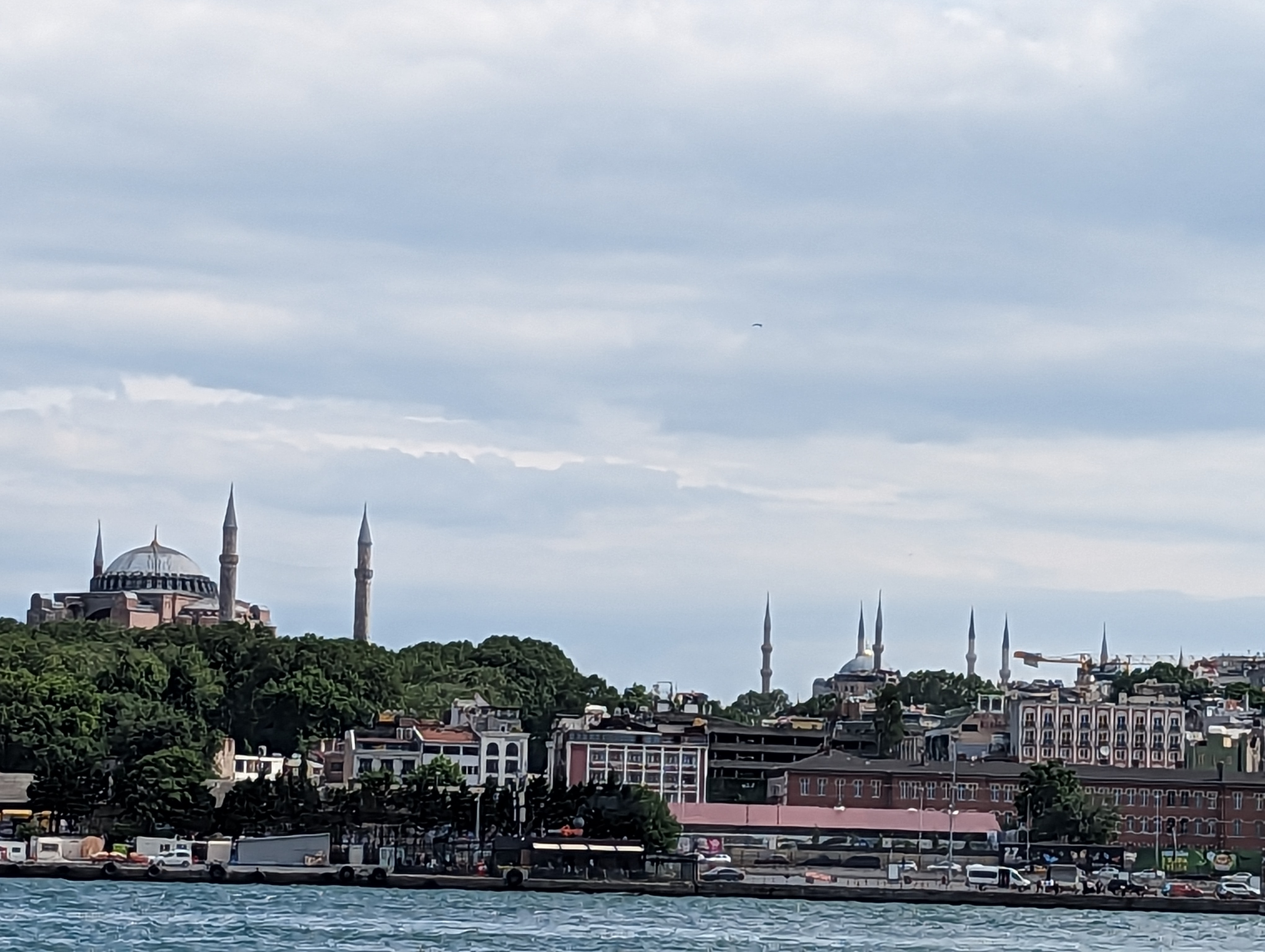 The minaretes of the two mosques: the Hagia Sophia on the left and the Blue Mosque on the right.