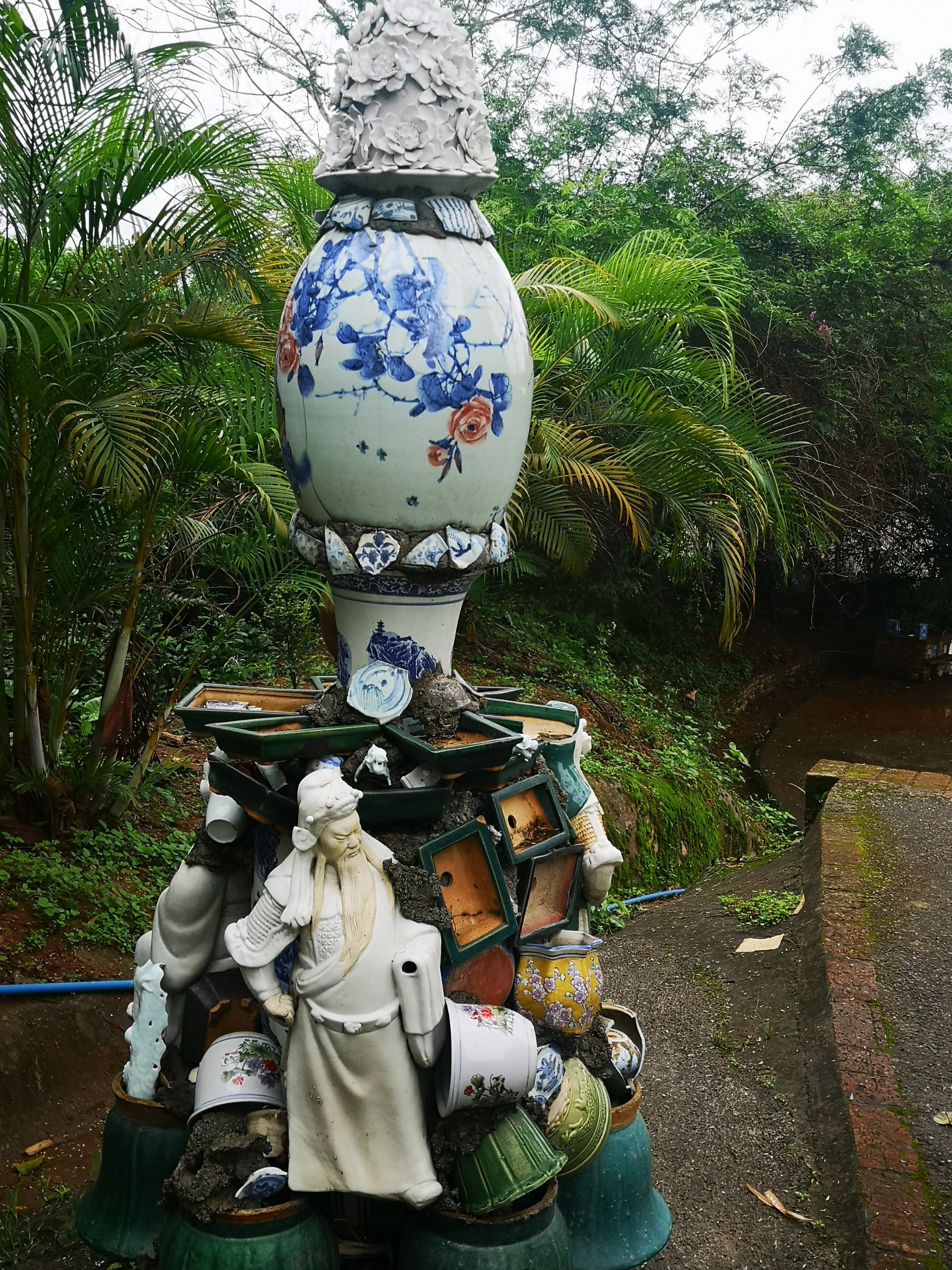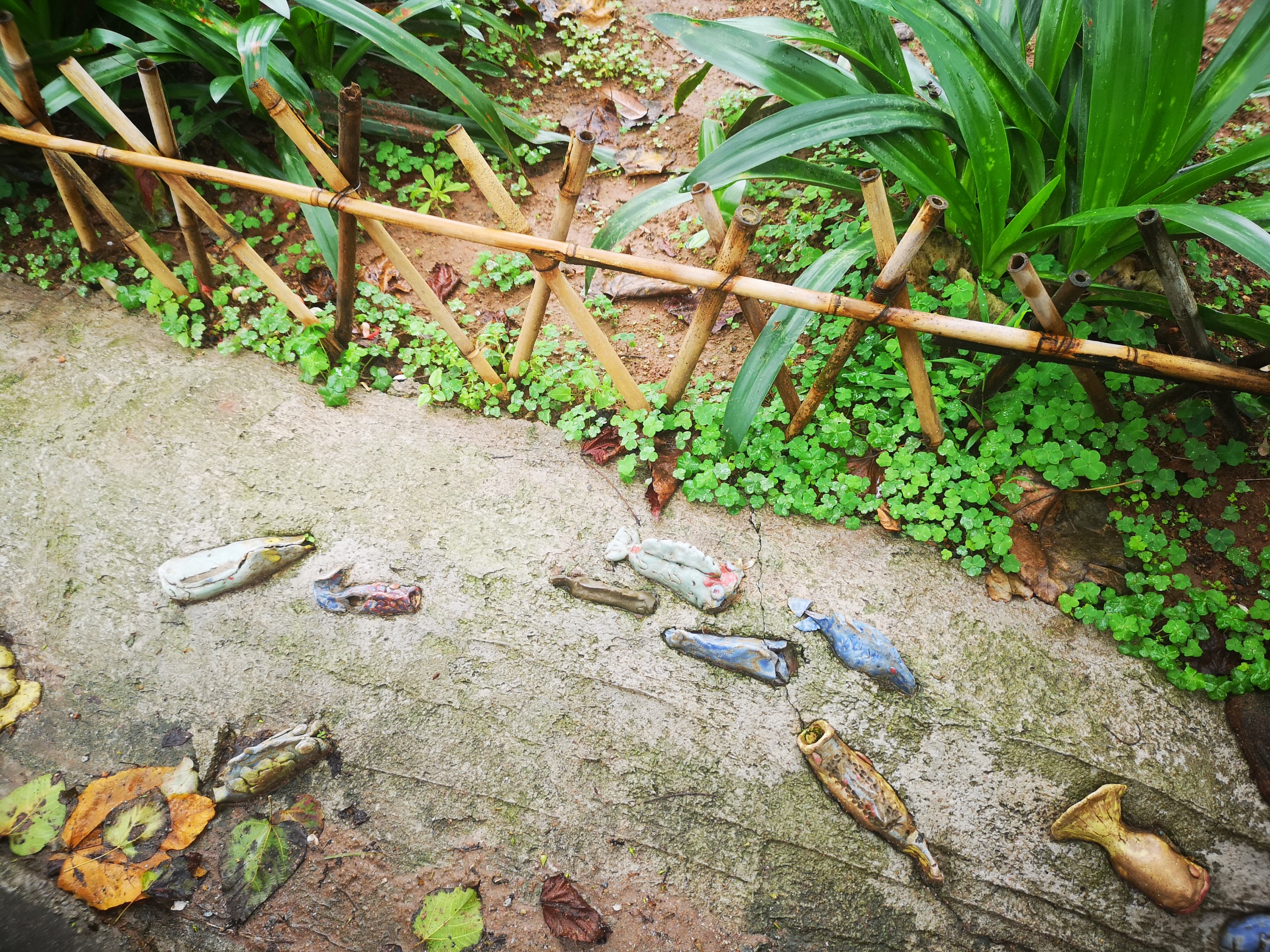 Pieces of pottery are found in walls and walkways.