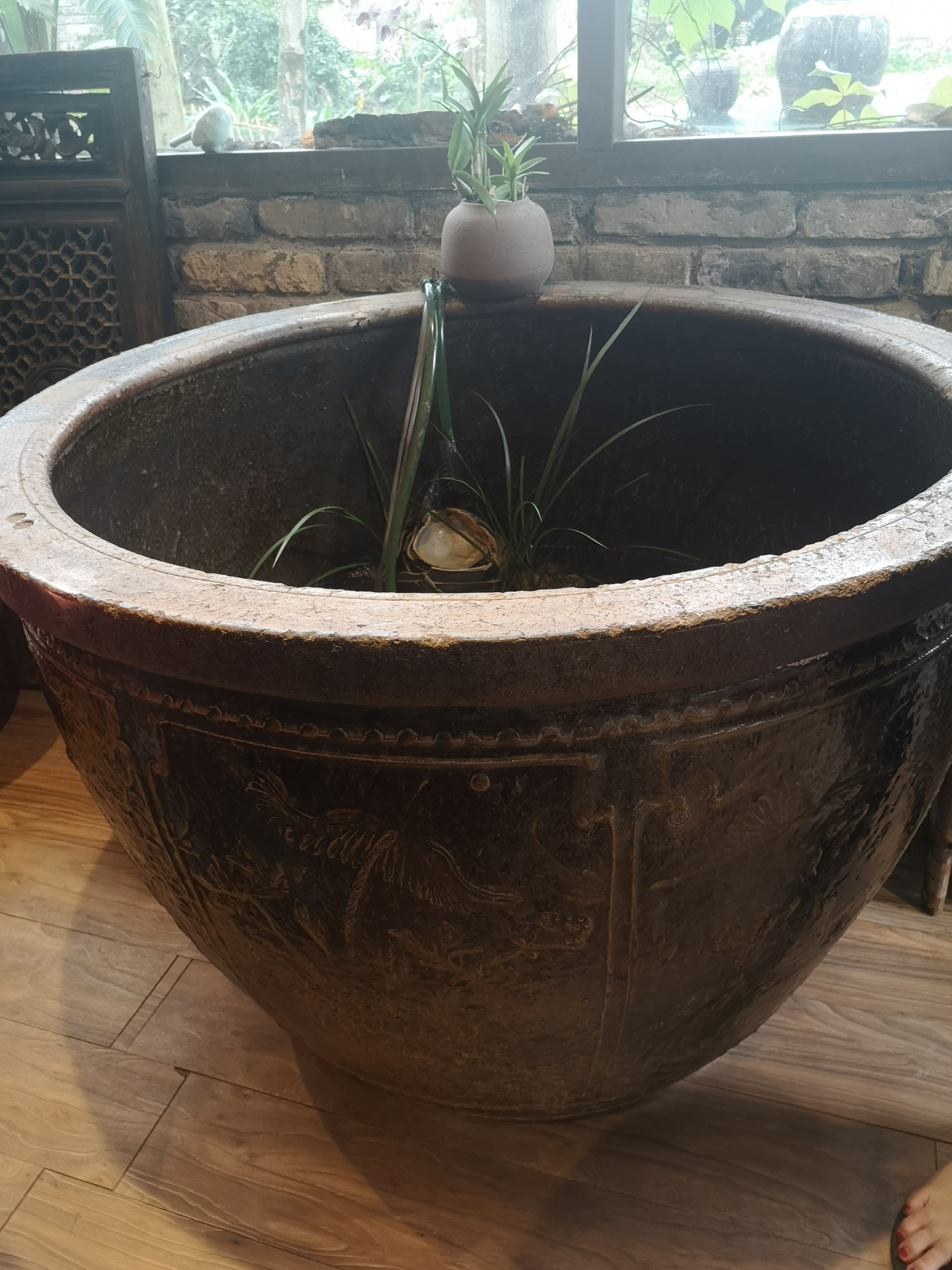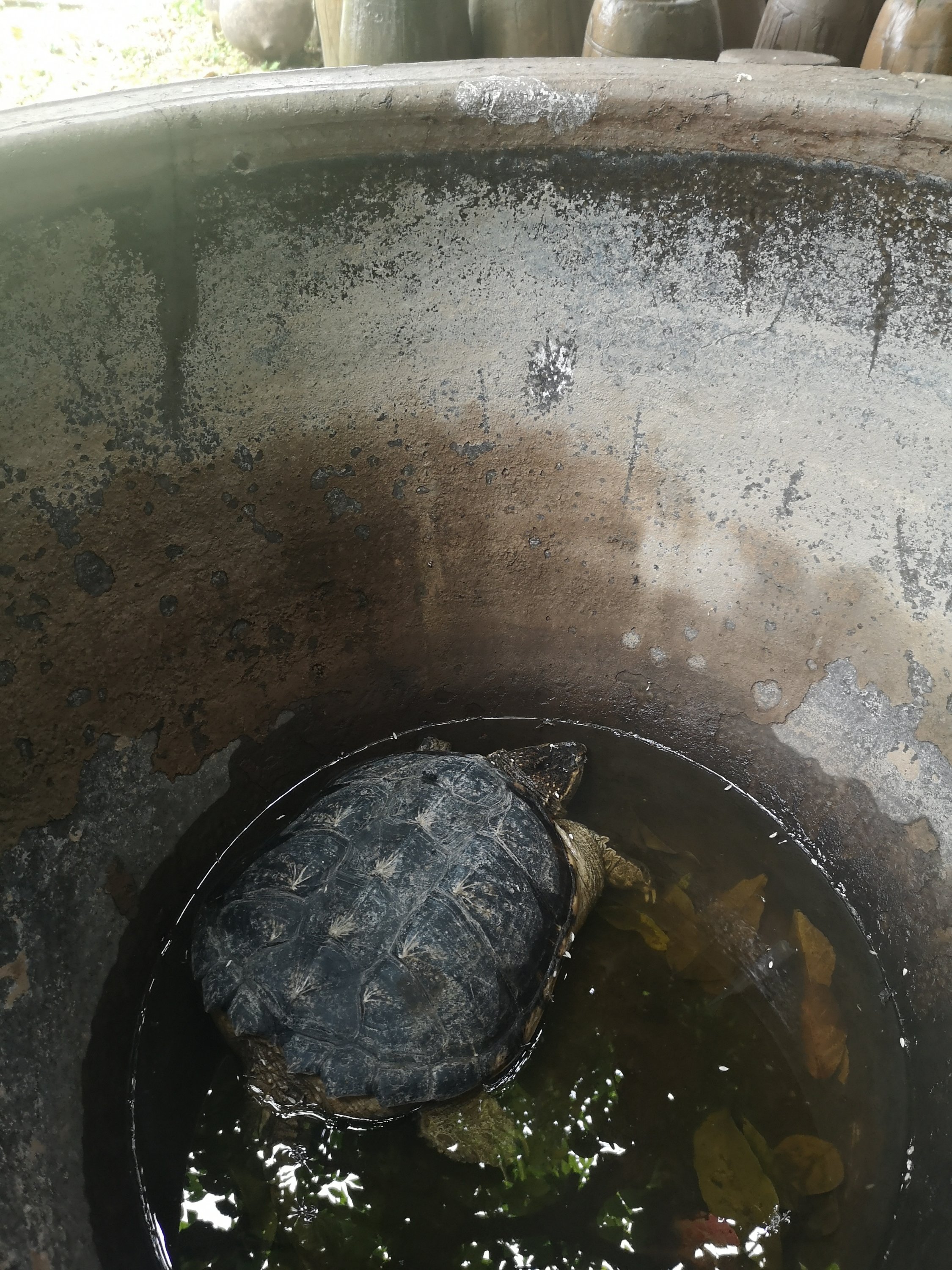 Inside a large pottery piece is a turtle.