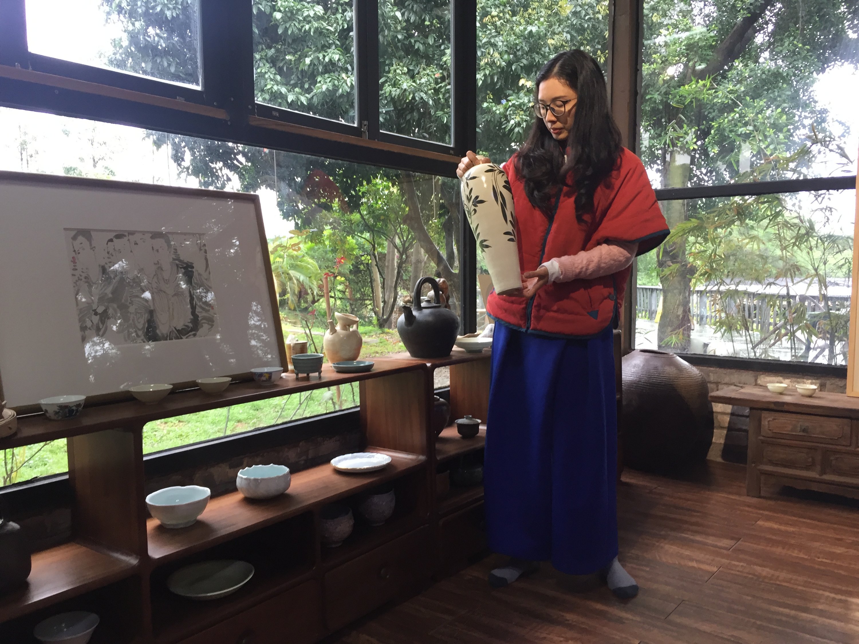 The artist and her husband teach ceramics at university, offer classes, and create pieces on order. They have a couple apprentices working with them. They live the slow life: Growing their own food and living the artist life.