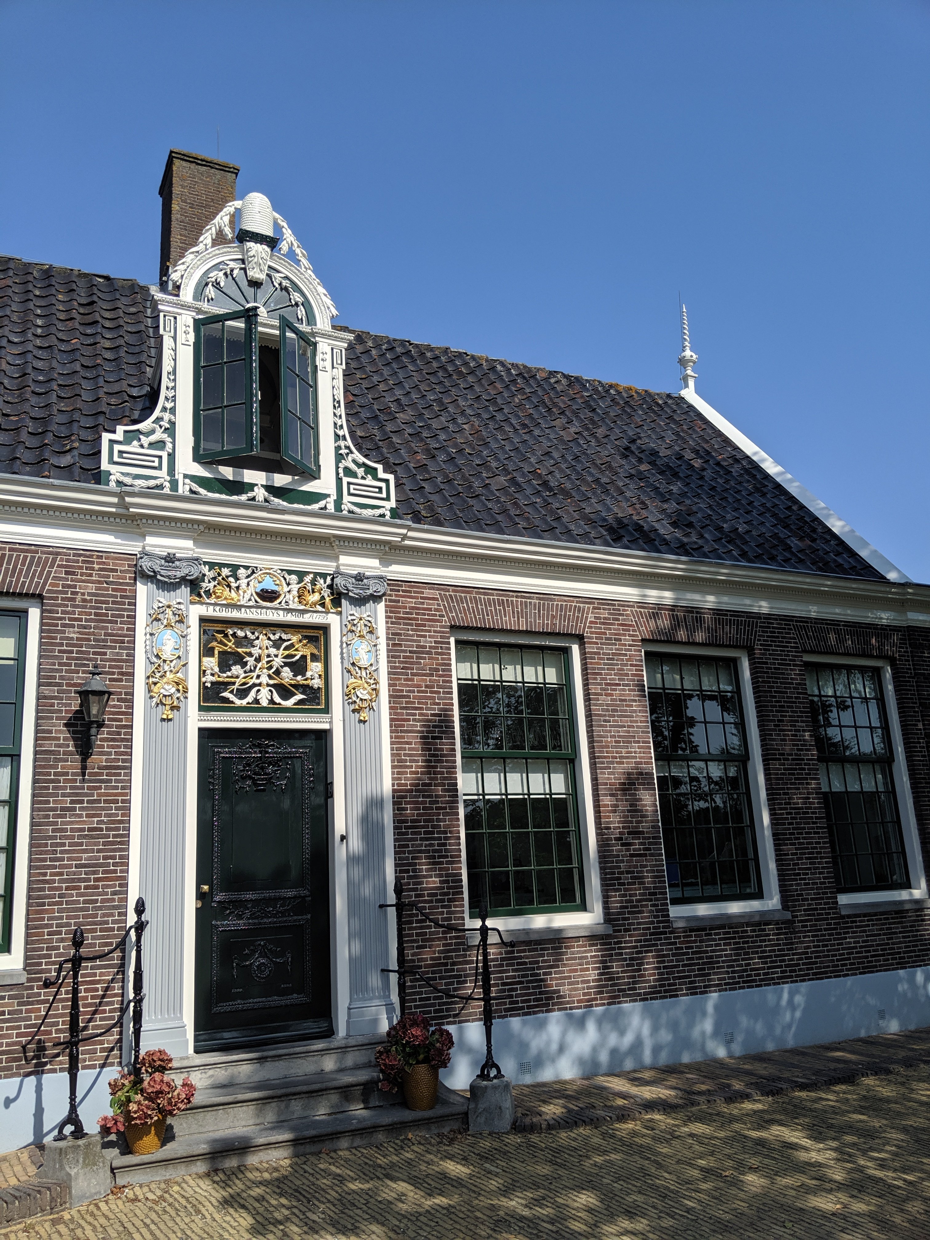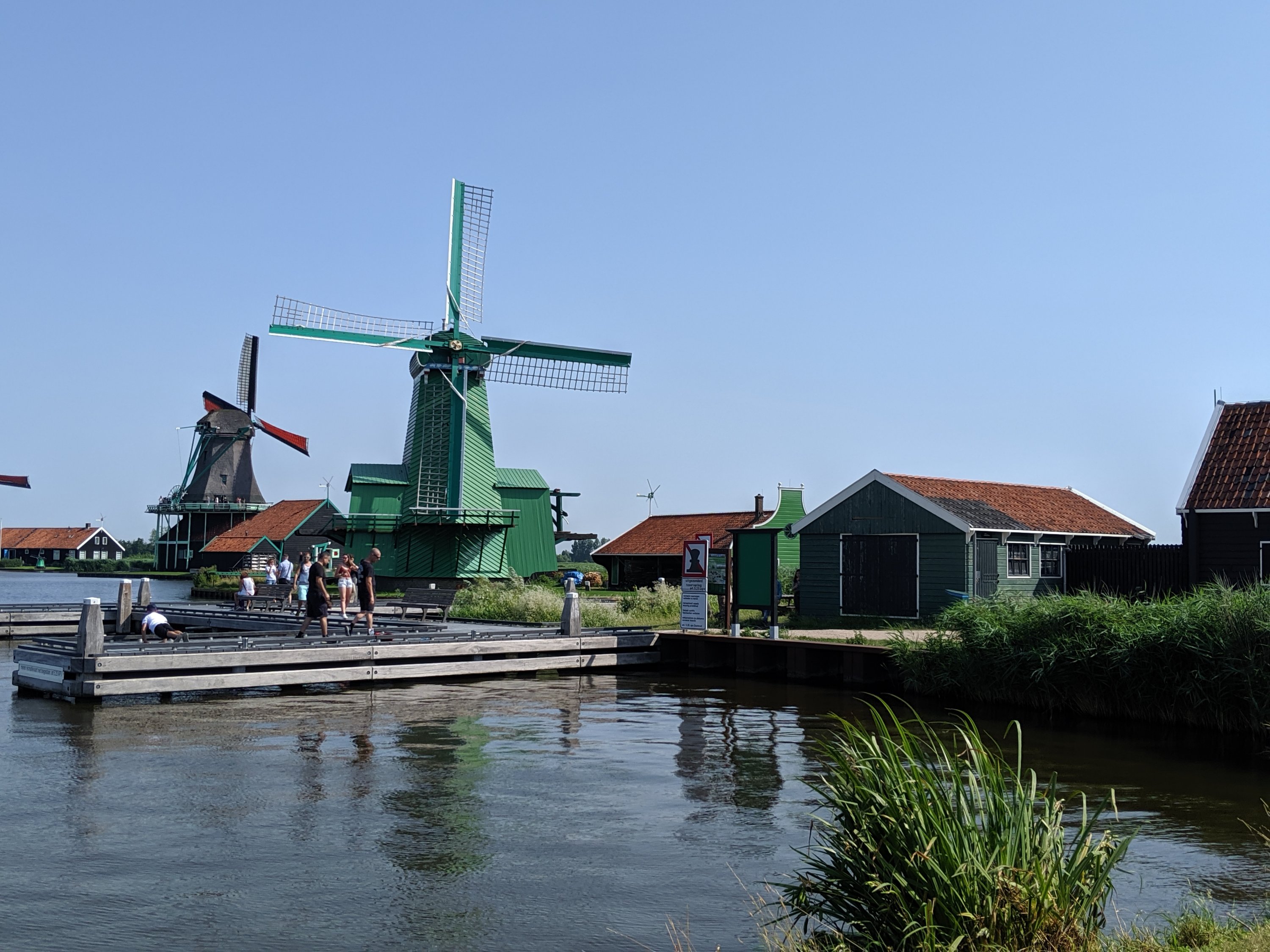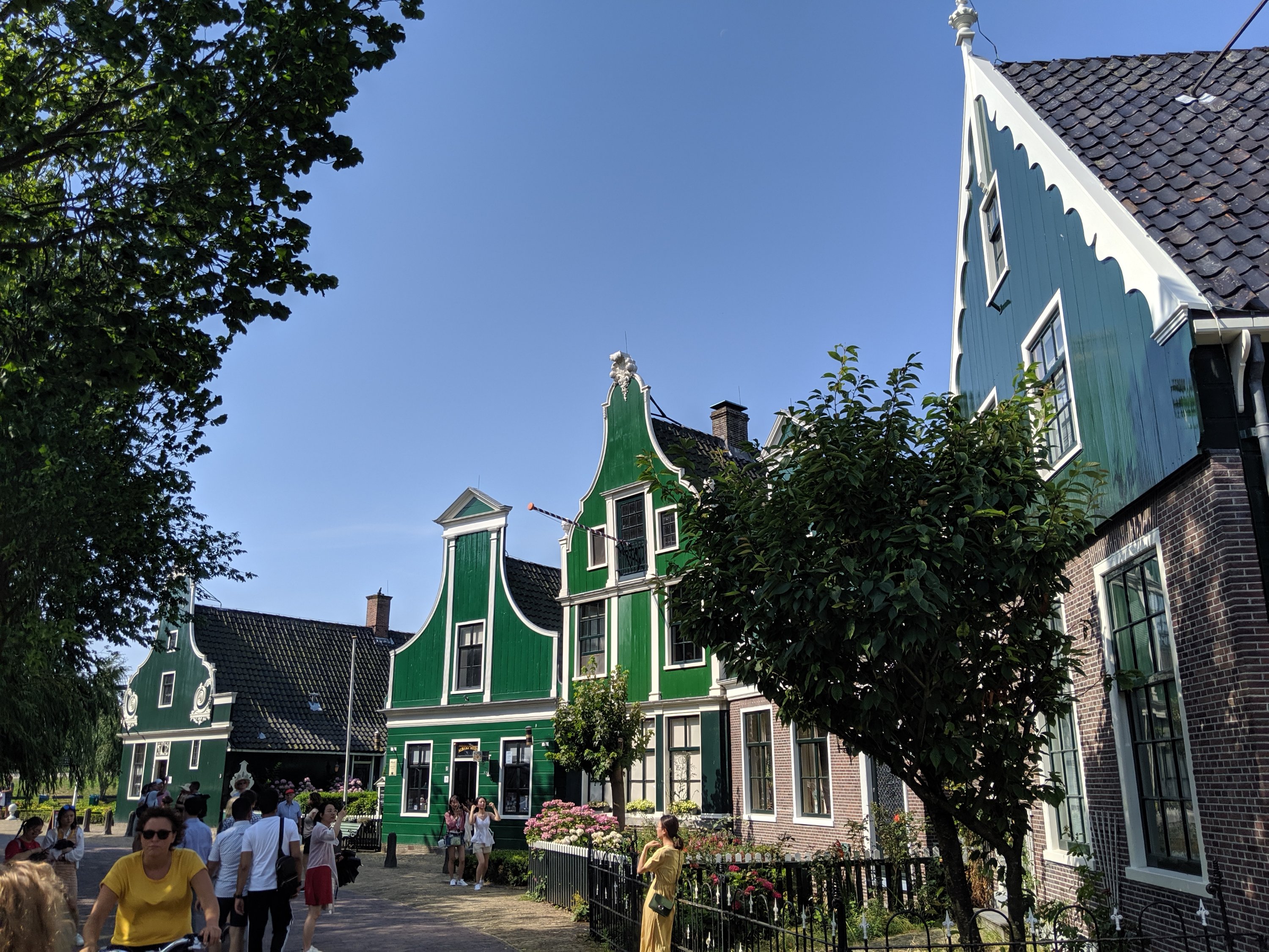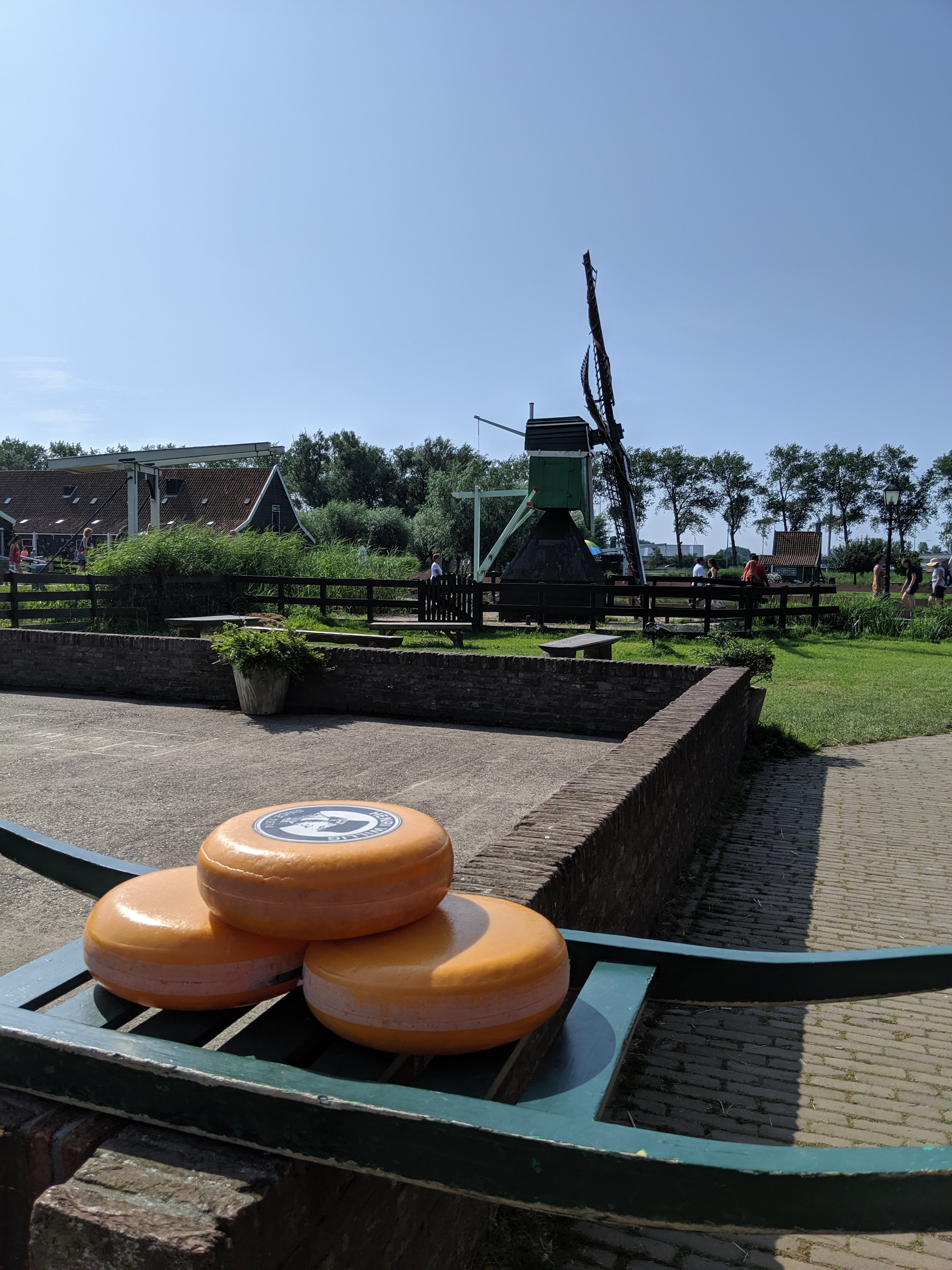 First stop is Zaanse Schans. It is a neighborhood in the Dutch town of Zaandam, near Amsterdam. Historic windmills and distinctive green wooden houses were relocated here to recreate the look of an 18th/19th century village. There are houses that showcase different aspects of Dutch life from cocoa to cheese making.