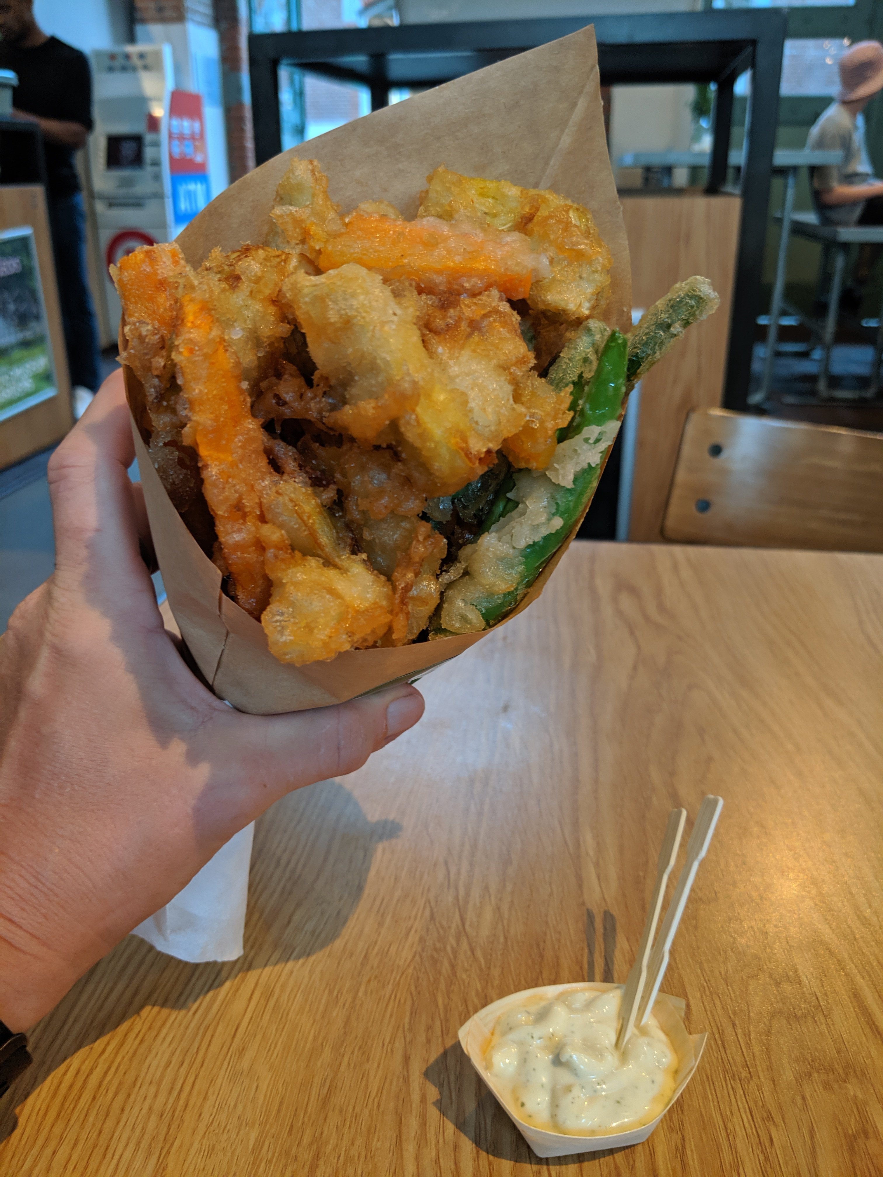 I bought fried vegetables. Green beans, carrots, and artichokes are lightly battered and fried. Very good.