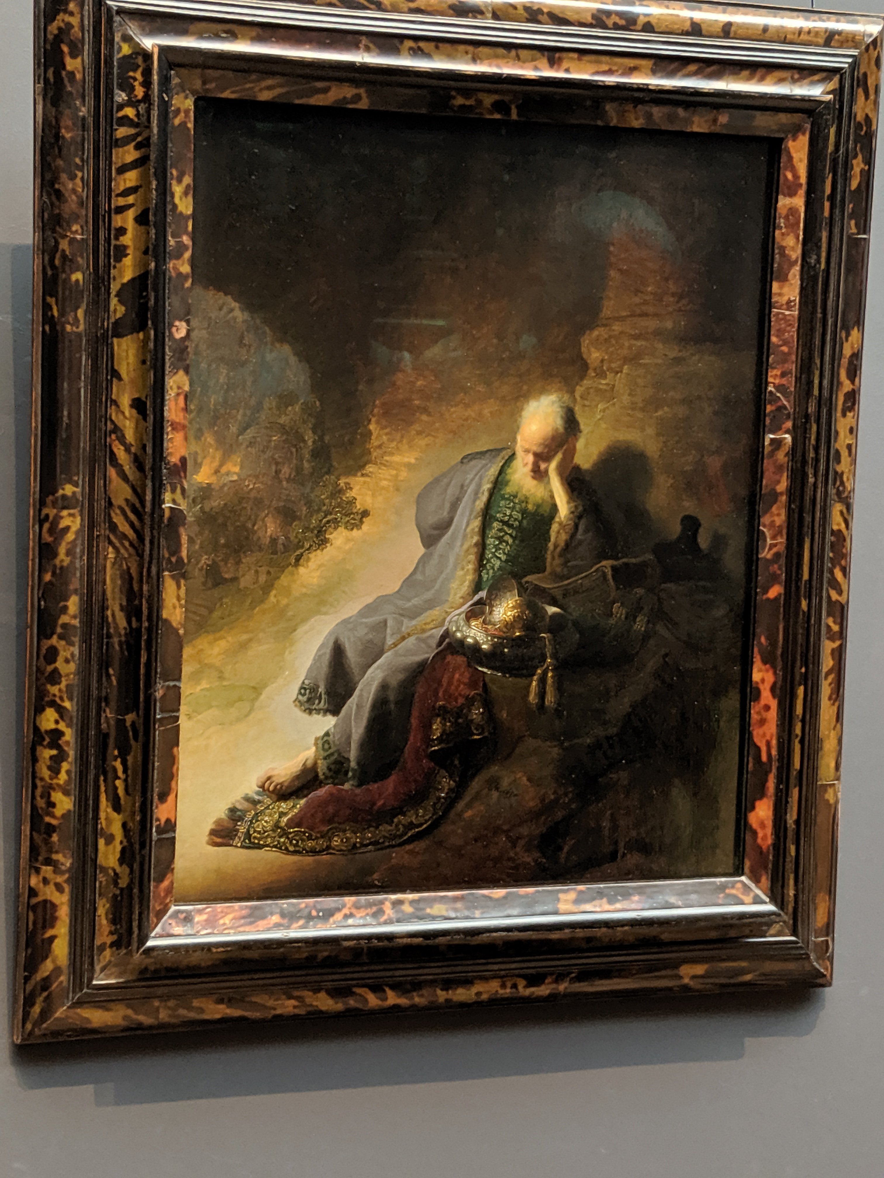 Many paintings including those from Rembrandt. This painting shows the good from Jerusalem burning in the muted background.