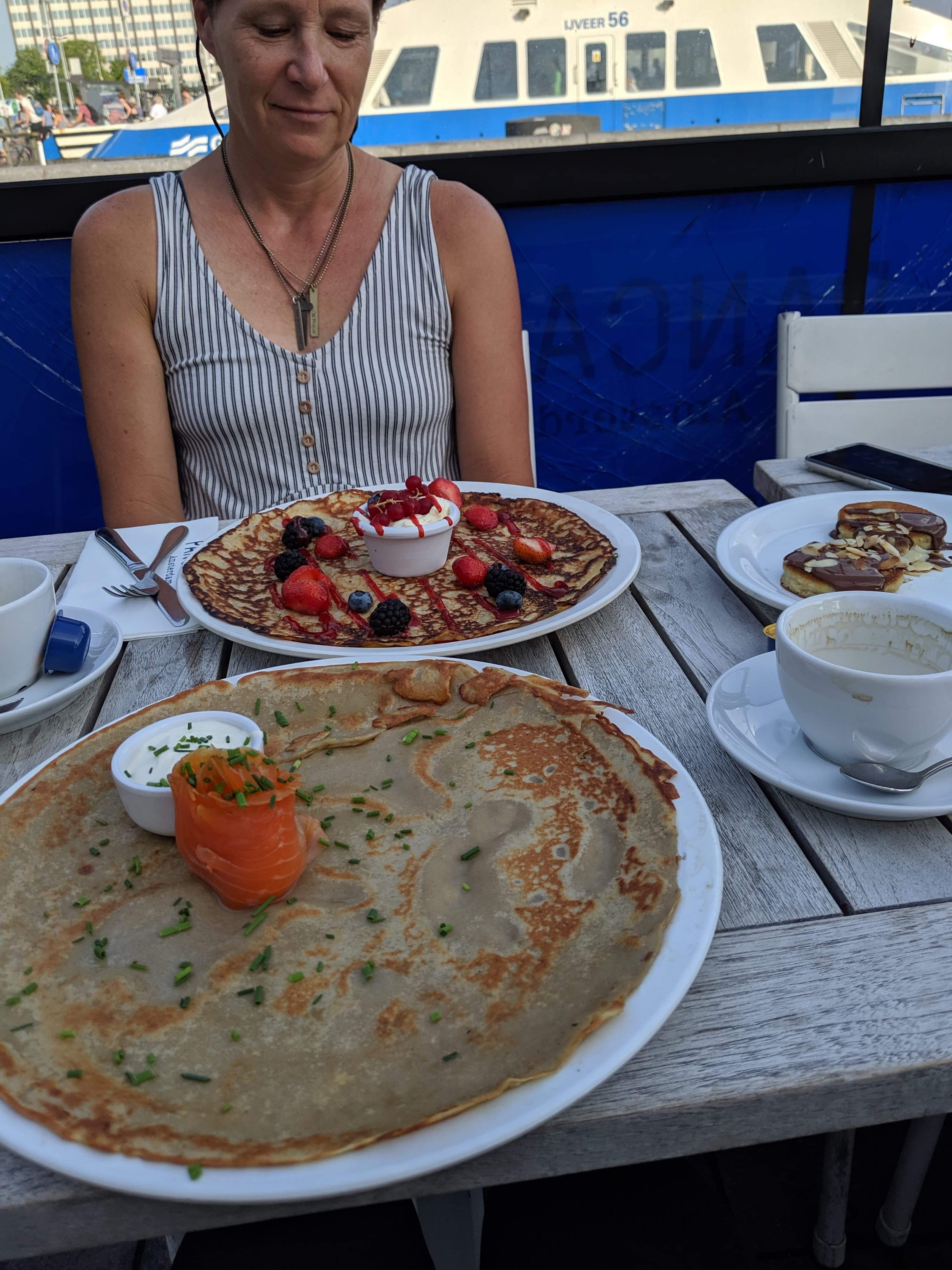 Next on the agenda was food but it was a long walk to Amsterdam Centraal where the mass transit is centered. Behind the station is Pancakes Amsterdam. They have Dutch and American pancakes and they were delicious. In the back of the picture is berry and in the front is a savory smoked salmon.
