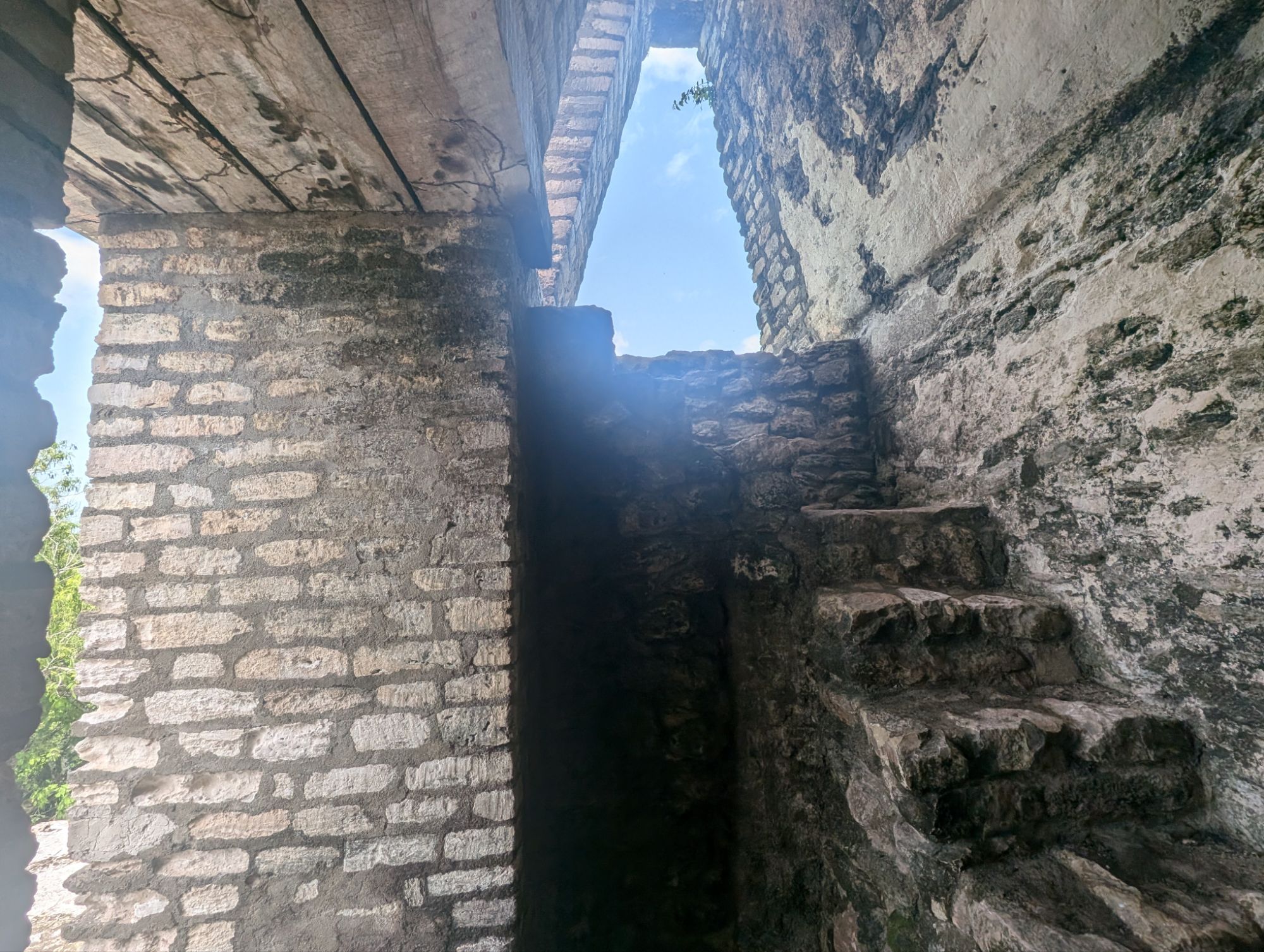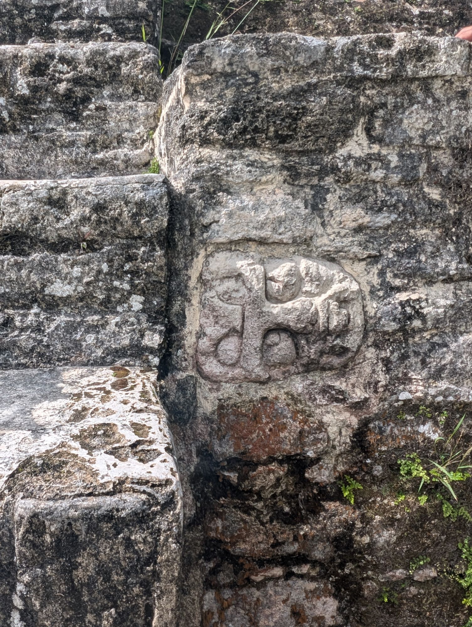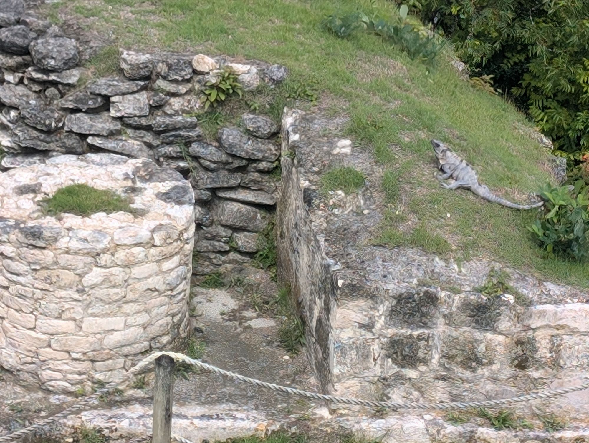 El Castillo is the tallest structure at the site. It is built from the bedrock of a hill with stairs leading to that bedrock layer.This is the bedrock layerChannels were created to move water.A sleeping areaFacing the WestShrine with columns. This is facing West and Guatemala is just in the distance.The use of columns dates to the later classic period around 900 ADSpiny back iguana not hunted for food While excavating on the side, they found a tomb and followed it back through.The size of the stones determines how old it is. Further back is much larger stones and the newer structures were built on top of the old ones with smaller stones. Using cement with the smaller stones means that the structures lasted for quite some time and can also not collapse.From the top of El Castillo facing North.