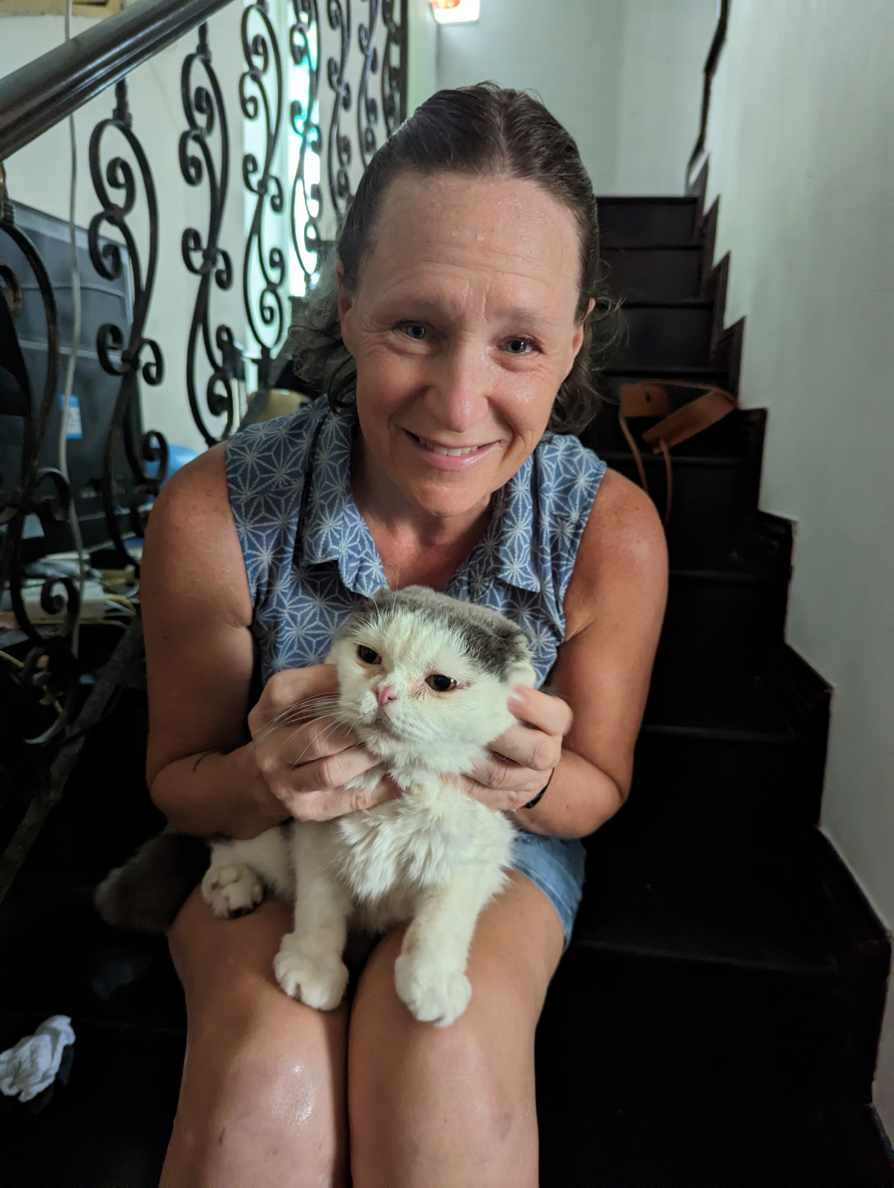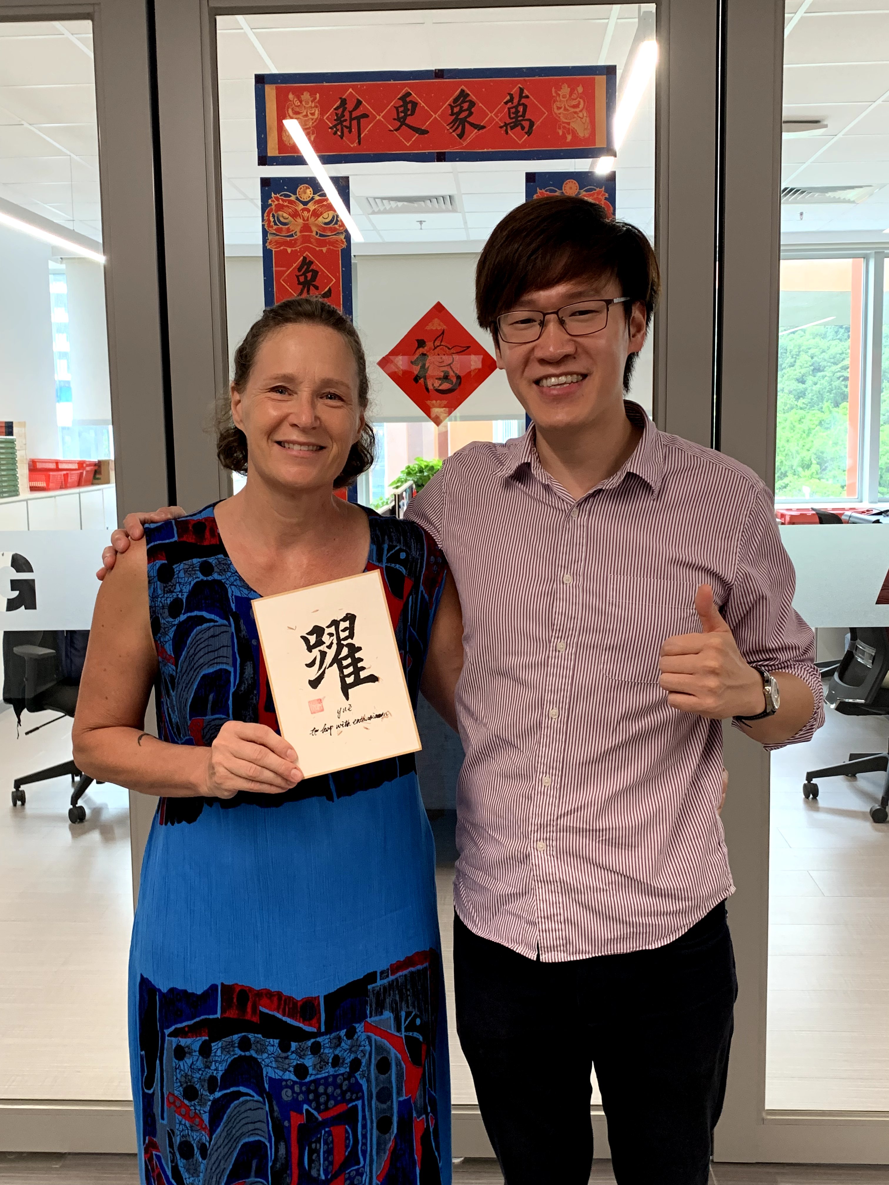The last bus ride to school. This crew always is the first to arrive to await the bus. Always a great to start the day!I received some great gifts. Vincent gave me a Chinese calligraphy saying that he painted: To leap with enthusiasm.I was fortunate to see some former students come back and visit for graduation.I will miss Bodie. He belongs to Dee Baker and often was in the school shop. What a support dog!Darcie!Zach and Alexis. I was fortunate to be around amazing educators.I’m going to miss my kitties. BaoBao……and TsoTso. They have been in a good home for months and look pretty happy.Last day, students did not want to go to the buses. They really love school.We all line up to wave goodbye….… And then we eat and have some drinks.Only a little of them more i received.I will miss this pool also. It was great therapy for my knee and such a beautiful view