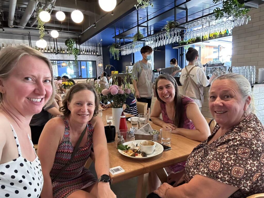 Heidi and Elaine have been here for so much in our lives They are great friends! We had some amazing times and were very close mahjong buddies.Claire on the far right was another travel buddy during the COVID times.Kathy my wine drinking buddy who was always there to lend an ear and have some fun.Melanie and I out for brunch.And another brunch.And at the top of the Canton Tower. We even did the death drop ride. So funny. When she screamed before they ever dropped us, the crowd thought it was hysterical!Bubble cars near the top of the Canton tower.Such an amazing view of the city.Some of the best of my dragonboat buddies. I would spend usually four hours a weekend paddling with them. So funny, kind, and thoughtful. I will miss all of them but especially these three.More of some of the best people to paddle with.Receiving flowers from my cross country team at the end of the year athletic ceremony.I met Lily the first year in Guangzhou. She likes to meet foreigners in a variety of places and have brought together some really fun people.I have amazing colleagues and school events are still great get togethers!The Macarena at the prom.At the end of the year party i took a photo with all the people who are still left from our cohort.At a tour of the new gym facilities that will be opening next year at the school. It will be an amazing addition and will miss Tamara and Joanna.