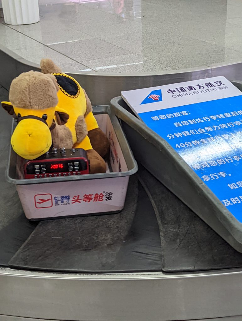 Not sure what the recording was saying, but this camel made the rounds on the luggage belt.