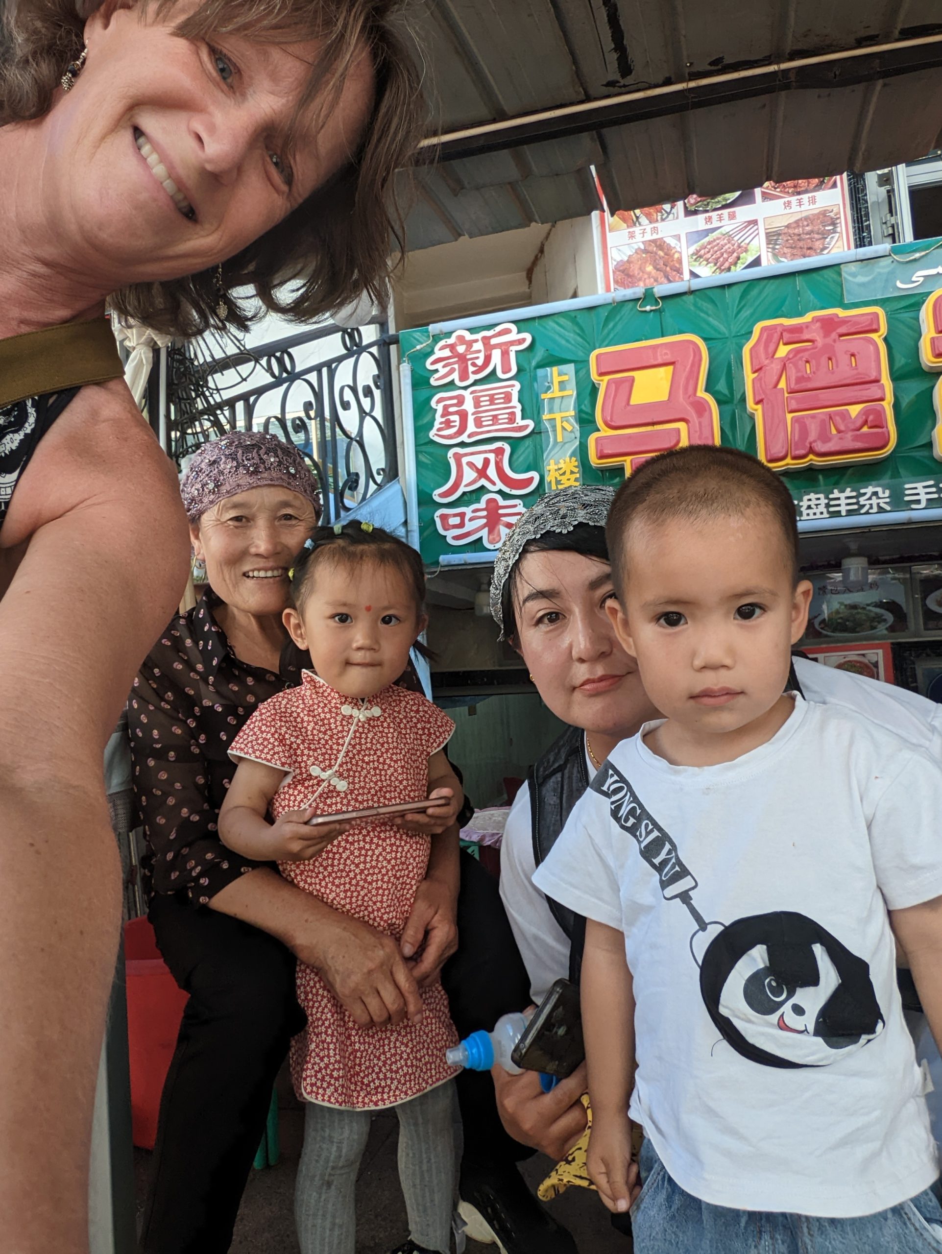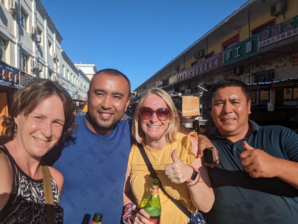After checking into the hotel in Burqin County, we had a moment to go to the night market. We walked around. The people were very friendly and wanted to take pictures with us.