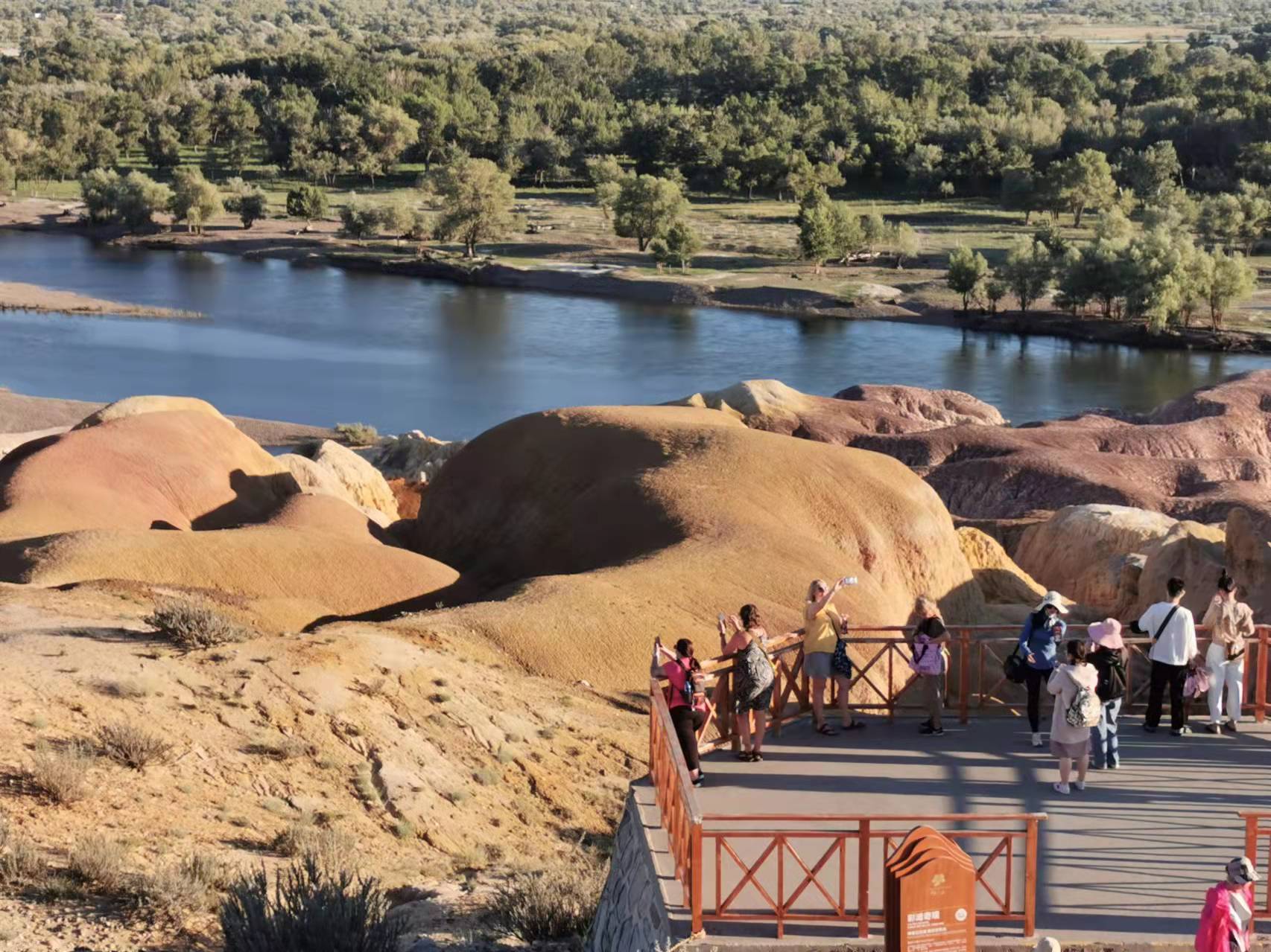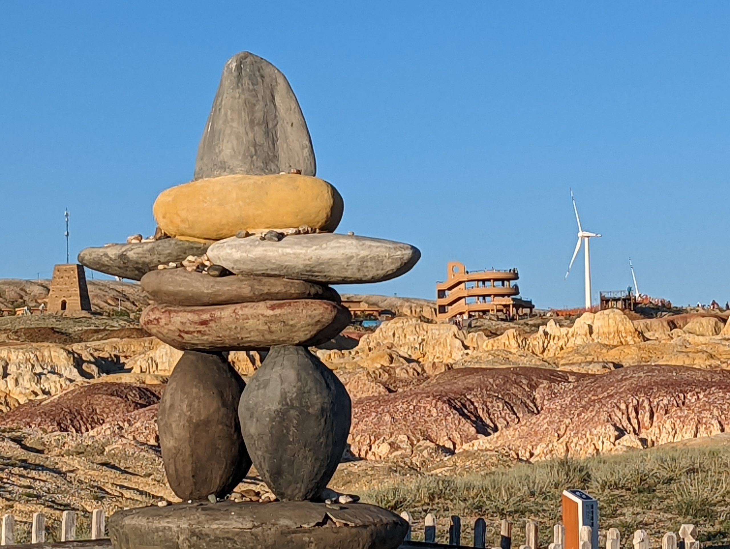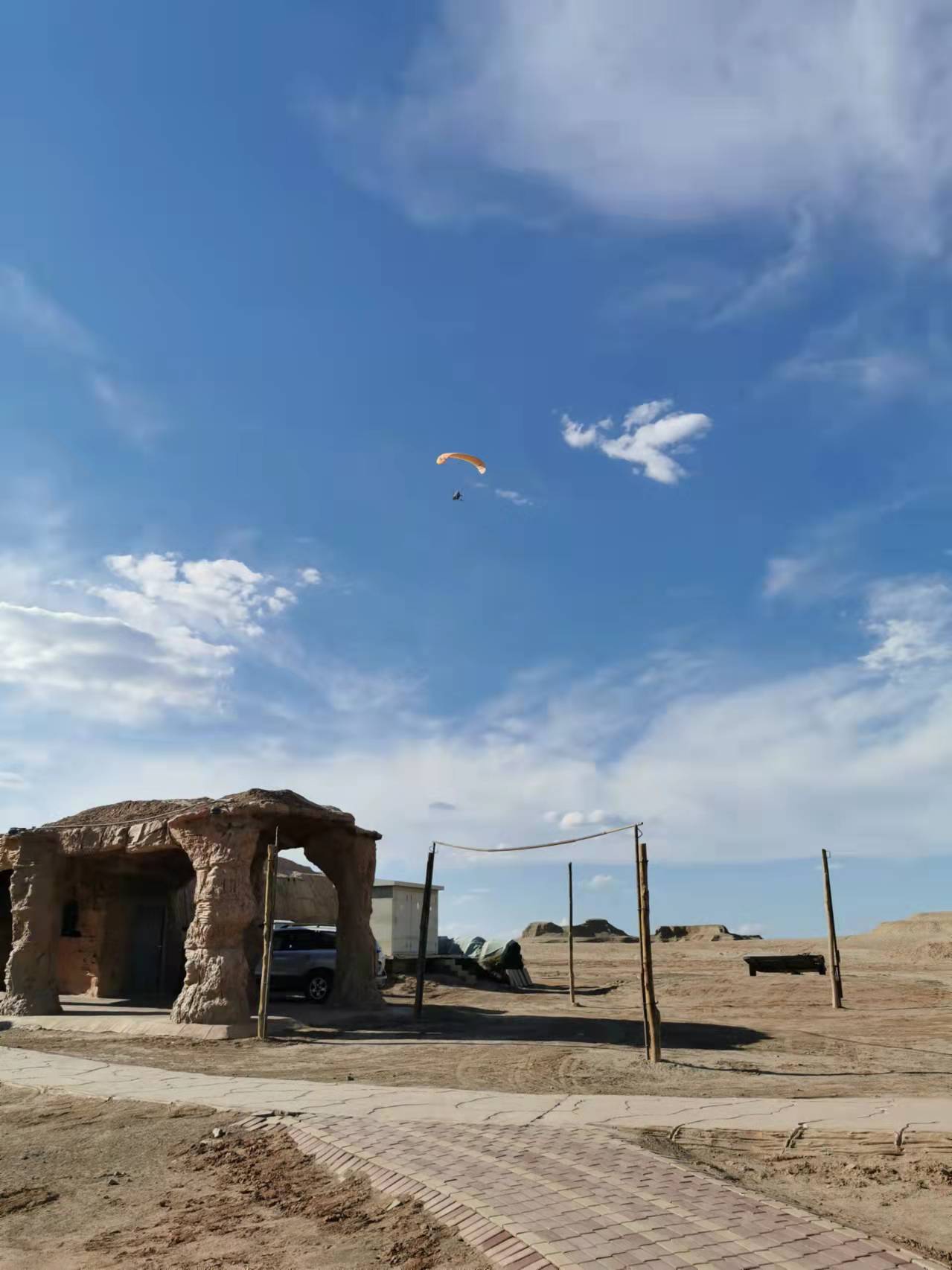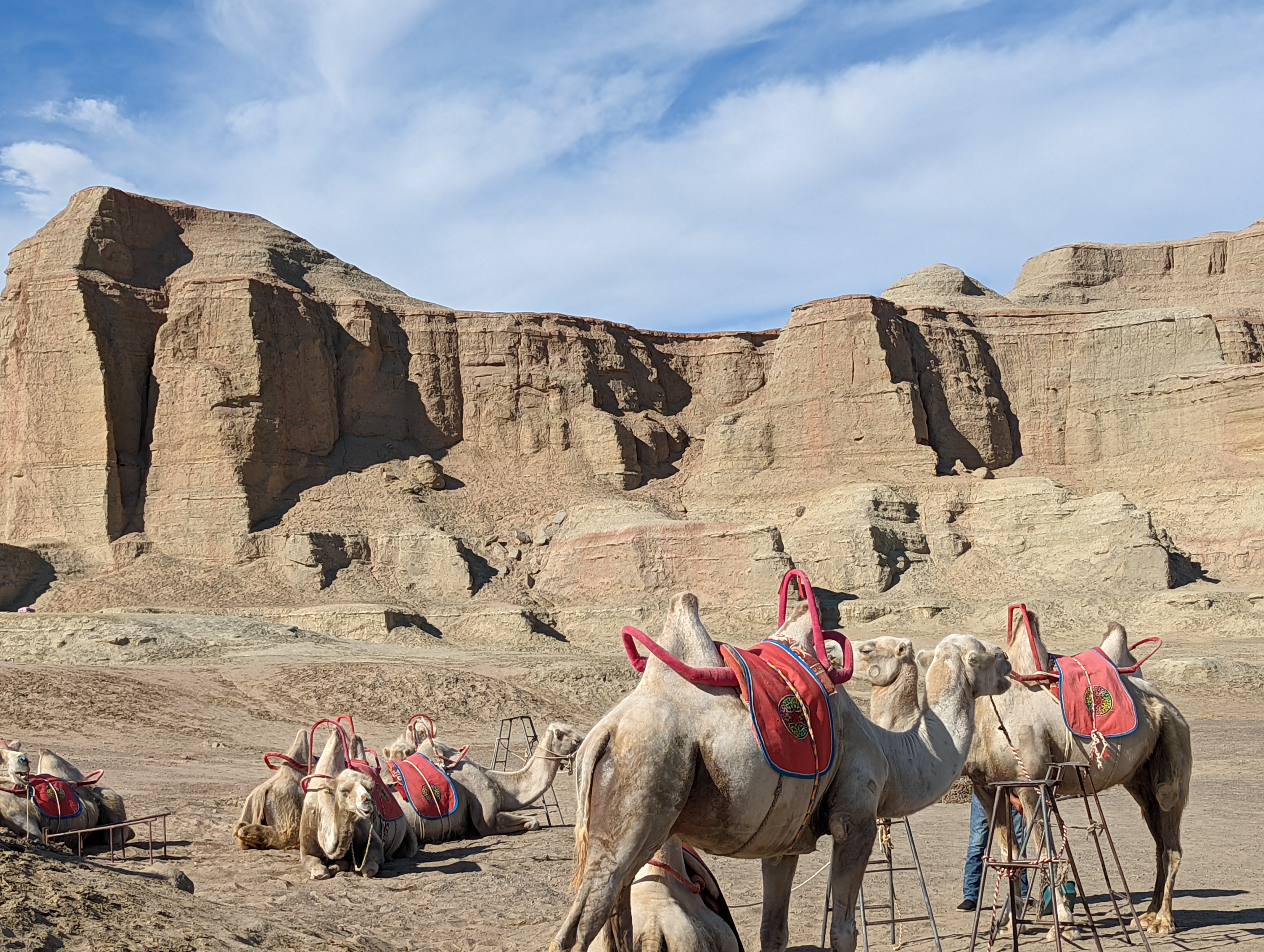 We passed by Karamy (which is Ulghur for oil), the famous oil city, and travelled along the Gurbantunggut Desert to the Urho Ghost City. It is also known as Wuerhe Wind City. It is a wind-eroded geological area. It gets its name because of the frequent howling winds. They are called Yadan Landforms. The shuttles are little trains. At the various stops you can take pictures, ride camels, or take a ride in a powered paraglide, which I did.