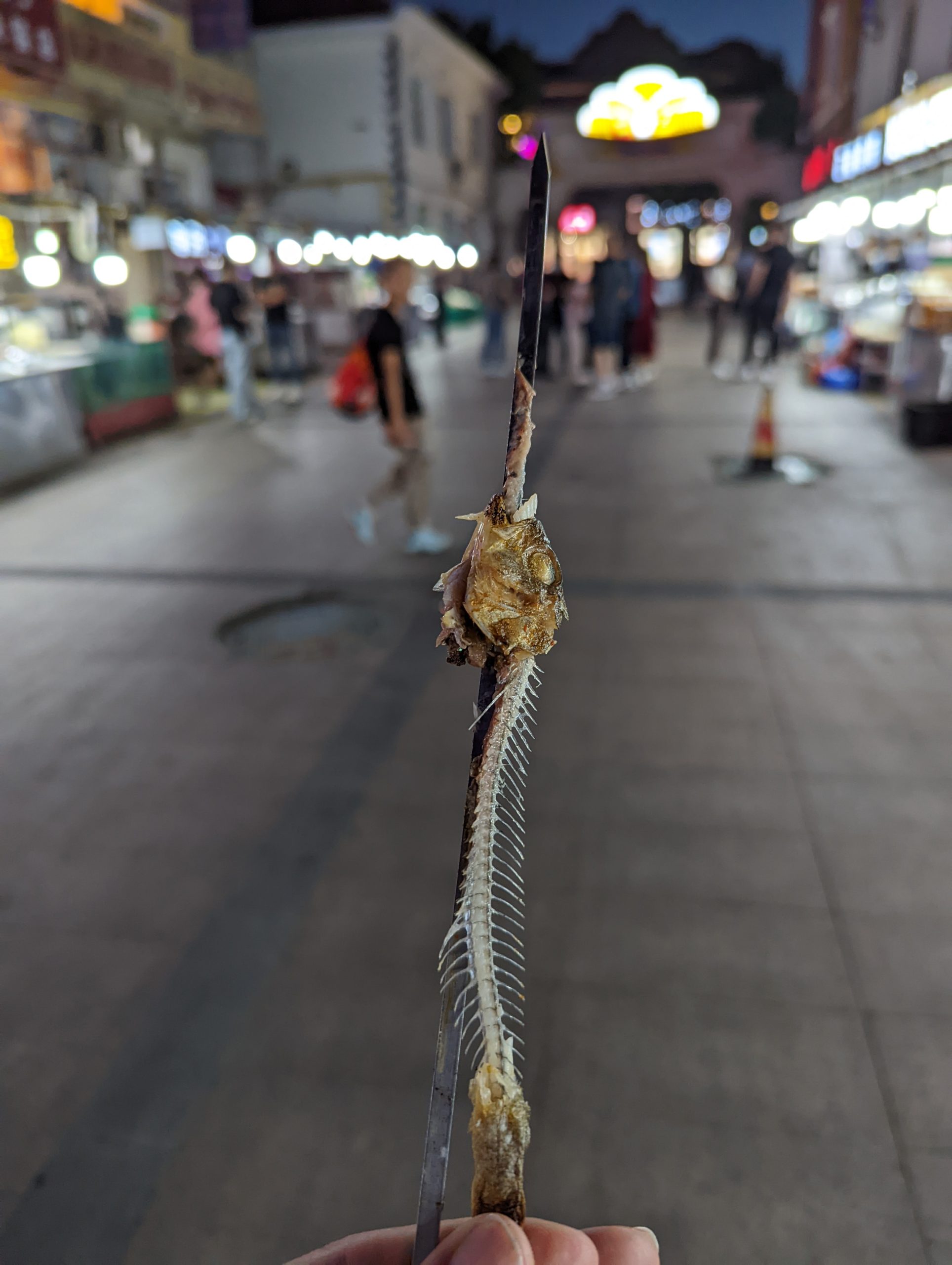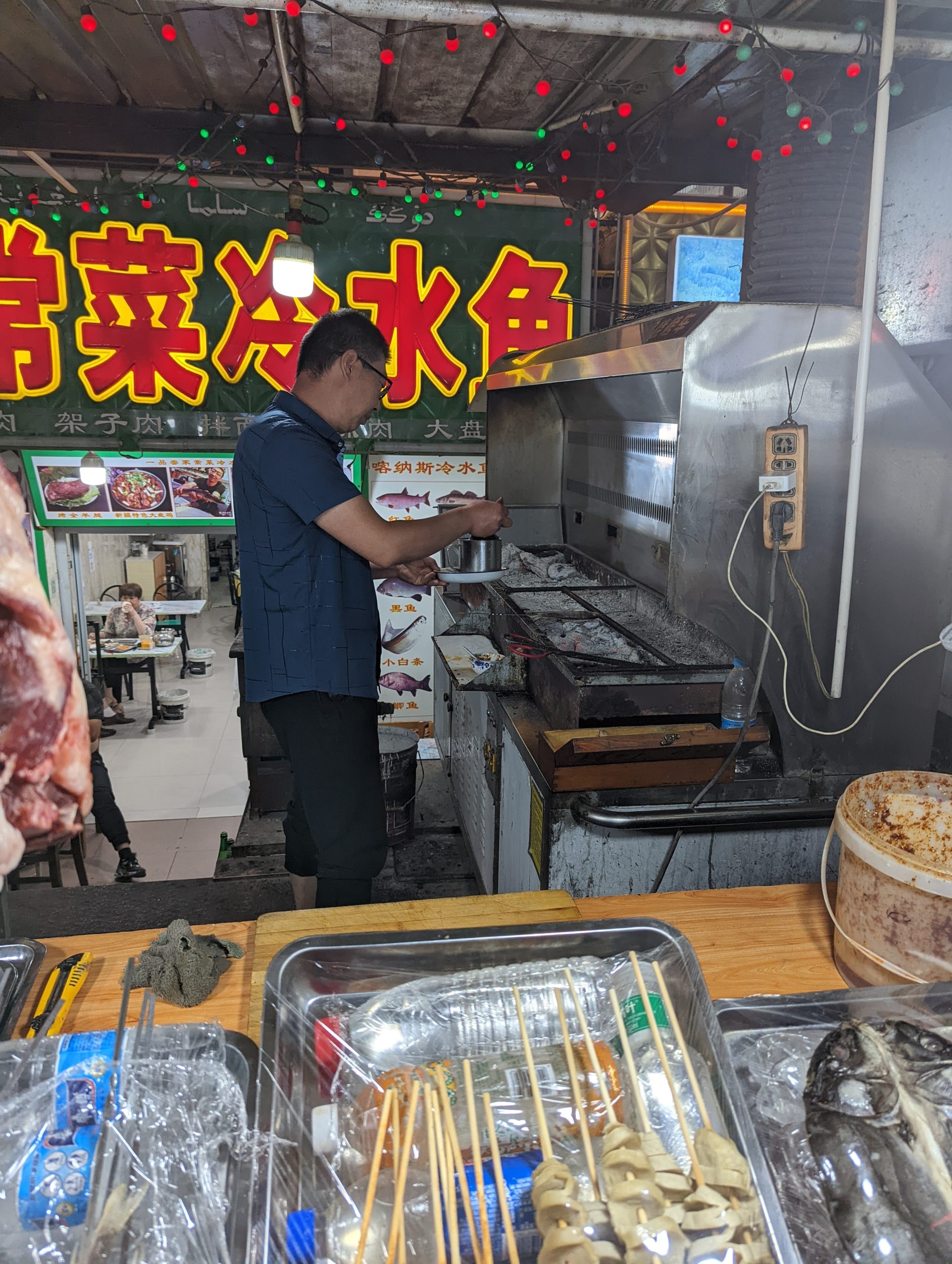 Back at the night market, we did get something to eat and Wusu beer to drink. Kebabs and nang bread are the specialty. I found fish on a stick.