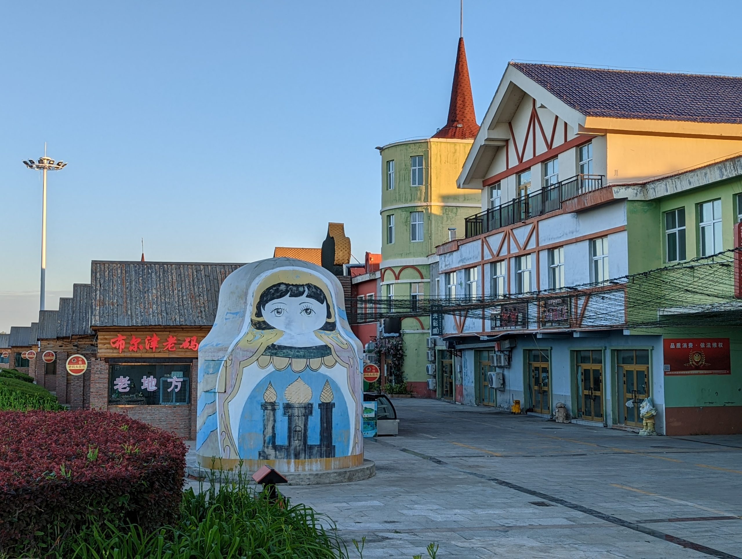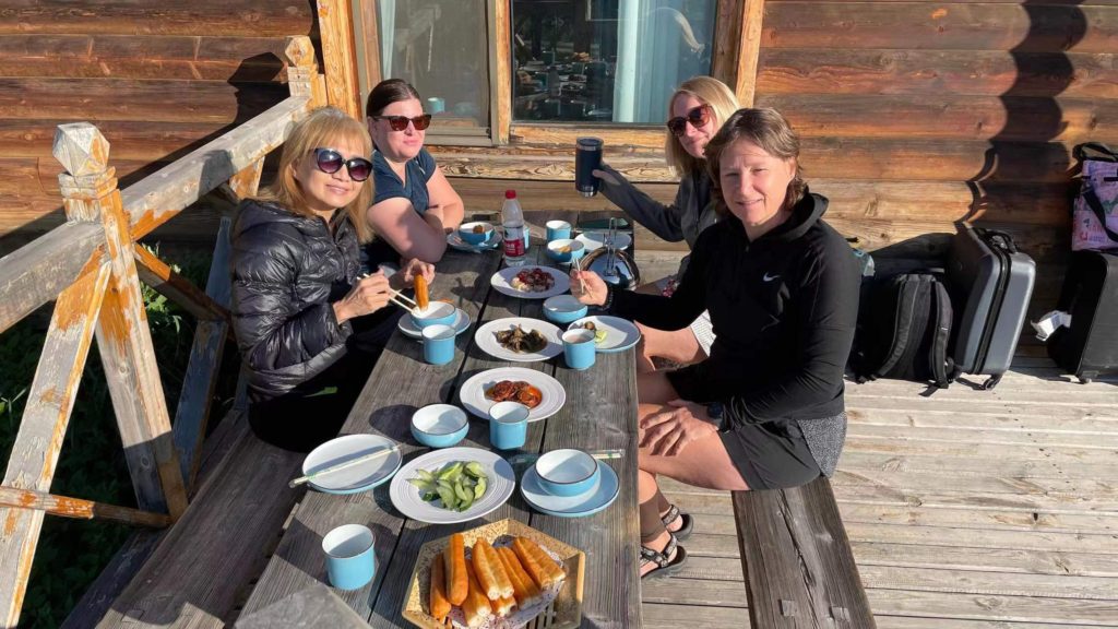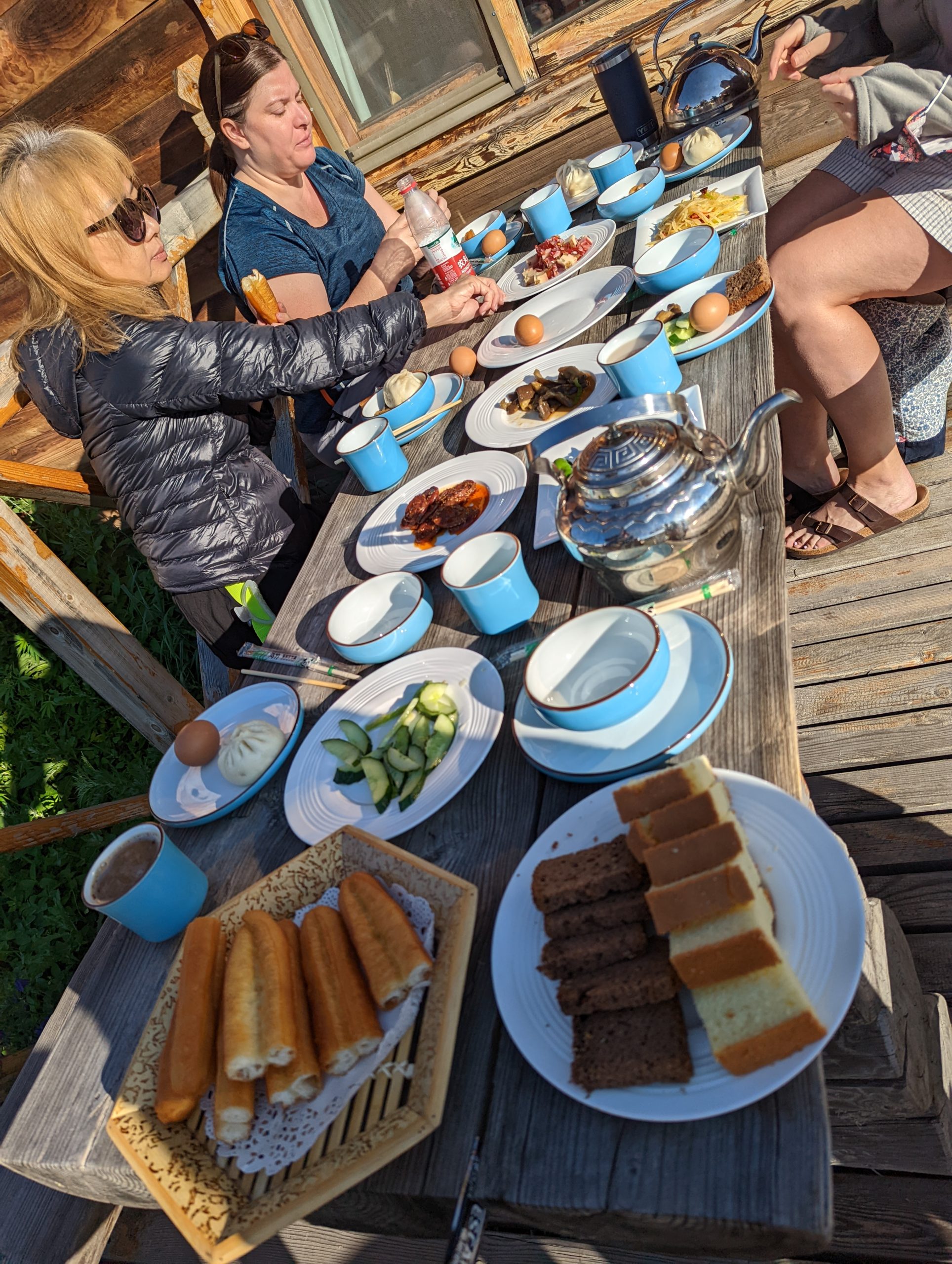 Breakfast had some wonderful small dishes of cucumbers, eggplant, eggs, Russian brown bread, baozi, and others. The air was still cool but the sun was warm.