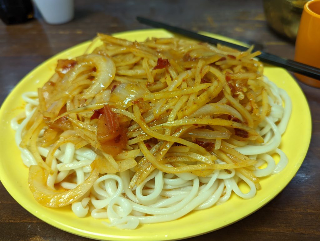 Homemade noodles (lamian) with spicy shredded potatoes on top. It was really good.