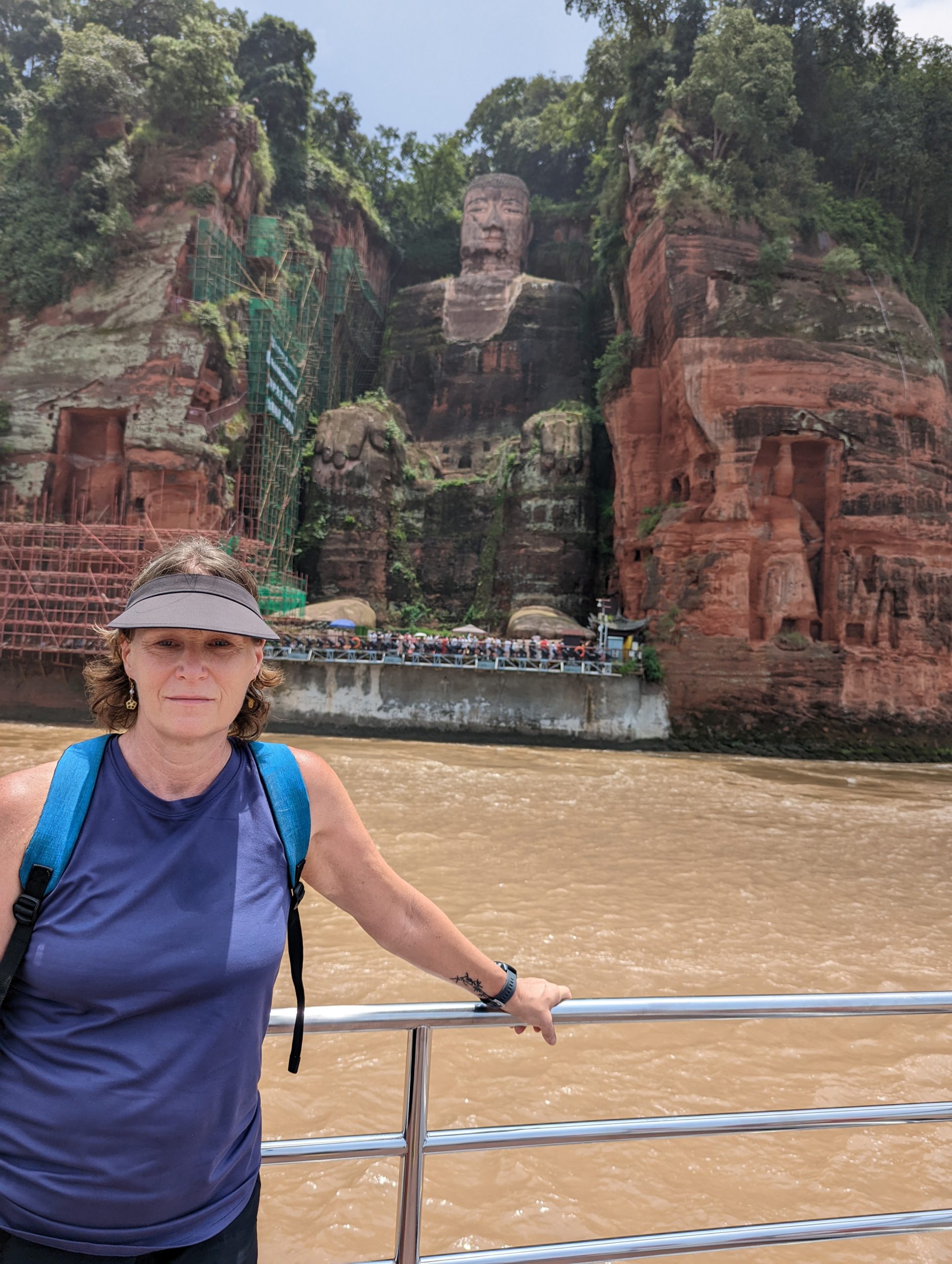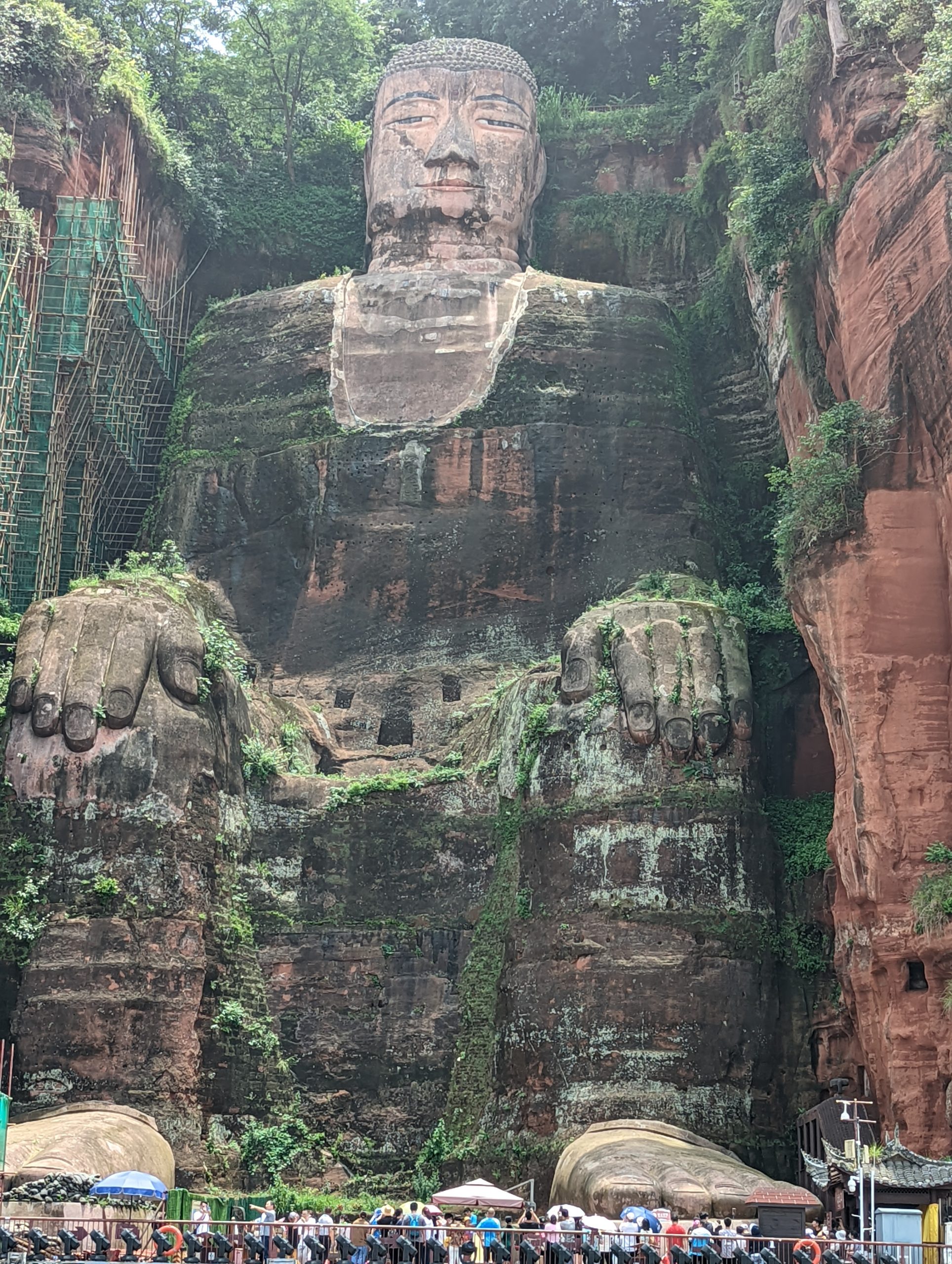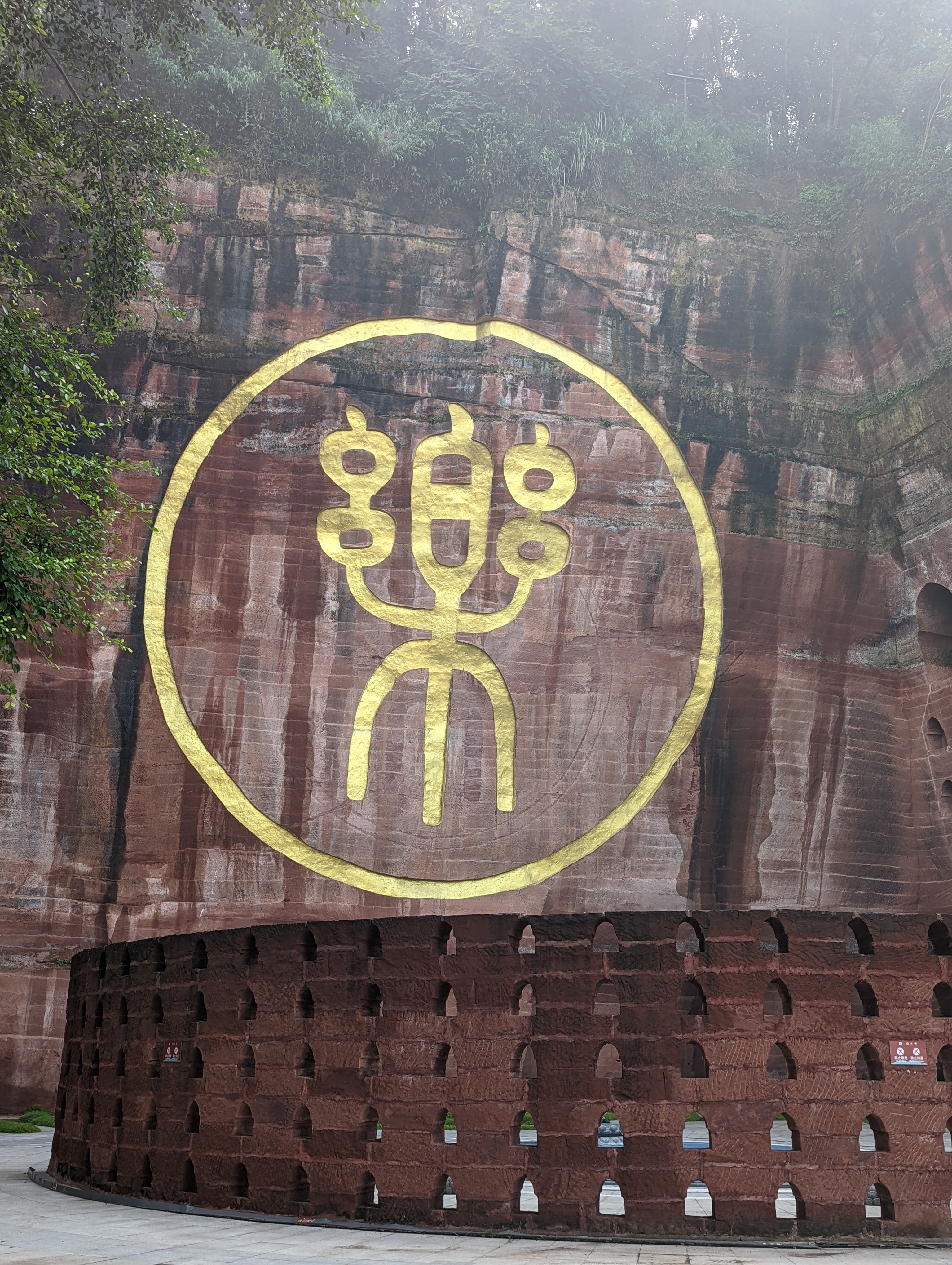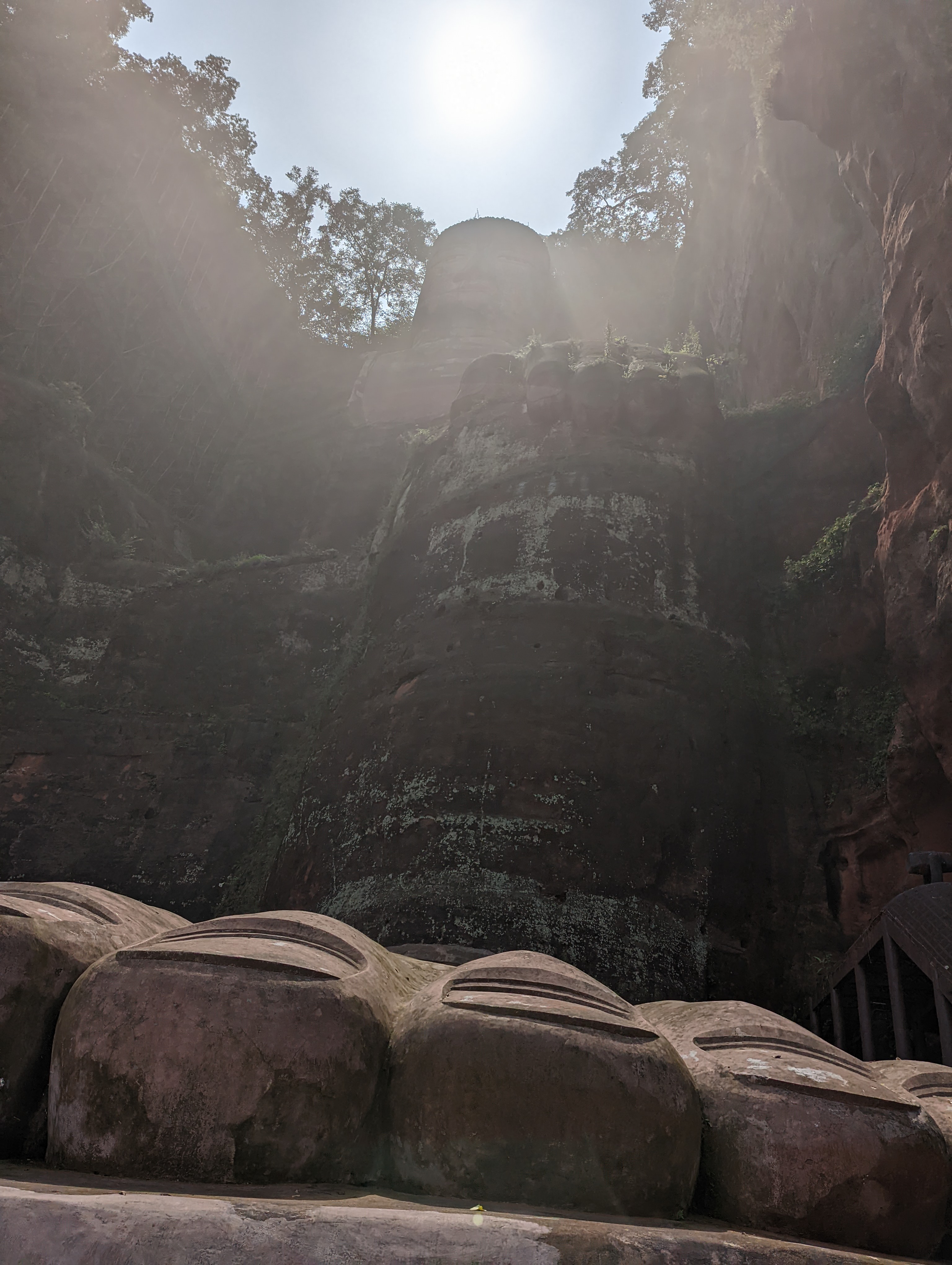 The entrance is beautiful.After climbing 36 steps you are at the top of the buddha head. It is suggested to not look back as you climb, only look forward.You can see the Buddha’s head on three sides before going down to the feet and back up again.The back side of the buddha head shows the detail of the hair. It is designed so that Easter runs off the back or side of the head and not in the face.You can see on the left side the zig zag stairs going from the head to the feet. On the upper right is okay of the path to return to the top After descending all the stairs, you can see the buddha but the light was not the best. We will be seeing it by boat as well. Check out the toenails!The pagoda at the top of the hill along the way to leaving the park.You can pay to burn a candle for prayer at the Temple.Back of the Temple.The Buddha’s taken from the top deck of a boat.Some of the Buddha’s were destroyed during the cultural revolution.In the bottom right is the tail of a dragon and right below the sun rays is the head of the dragon with water pouring out of its mouth. He is curled inside of the mountain.Symbol for happiness.Dragon fountain.Dancers at the entrance