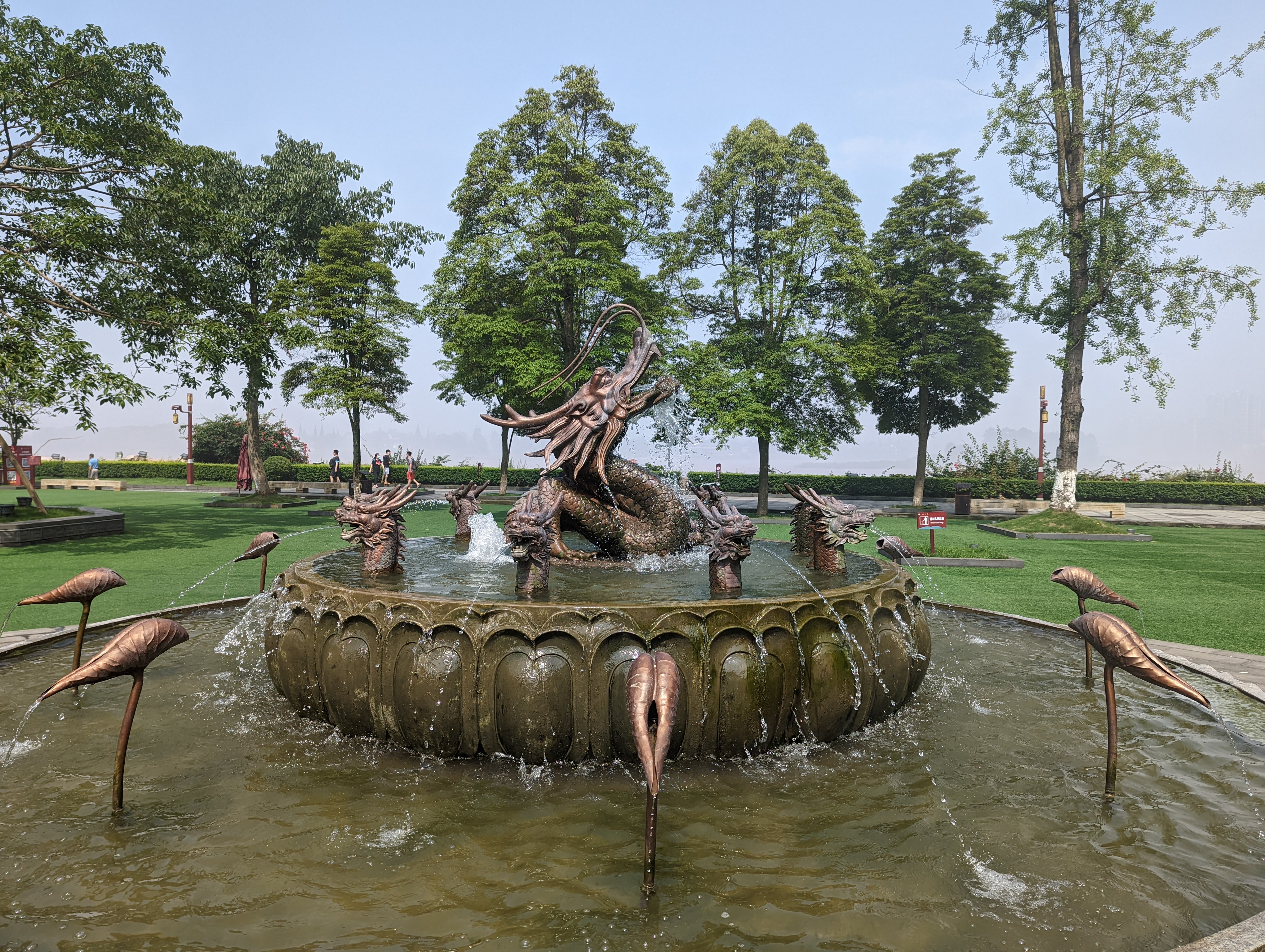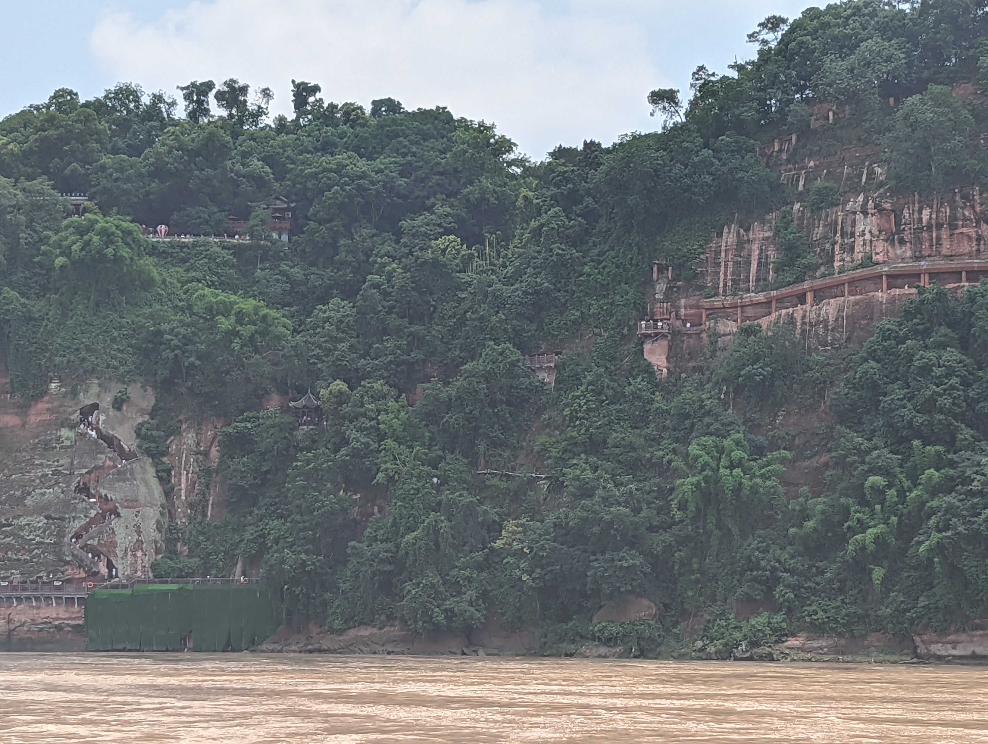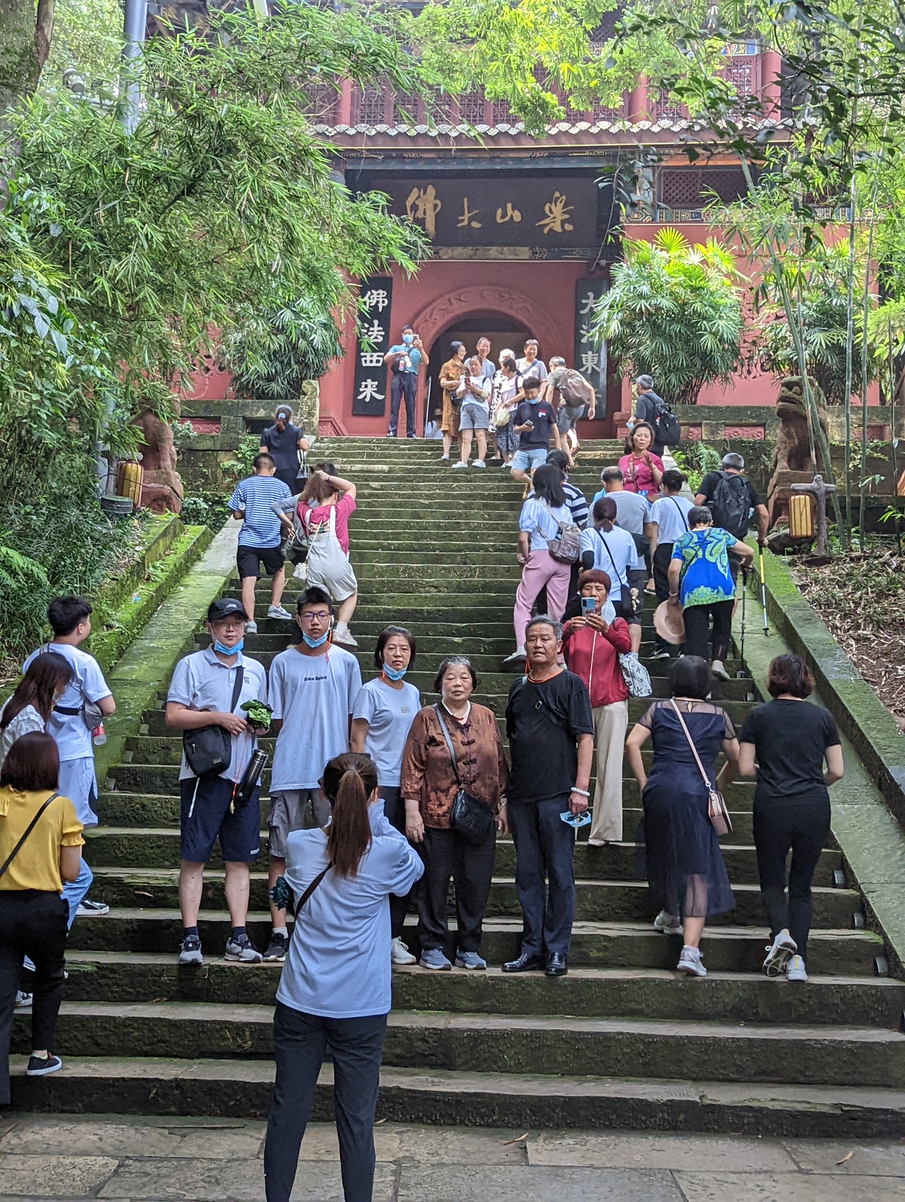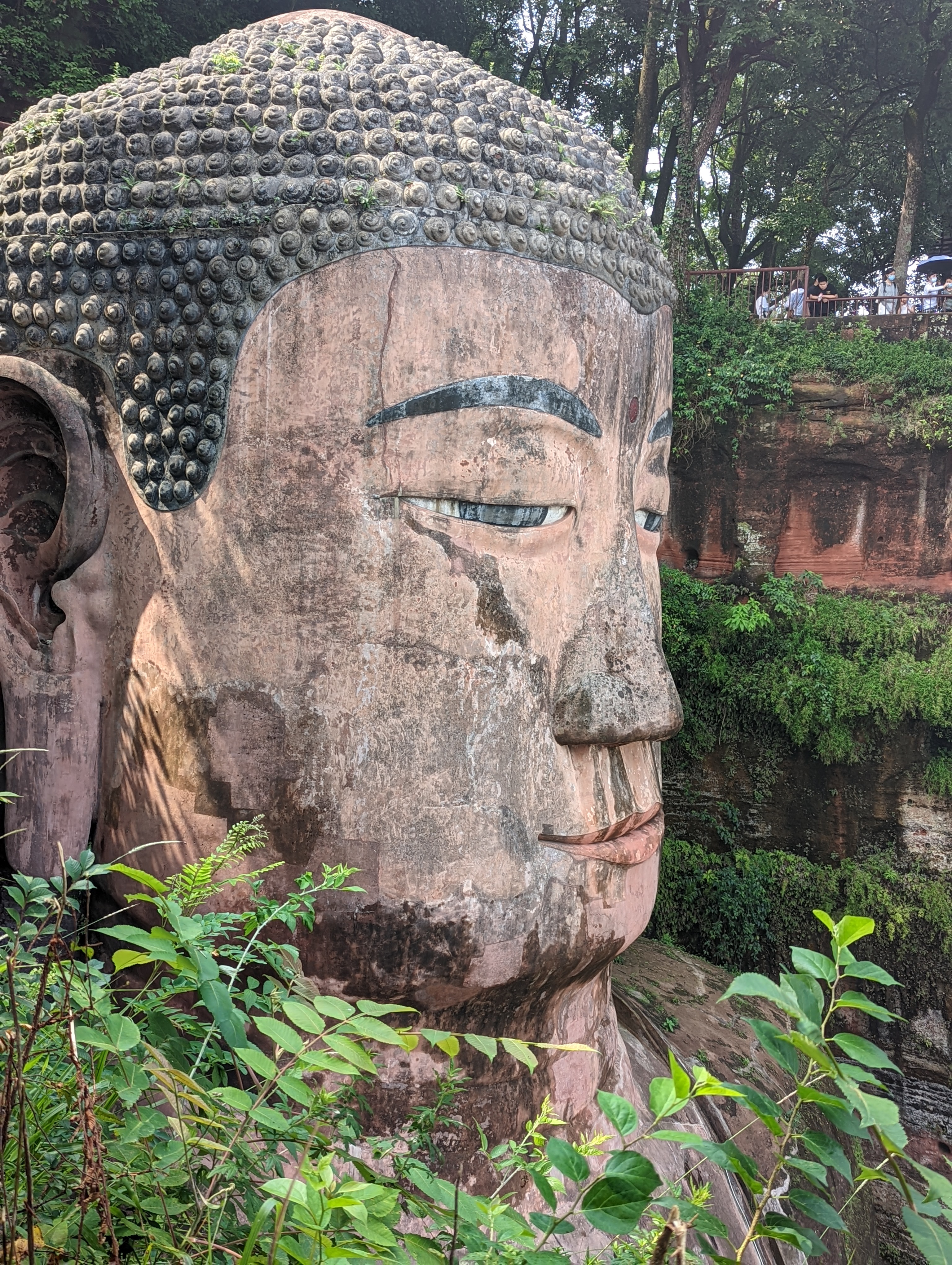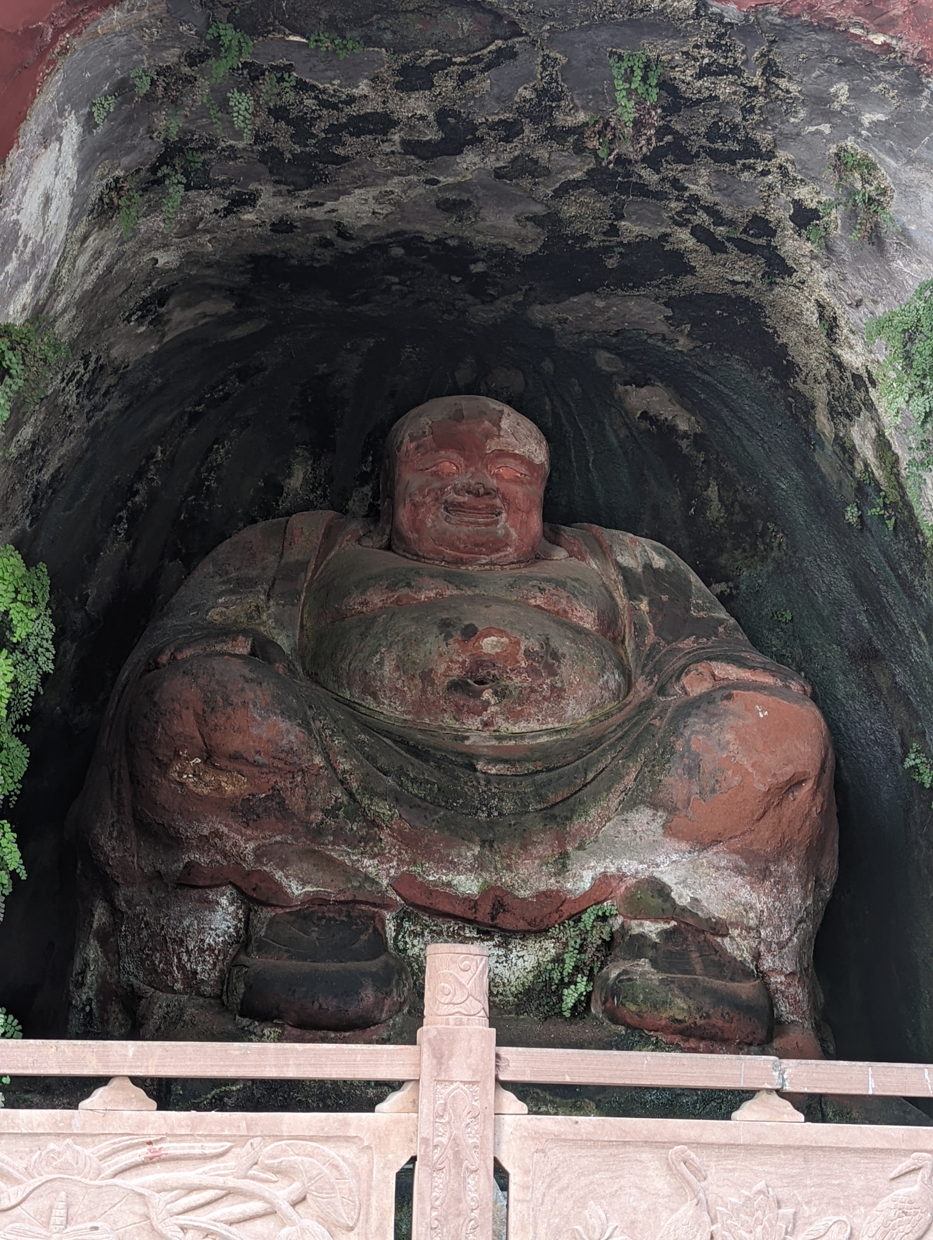 The entrance is beautiful.After climbing 36 steps you are at the top of the buddha head. It is suggested to not look back as you climb, only look forward.You can see the Buddha’s head on three sides before going down to the feet and back up again.The back side of the buddha head shows the detail of the hair. It is designed so that Easter runs off the back or side of the head and not in the face.You can see on the left side the zig zag stairs going from the head to the feet. On the upper right is okay of the path to return to the top After descending all the stairs, you can see the buddha but the light was not the best. We will be seeing it by boat as well. Check out the toenails!The pagoda at the top of the hill along the way to leaving the park.You can pay to burn a candle for prayer at the Temple.Back of the Temple.The Buddha’s taken from the top deck of a boat.Some of the Buddha’s were destroyed during the cultural revolution.In the bottom right is the tail of a dragon and right below the sun rays is the head of the dragon with water pouring out of its mouth. He is curled inside of the mountain.Symbol for happiness.Dragon fountain.Dancers at the entrance