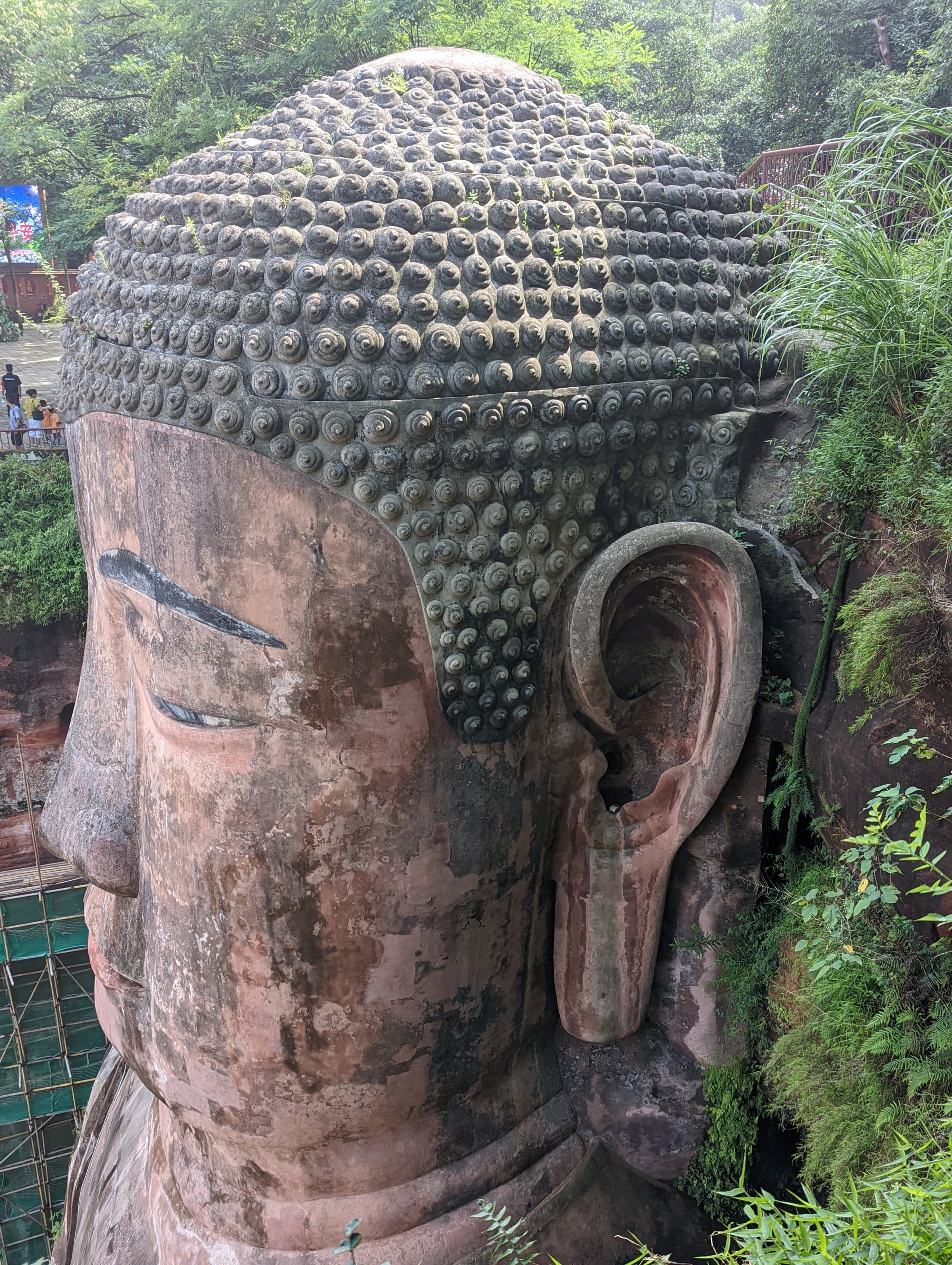 The Leshan Giant Buddha is 71-meters tall. It is a stone statue, built between 713 and 803 AD. It is carved out of the cliff face of red sandstones found at the confluence of the Min River and Dadu River in the southern Sichuan province.