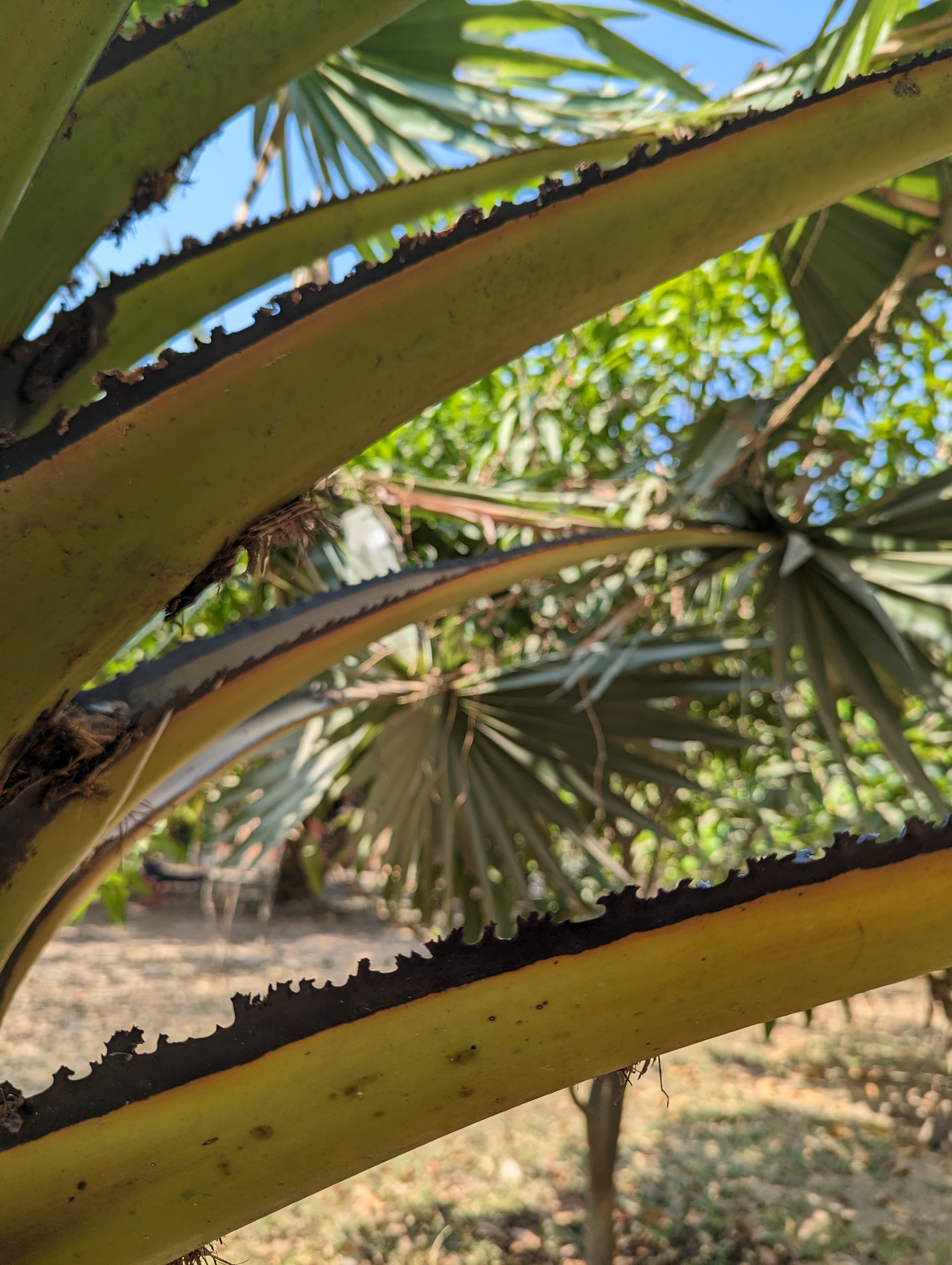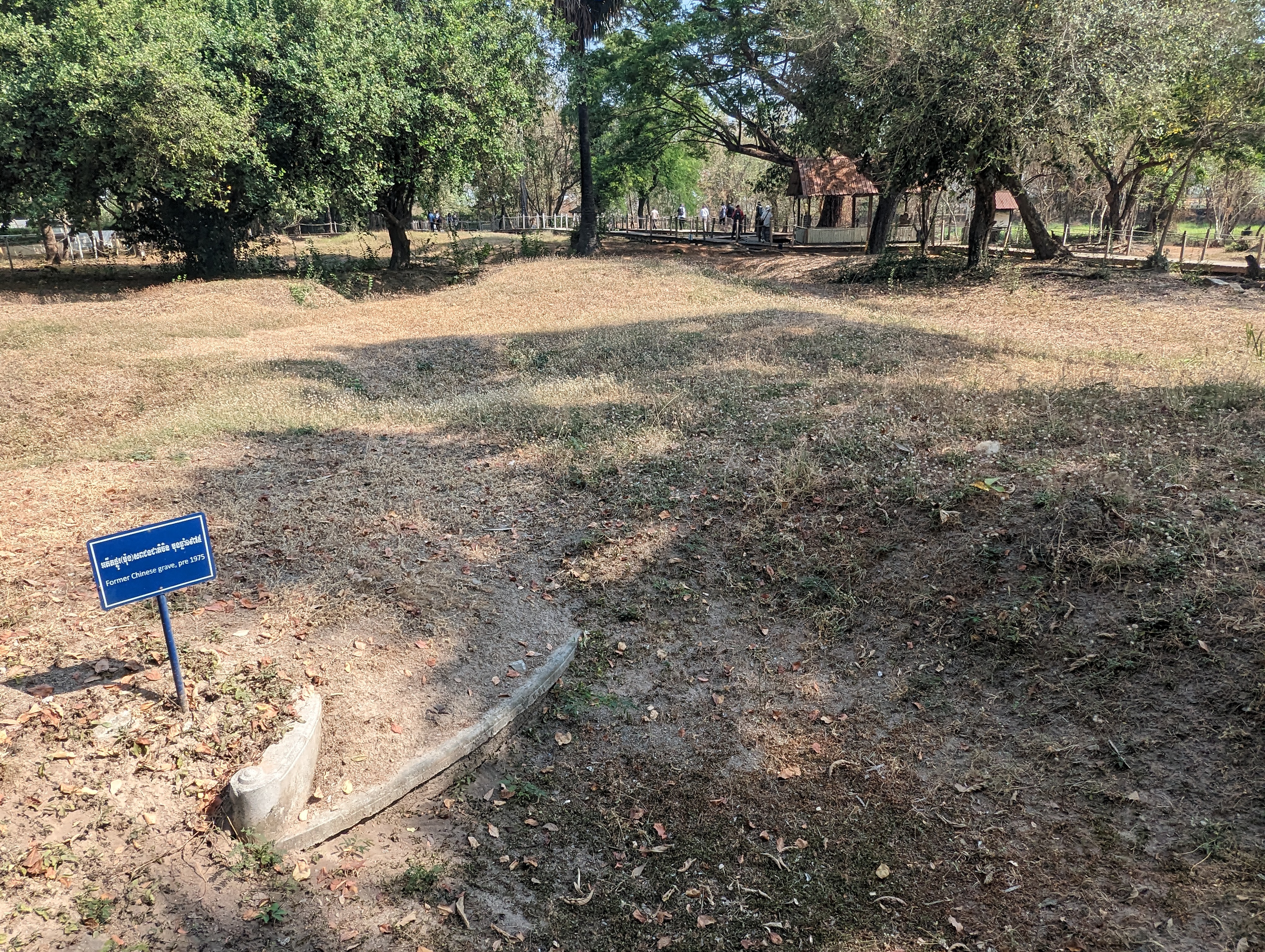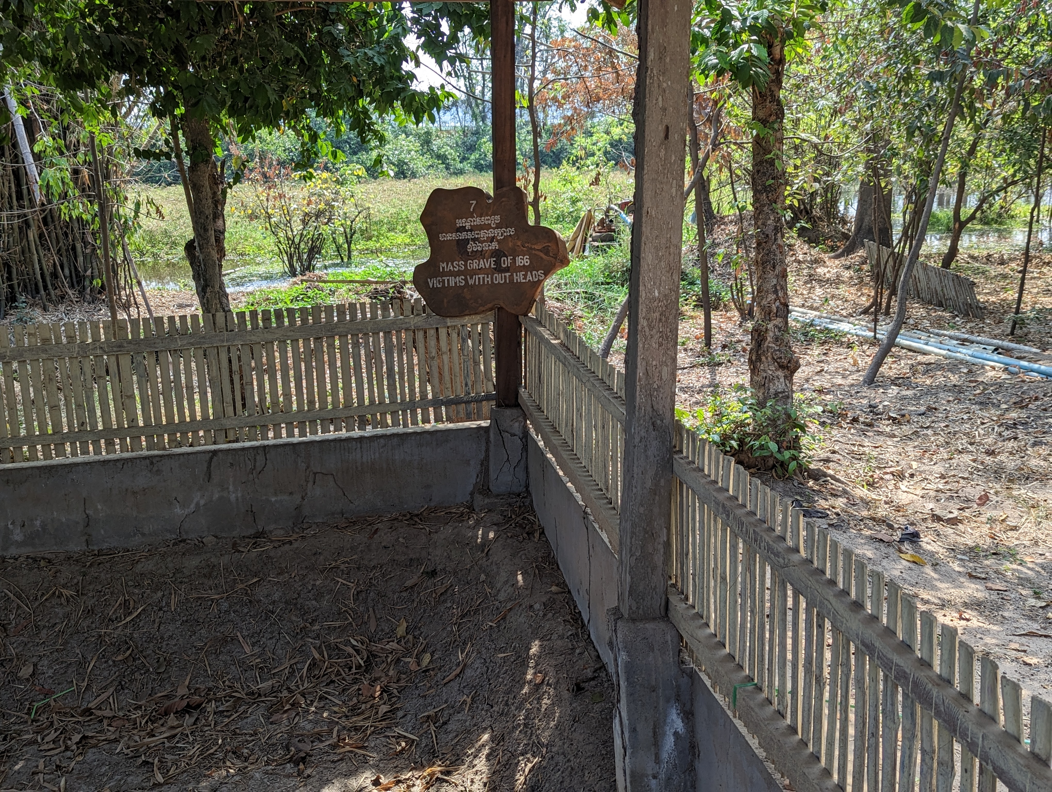 Memorial stupa in the background.In the site are Cambodian palms. The edges of the young leaf have serrations. These were used to cut people’s throats. We were able to touch them and it felt like a metal serrated saw blade.The location was originally a Chinese grave yard. Many markers still exist.Pol Pot’s paranoia meant that even his own soldiers could be executed for nothing more than suspicion. Here they were killed and their heads removed from the bodies.Bones still evident in some areas. Not all bodies were excavated. Many felt that their souls should be left in peace with no further excavation.