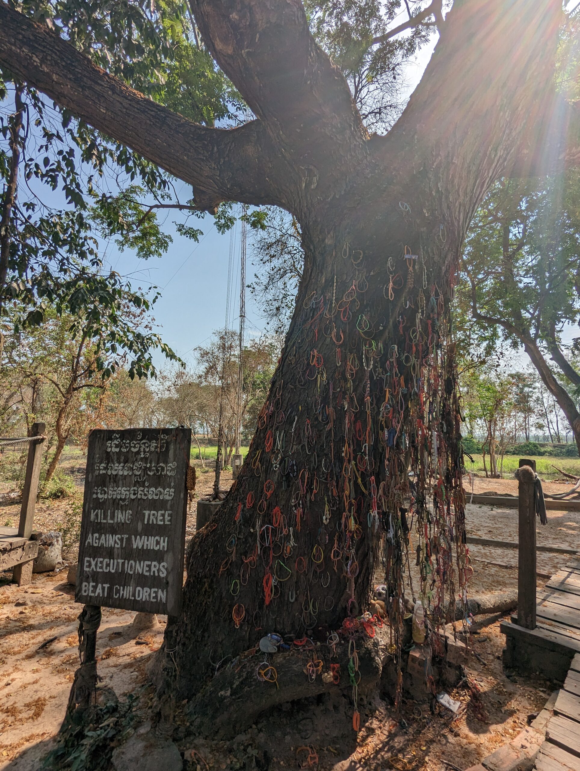 The execution tree at Choeung Ek was a site where the Khmer Rouge executed children. The tree was a large Chankiri tree, and the Khmer Rouge would use it to bash the heads of children against the trunk of the tree. The children were often killed in front of their parents, and the parents were forced to watch as their children were killed. The execution tree was a symbol of the brutality of the Khmer Rouge, and it is a reminder of the horrors that the Khmer Rouge inflicted on the people of Cambodia.