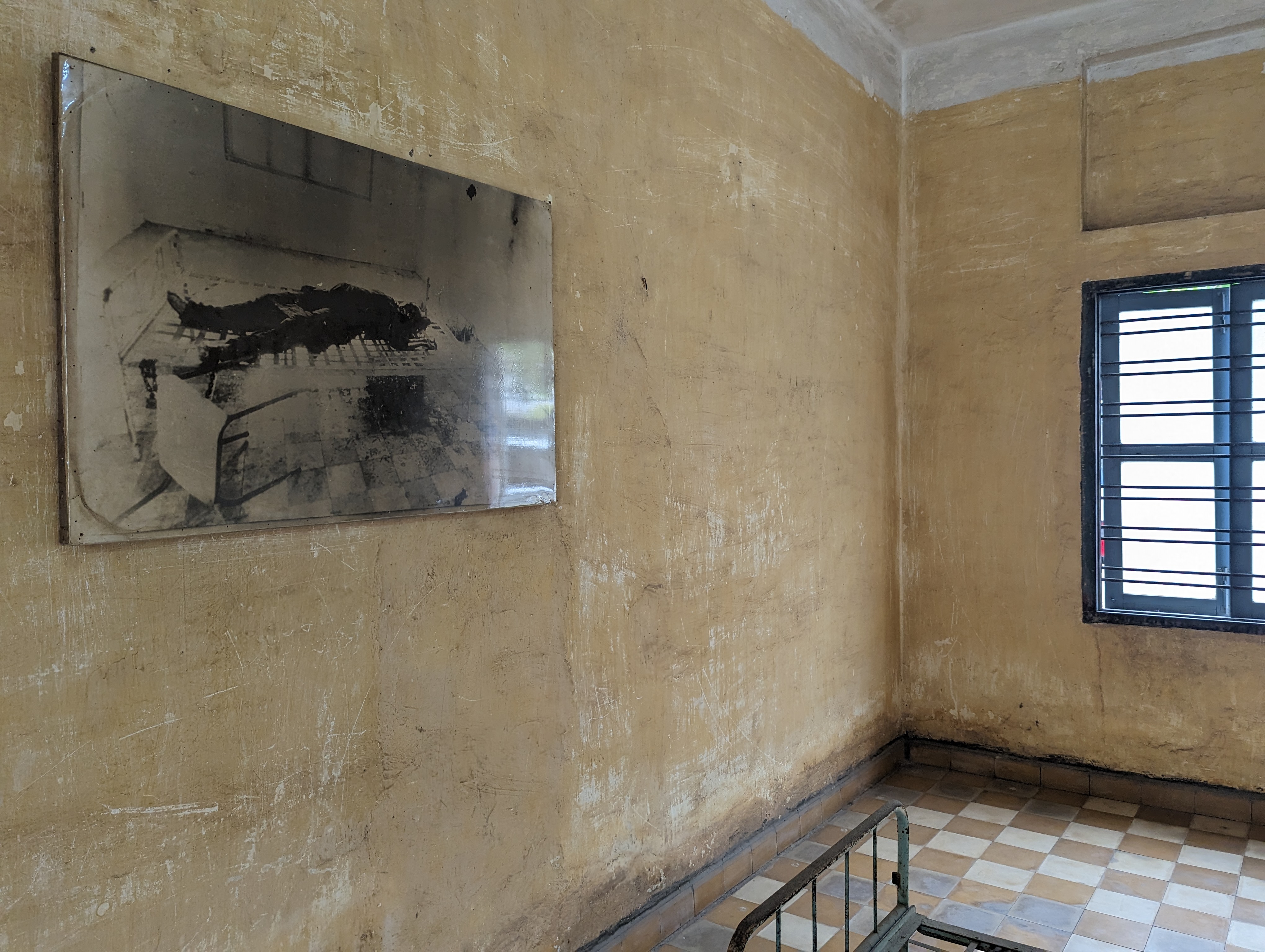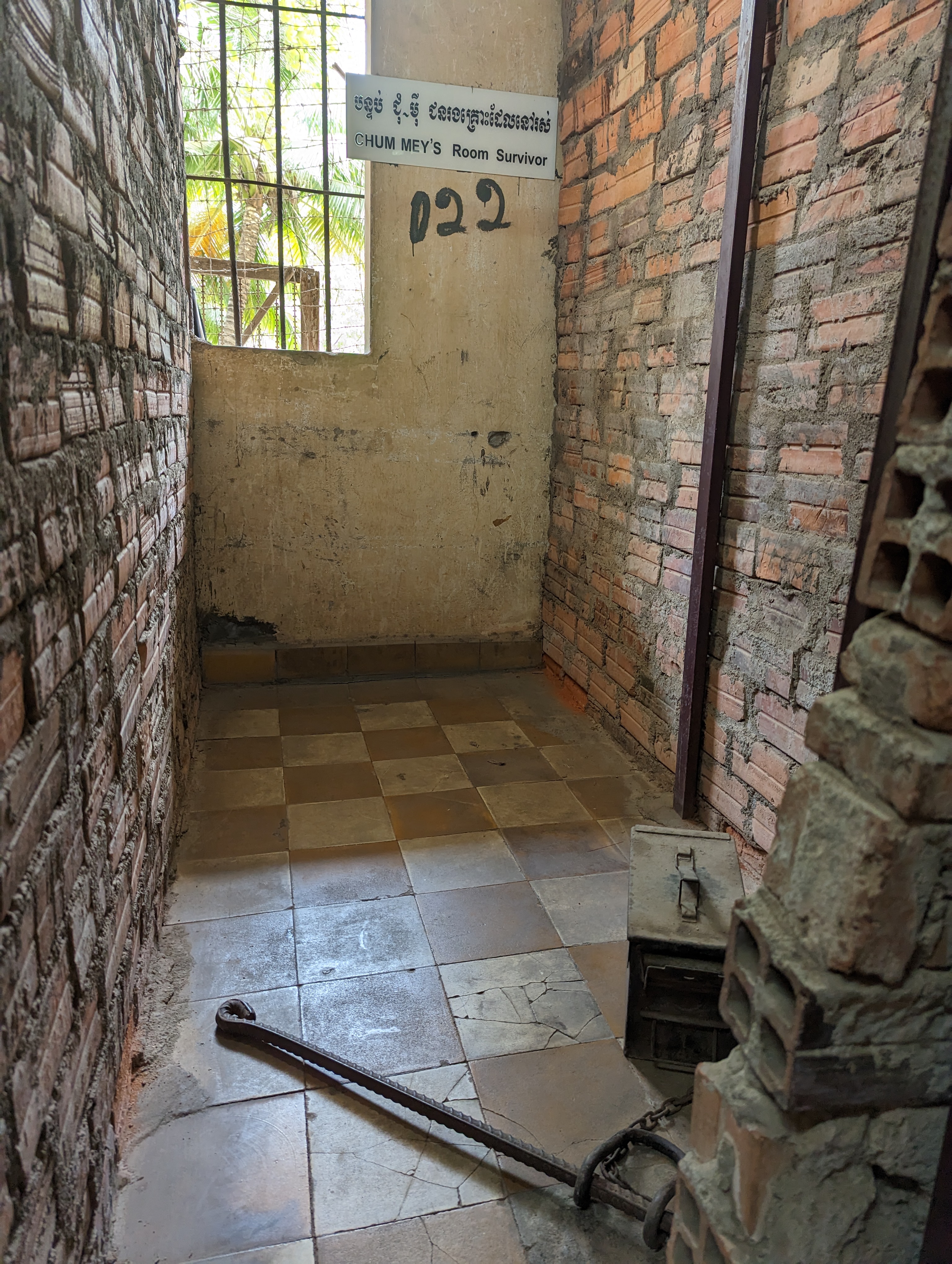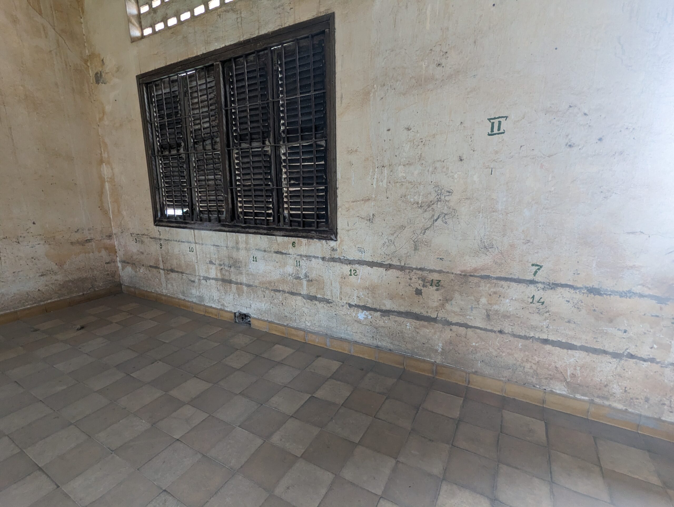 All the photographs were on display. I kept thinking that these children would normally be in school. The sheer inhumanity is unfathomable.Other prisoners were not as important and chained in a one meter by two meter cell. The box was used as a toilet. The tiles you normally see in a school made this all the more striking.This room held roughly 50 people.They were organized in such a manner.