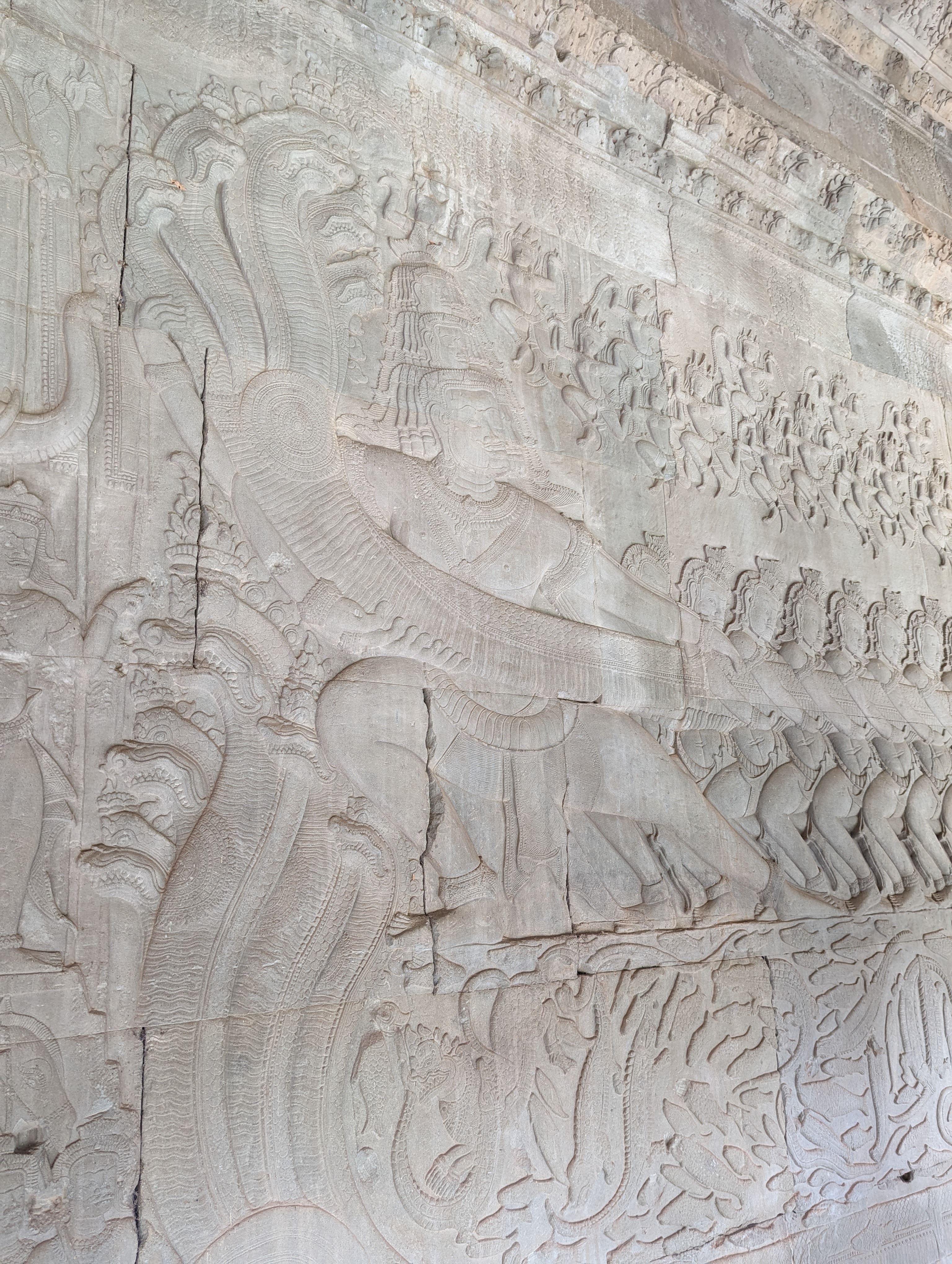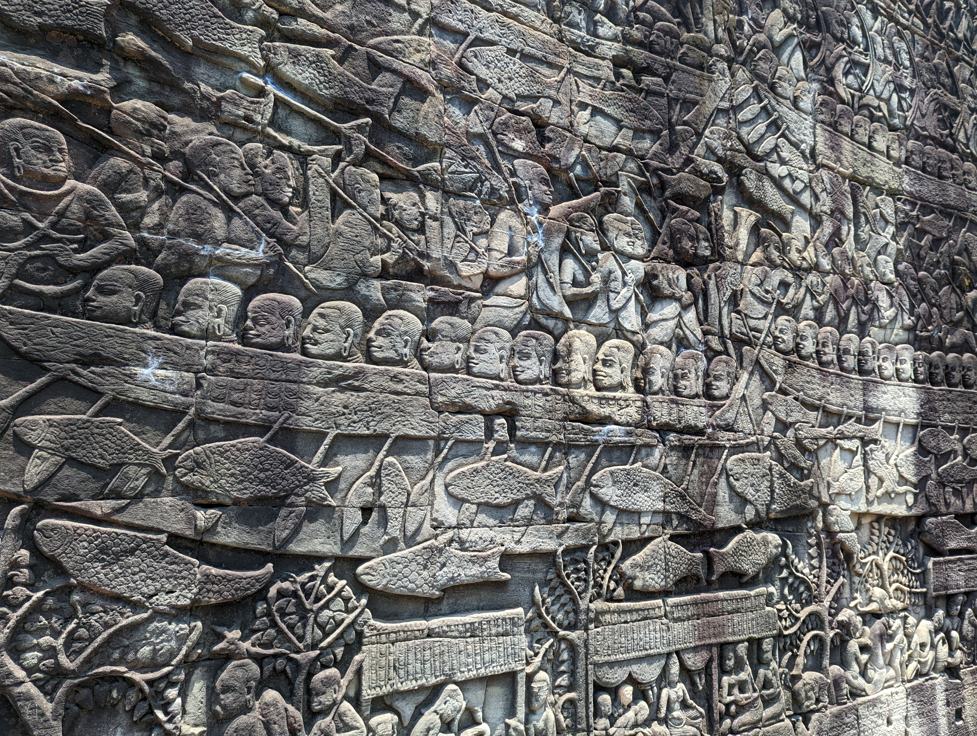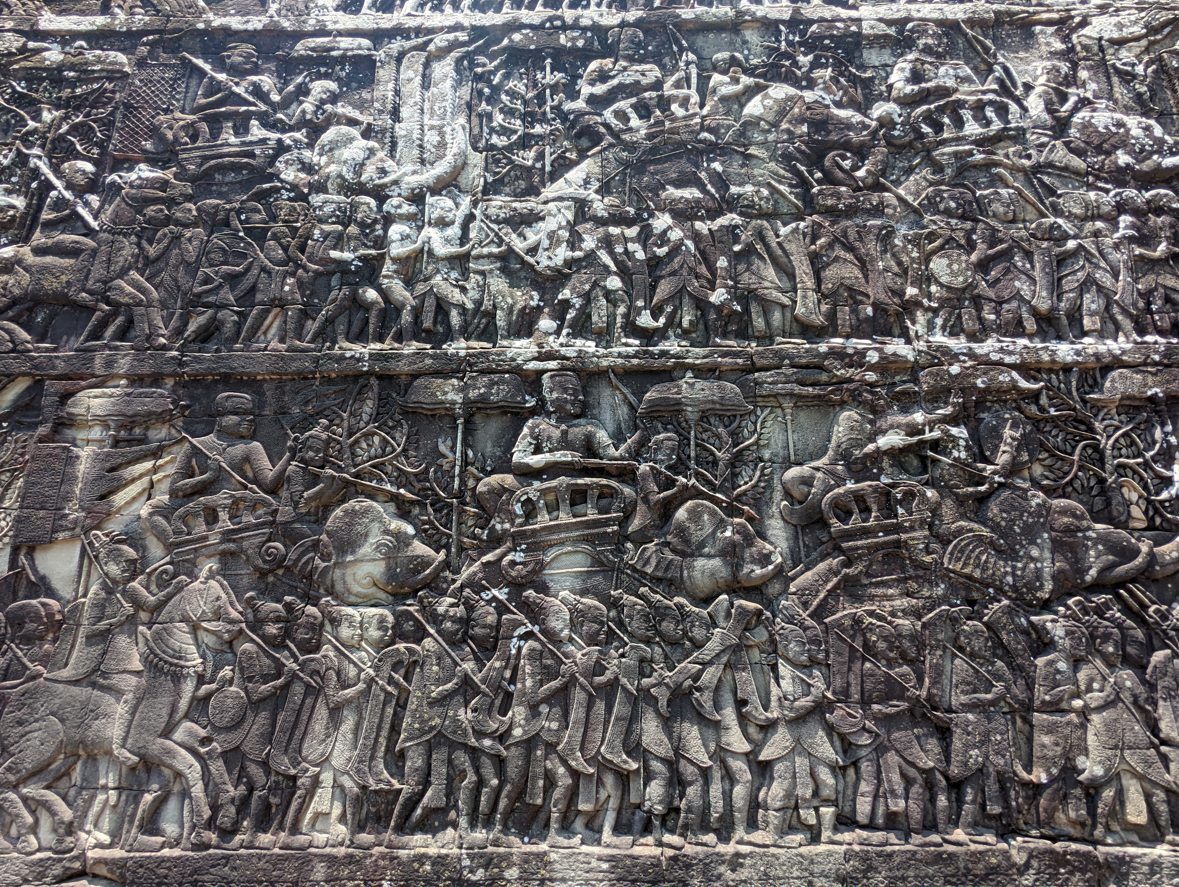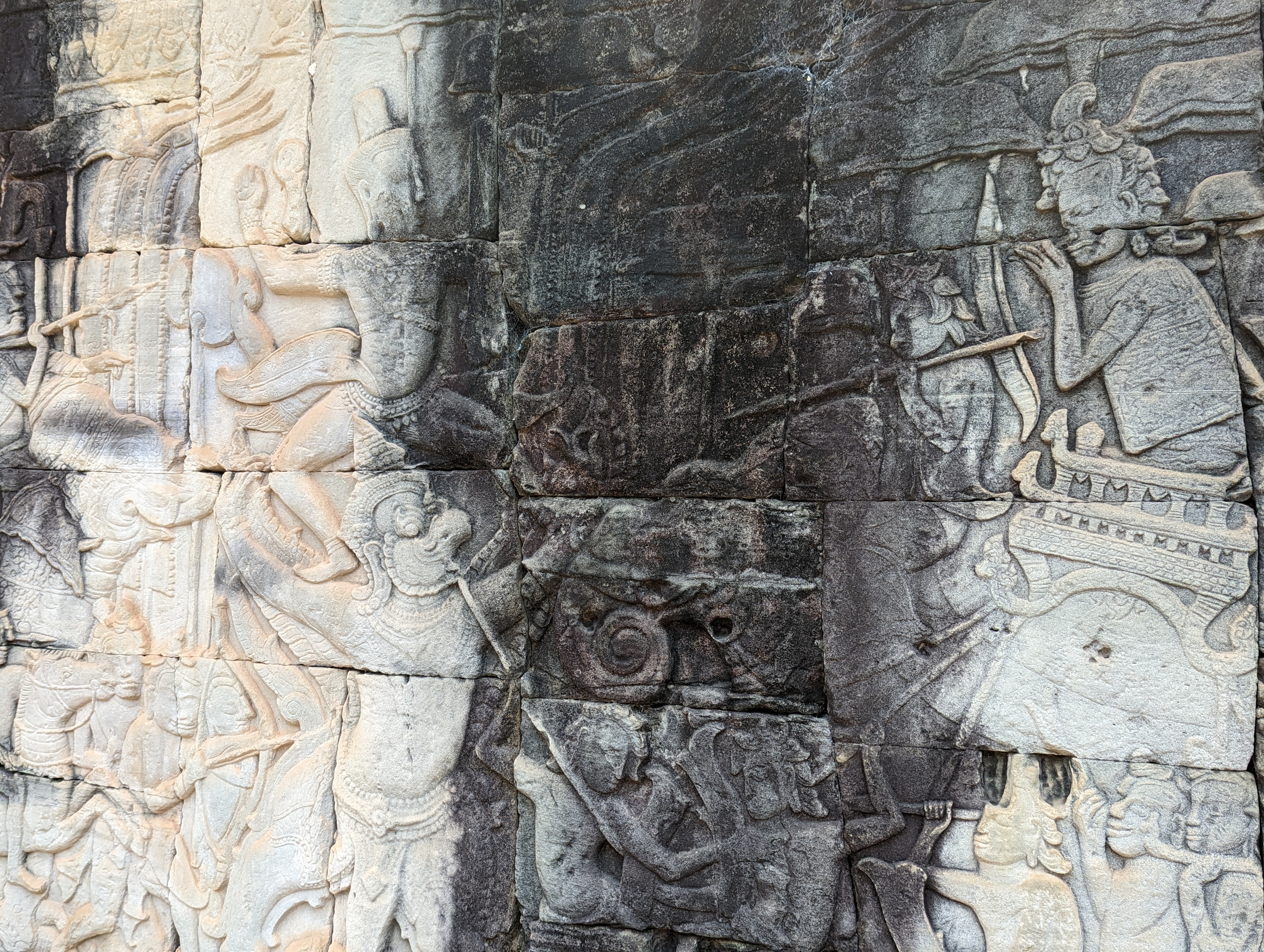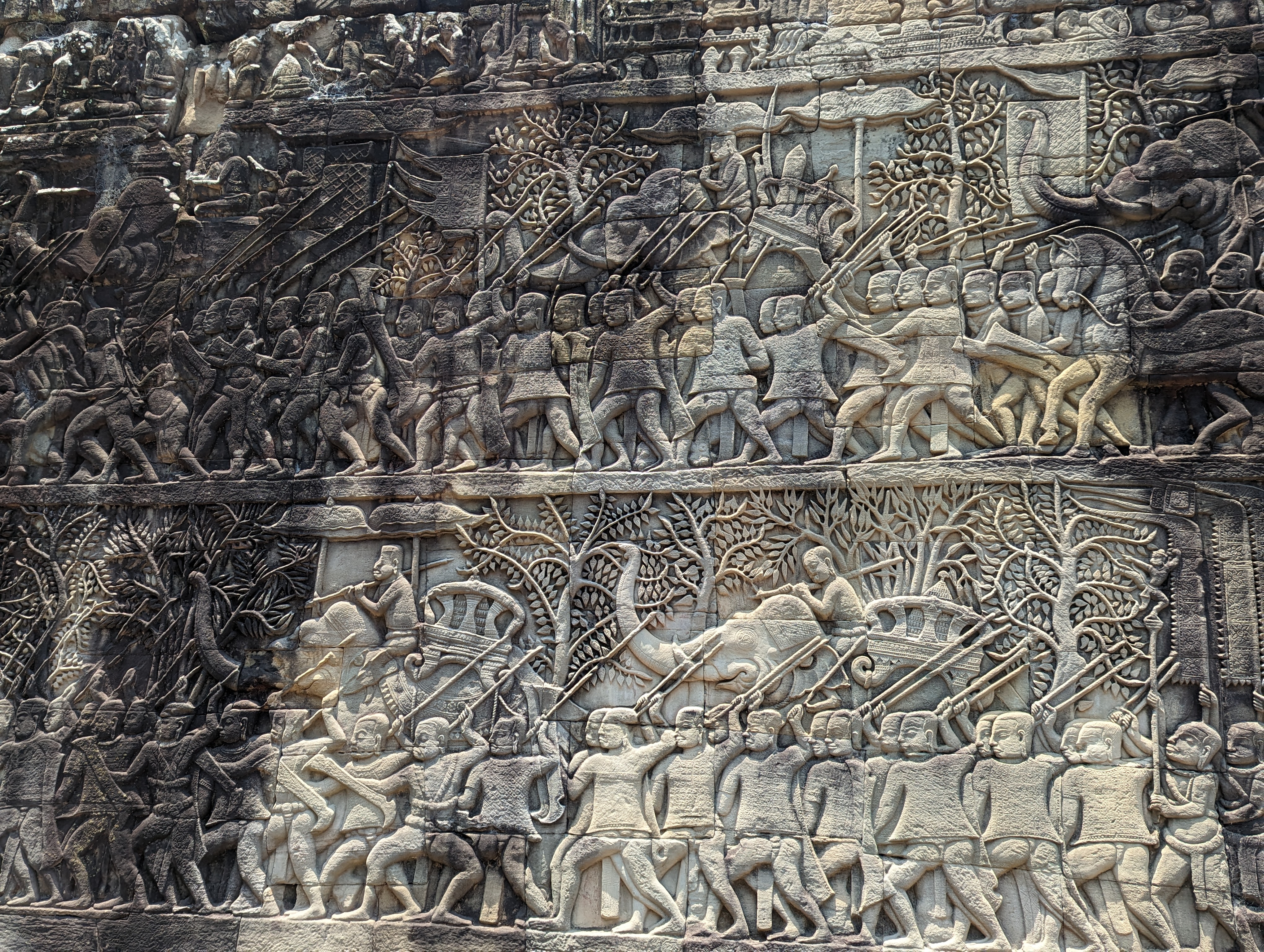 The base of the temple is lava stone with sandstone used for the carvings.The depiction of elephants used for daily tasks and even for fighting in wars.Dancers.More elephants and a Khmer army.A dragonboat!