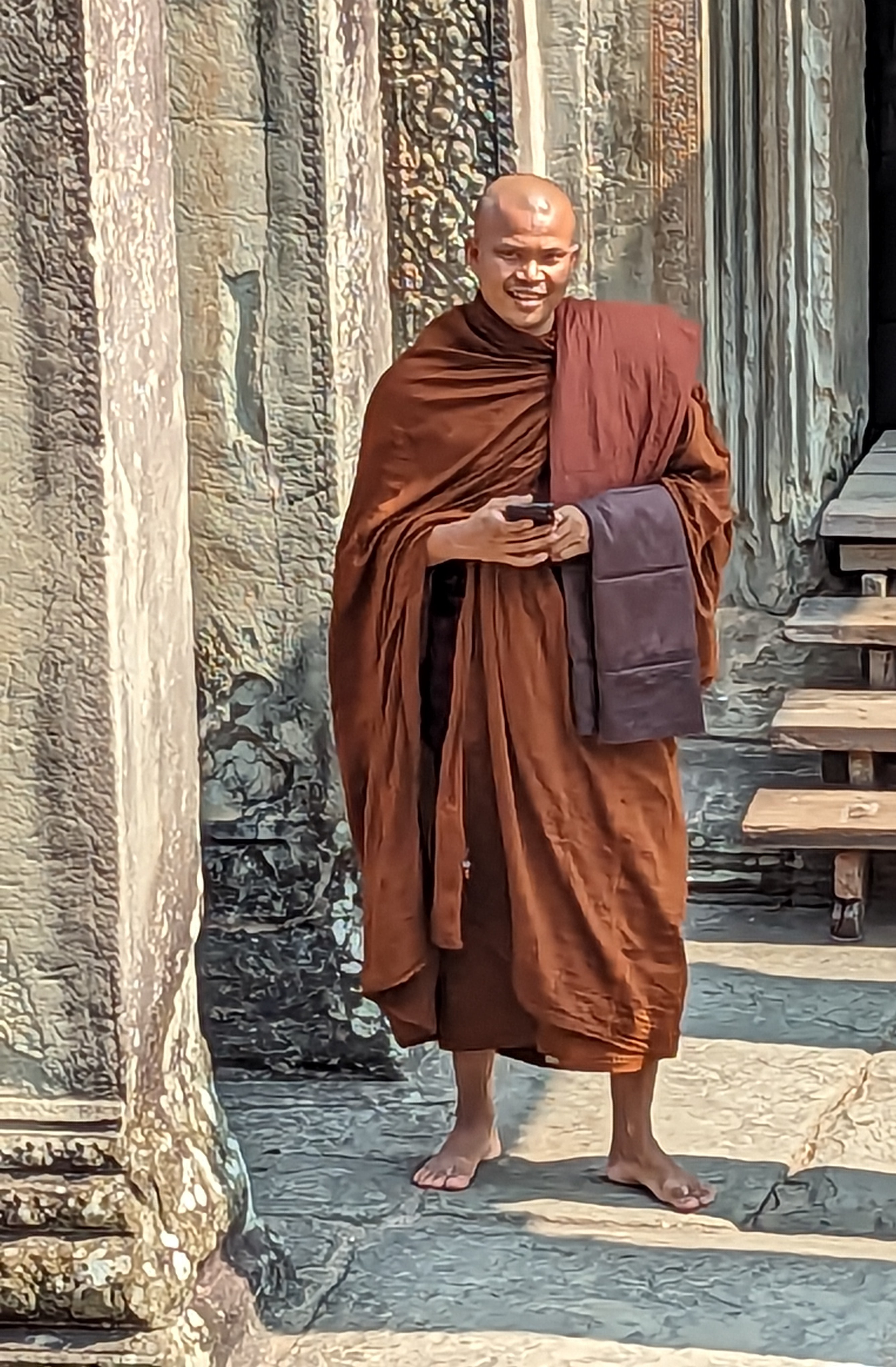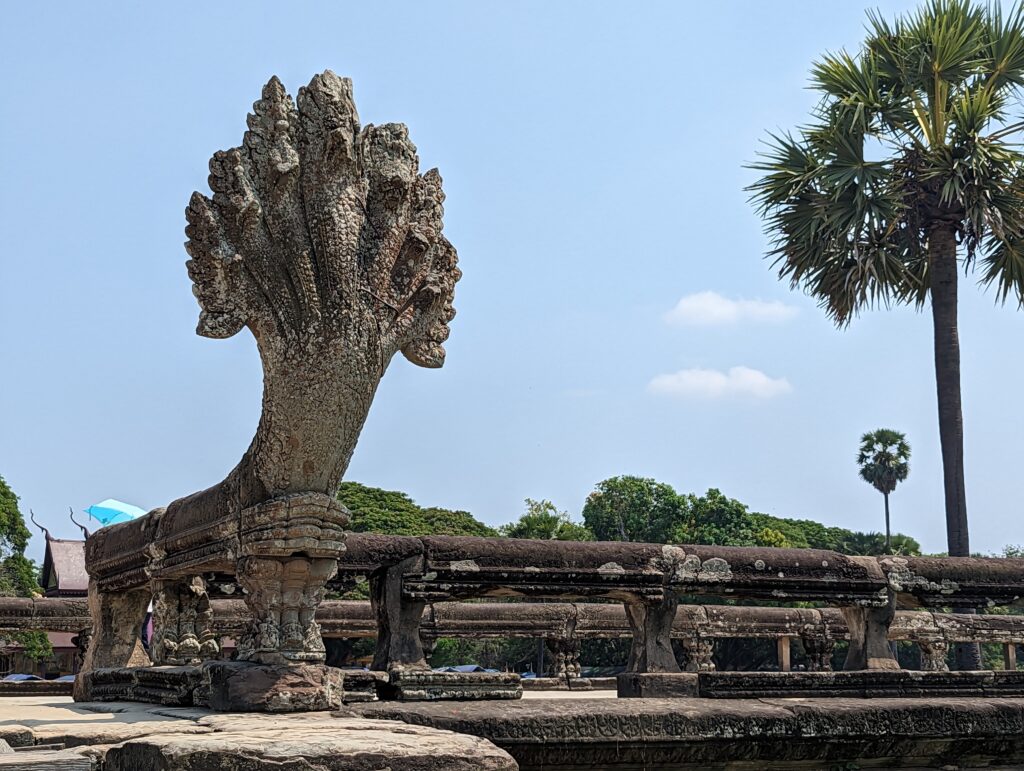 I did see a few monks as it is a holy day.A sculpture of a dancer.Most of the scenes are from Hinduism that depicts good reigning over evil.Most of the statues of Buddha are the body but without a head. During invasions, armies would take everything of value but the statues were too heavy. Instead they took the heads off. The heads of most of the statues have not been found.This depicts the prince and demons holding Naga.The head of Naga rises alongside the stairs. The railings along the walkway in the courtyard are the body of the 7 headed snake.Leaving the complex you pass by the reflection pool.