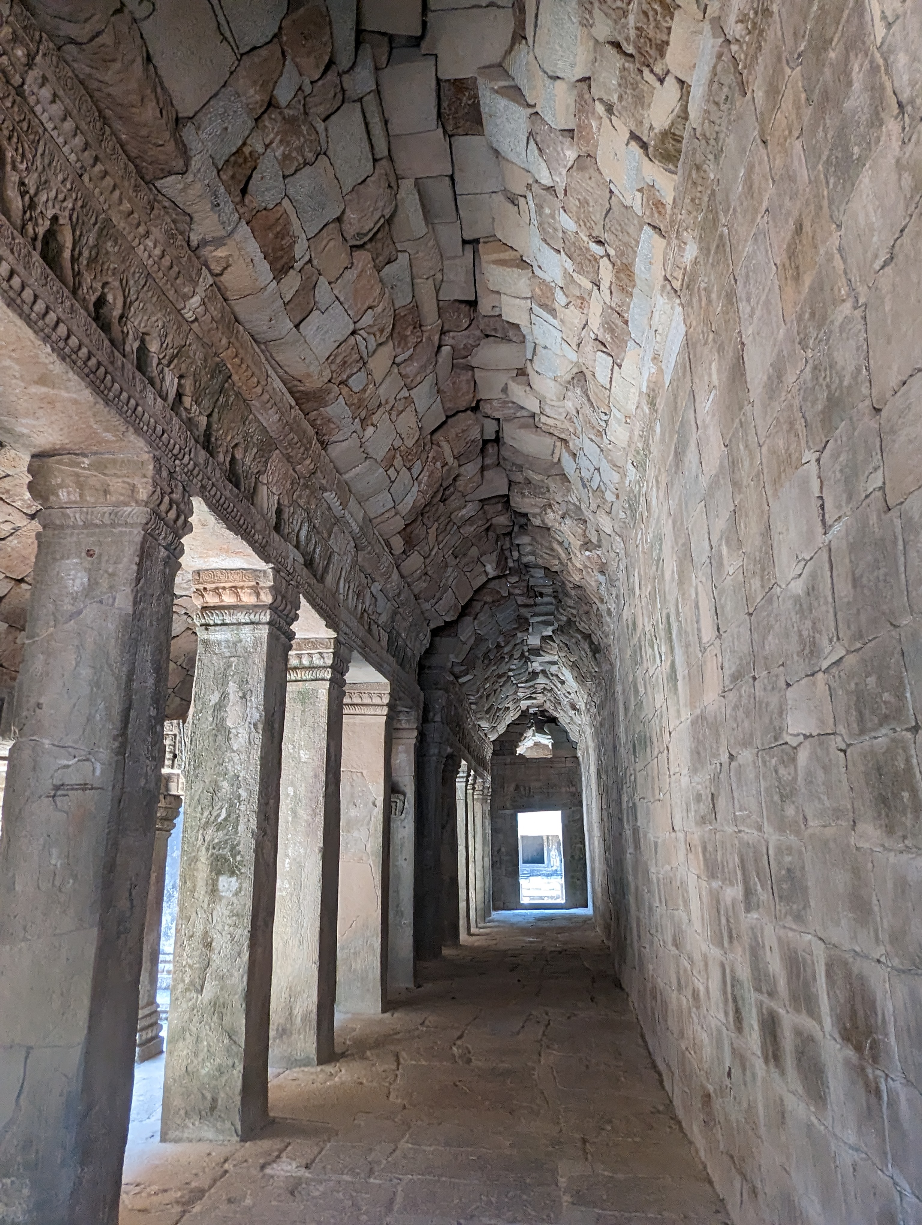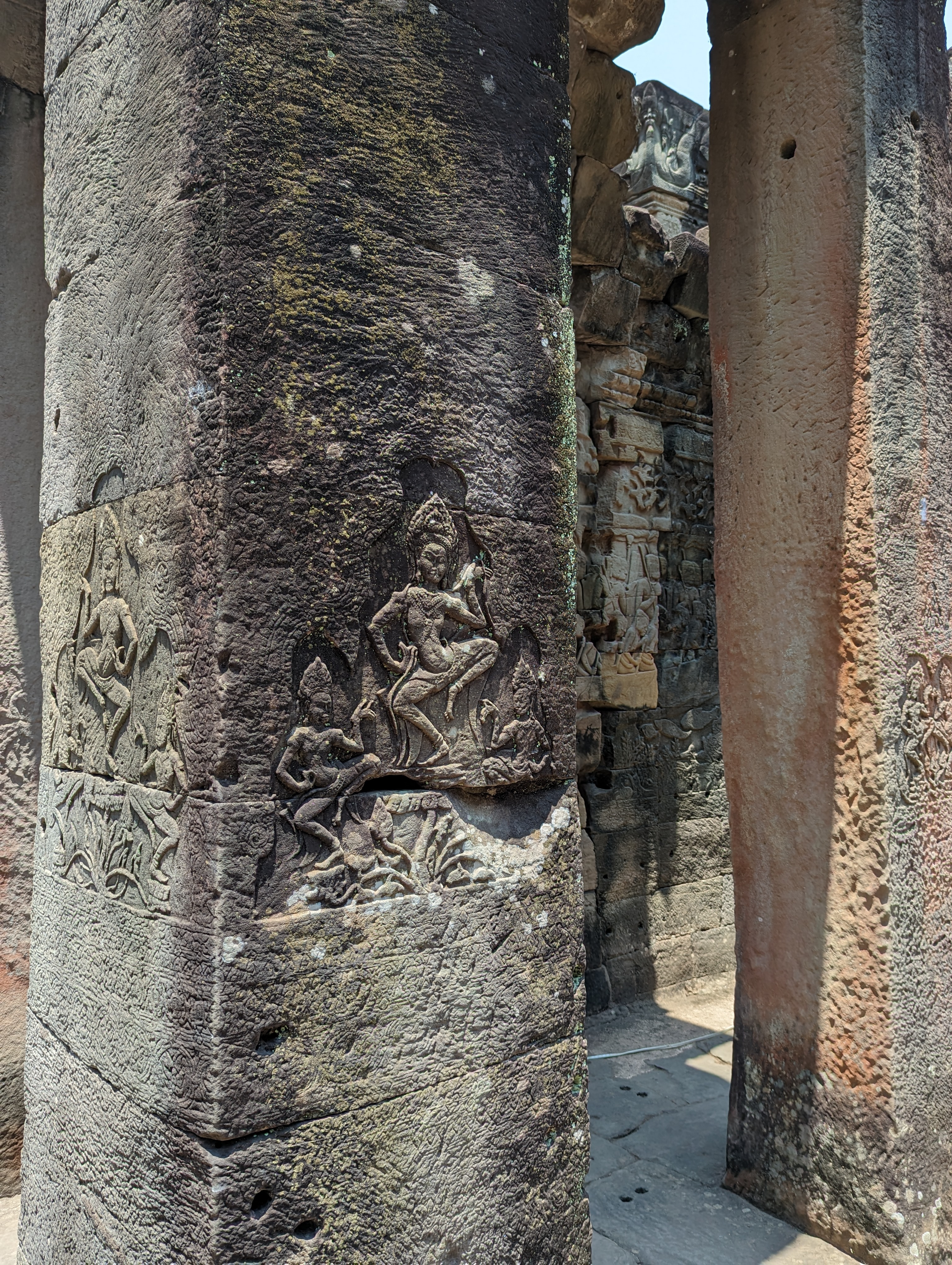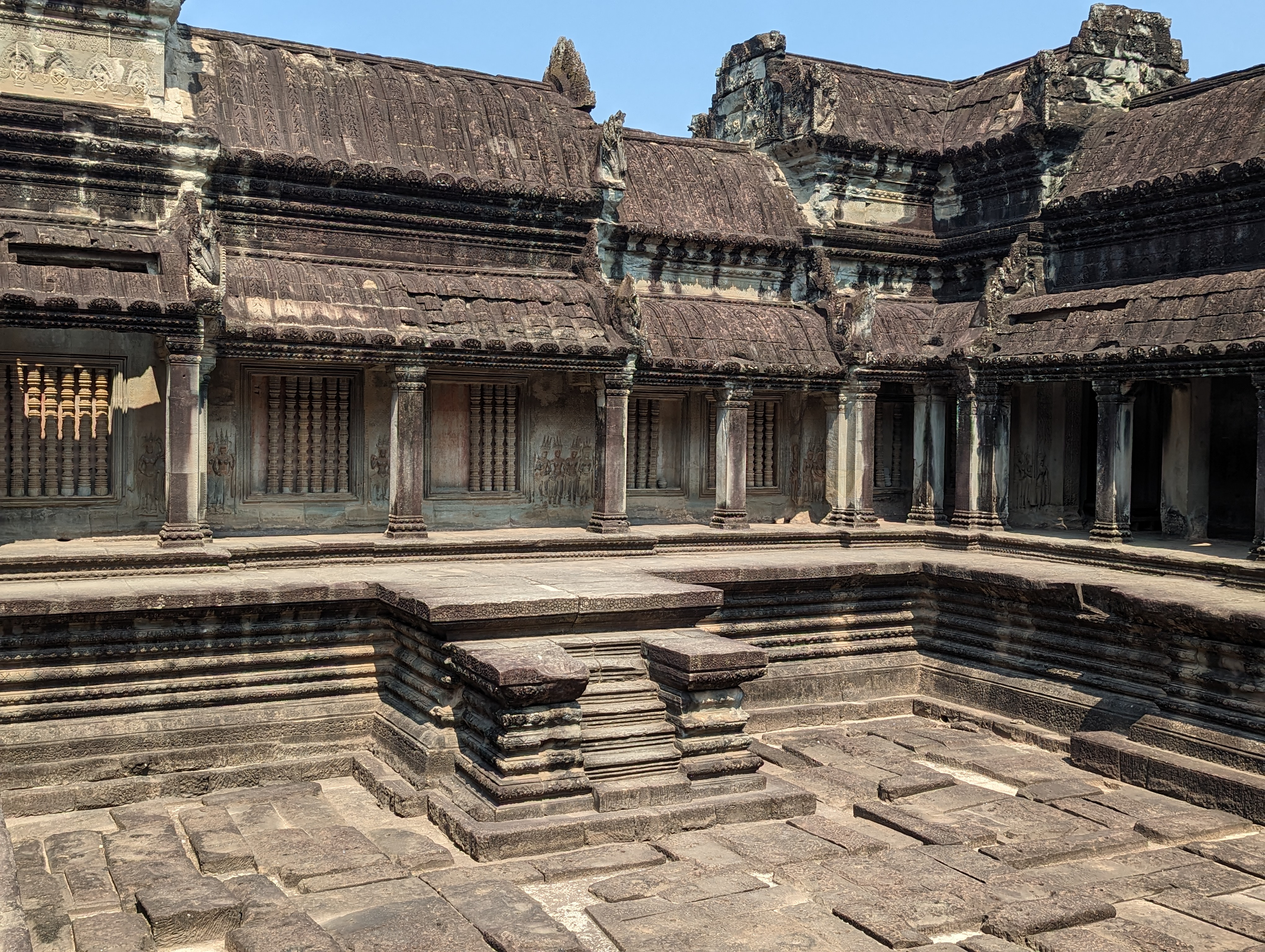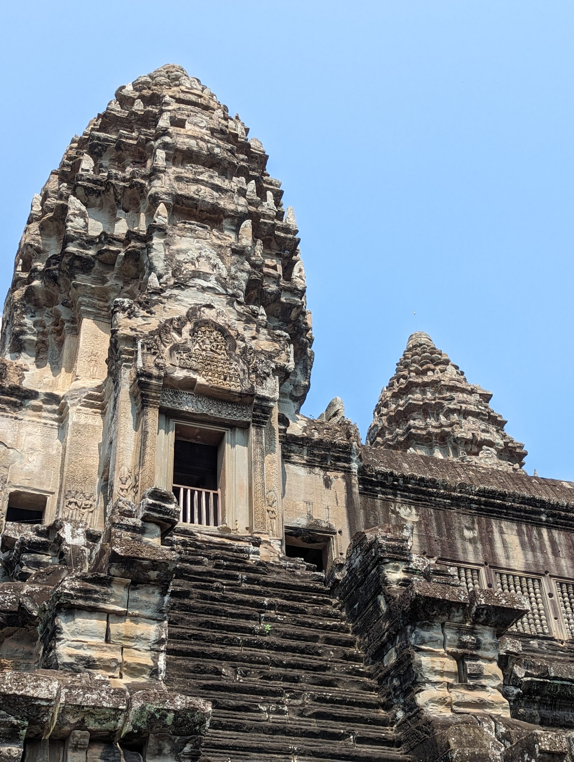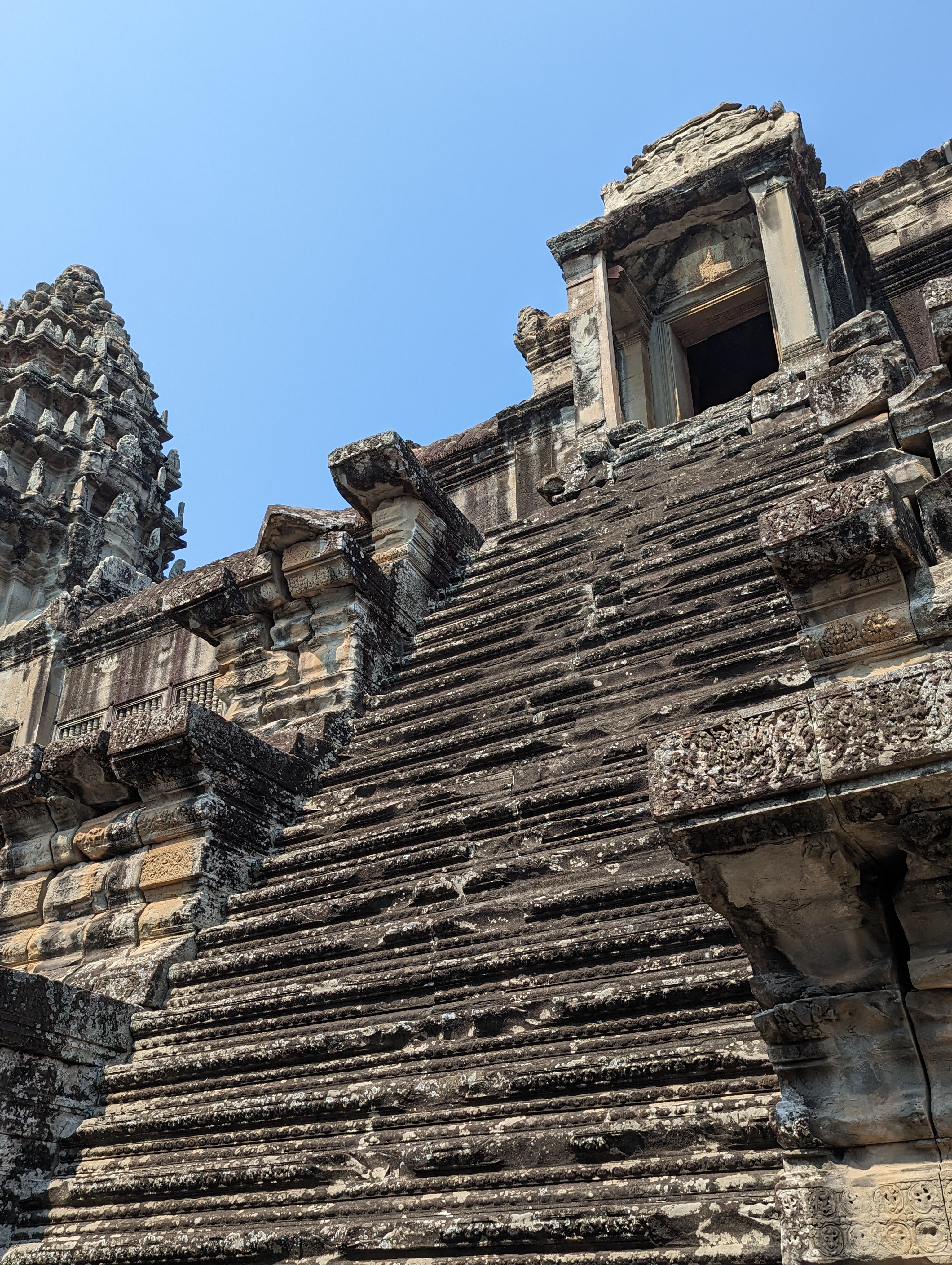 Stairs entering into the temple.These are an inside portion of the temple. I am already on the second floor of the structure. This goes to the third. On full moon days, only religious people can enter that floor. There are different stairs to climb as these are too dangerous.Around the temple are platforms for ceremonies and small buildings which were libraries.On the second and third floor are pools. From the central tower that would be quite a sight when filled. They represented the different elements.