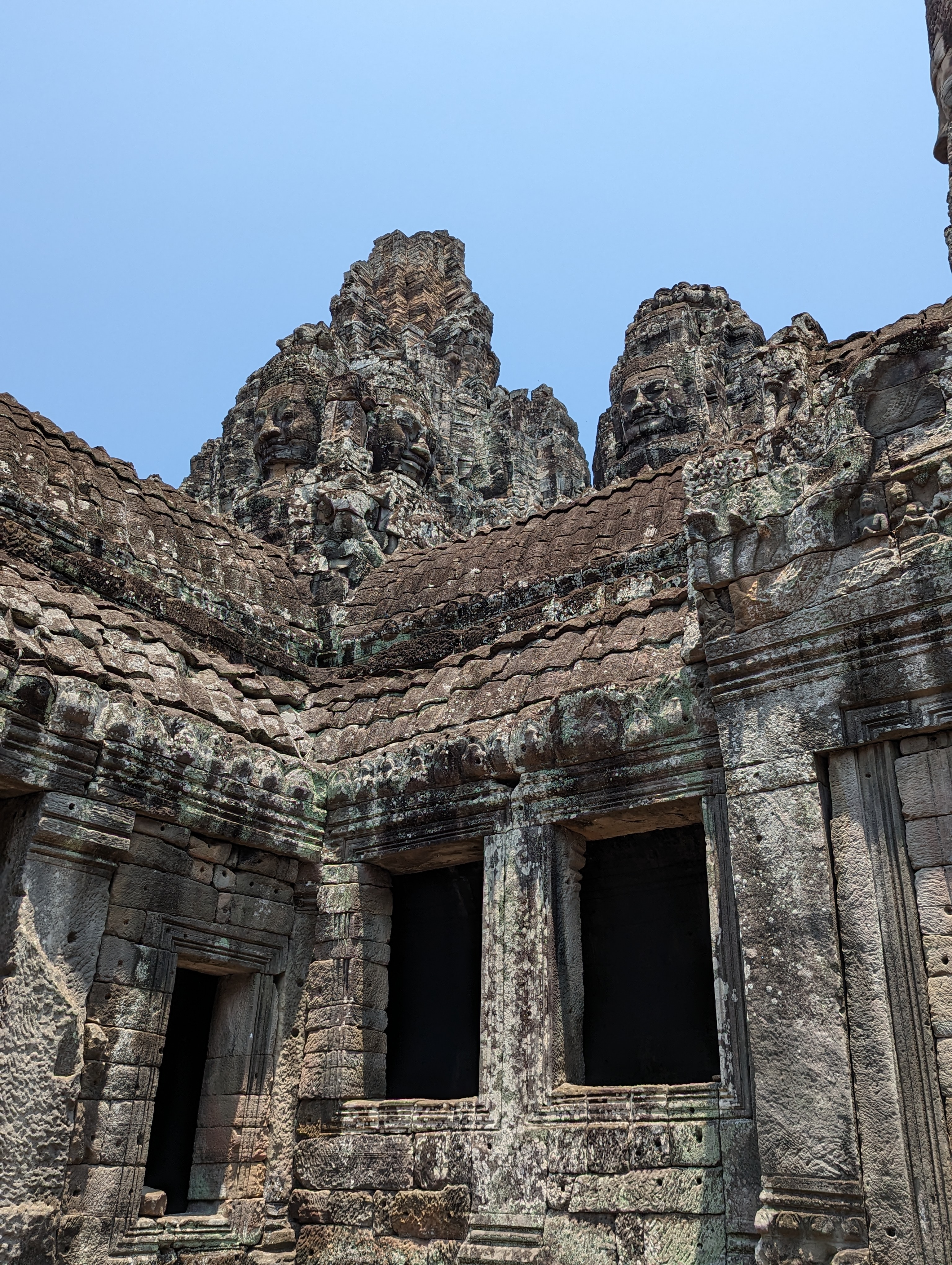 The Bayon is best known for its 54 towers, each of which has at the top a four-faced head. The faces are believed to represent Avalokiteśvara, the bodhisattva of compassion. (Bodhisattva are awaiting their reincarnation as Buddha). The faces are all slightly different, and they are said to represent the different aspects of Avalokiteśvara’s personality.