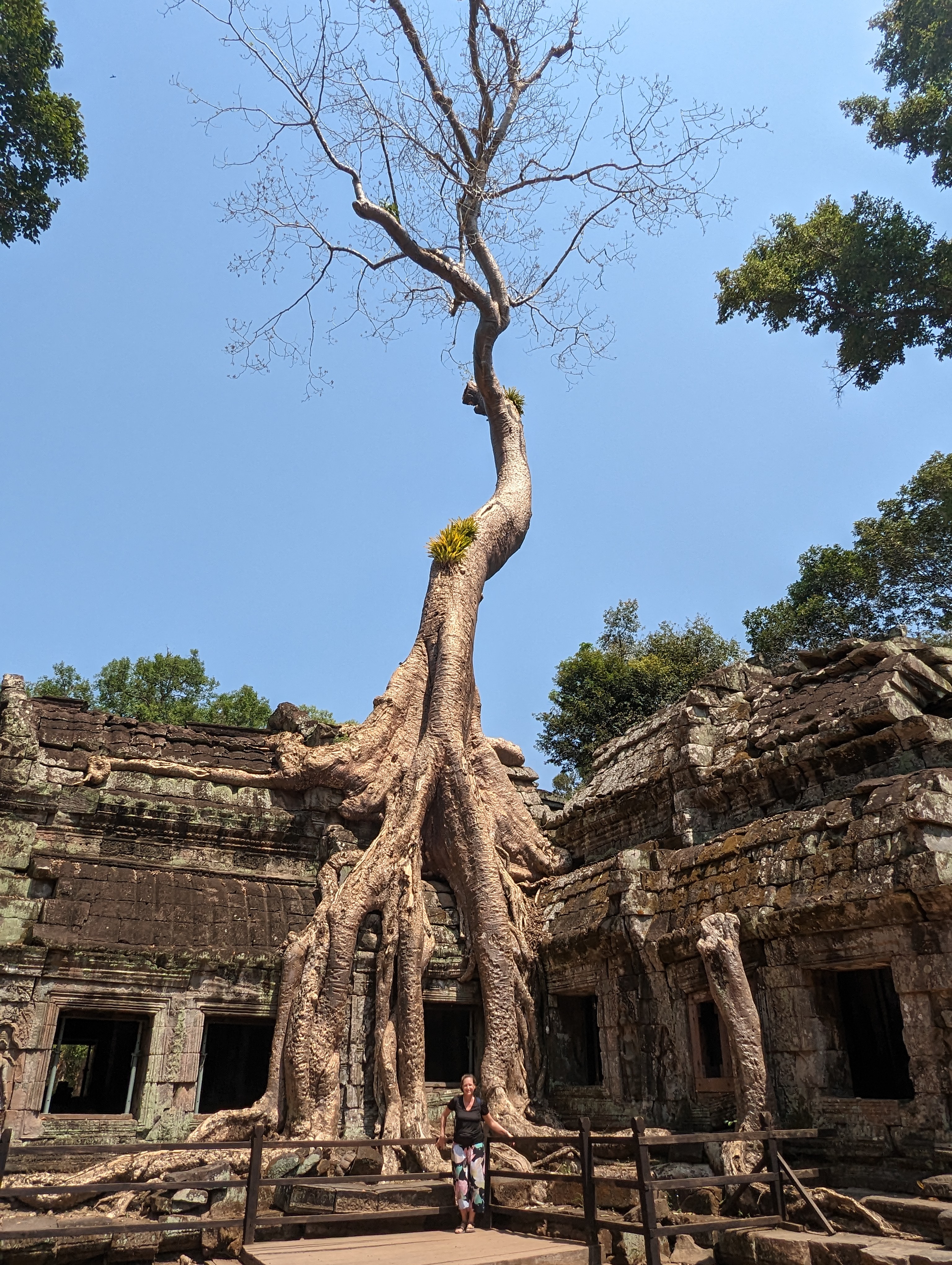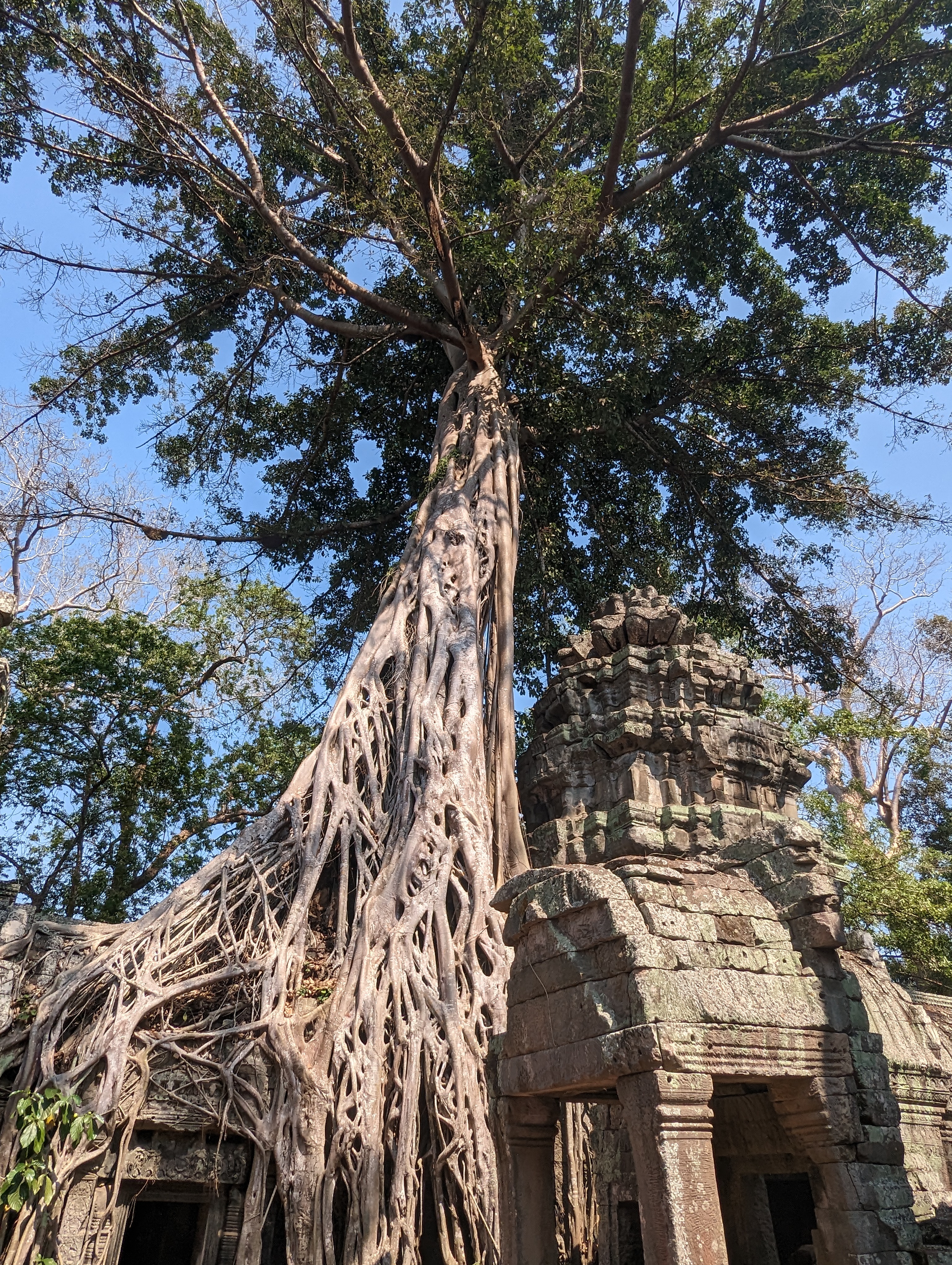 We then traveled to another temple in the complex. Ta Prohm was built in the late 12th and early 13th centuries and was originally called Rajavihara. It is one of the most popular temples at Angkor, partly because it was featured in the 2001 film Lara Croft: Tomb Raider. The guide said that Angkor Wat was largely unknown by the world until then.