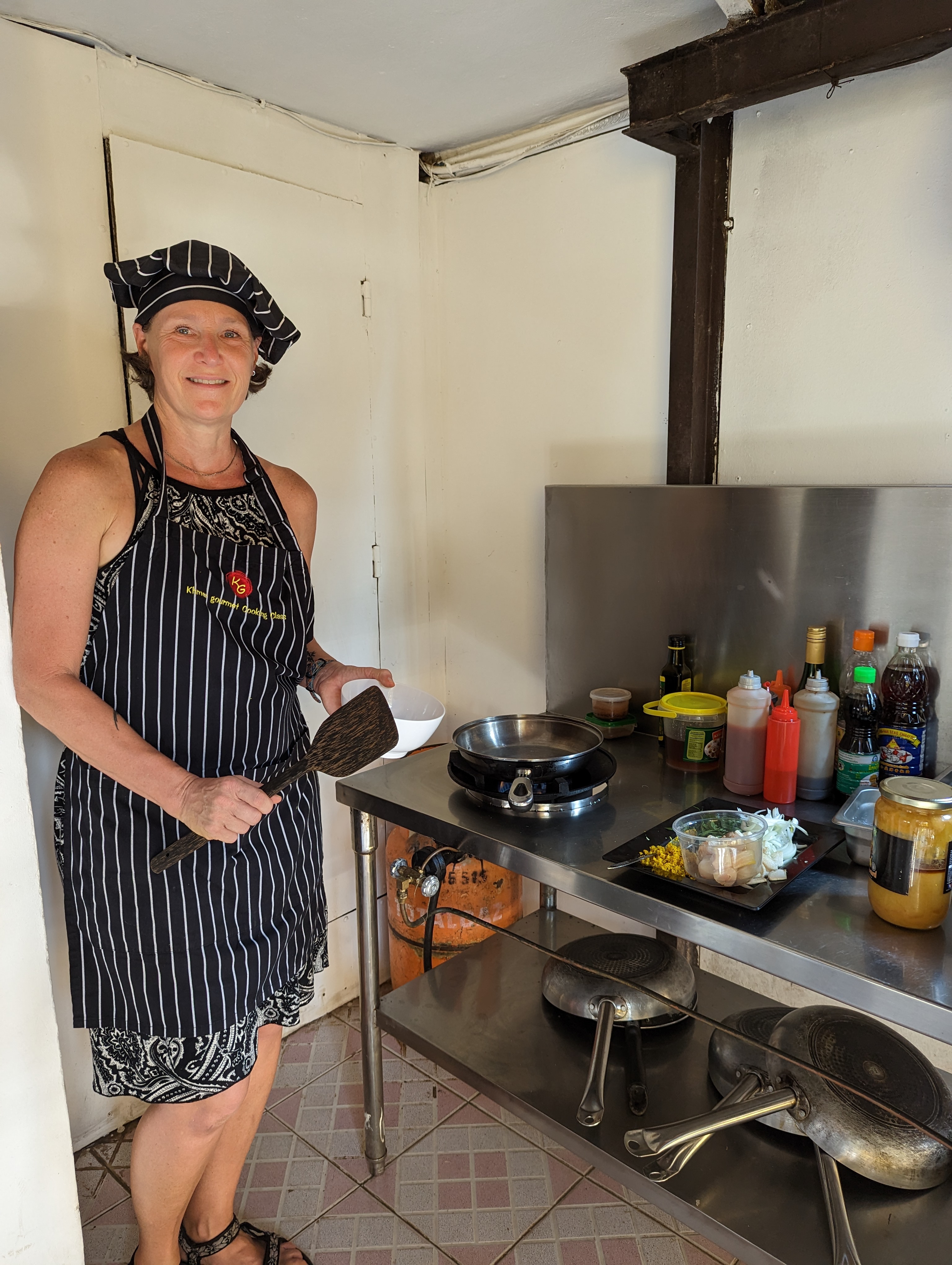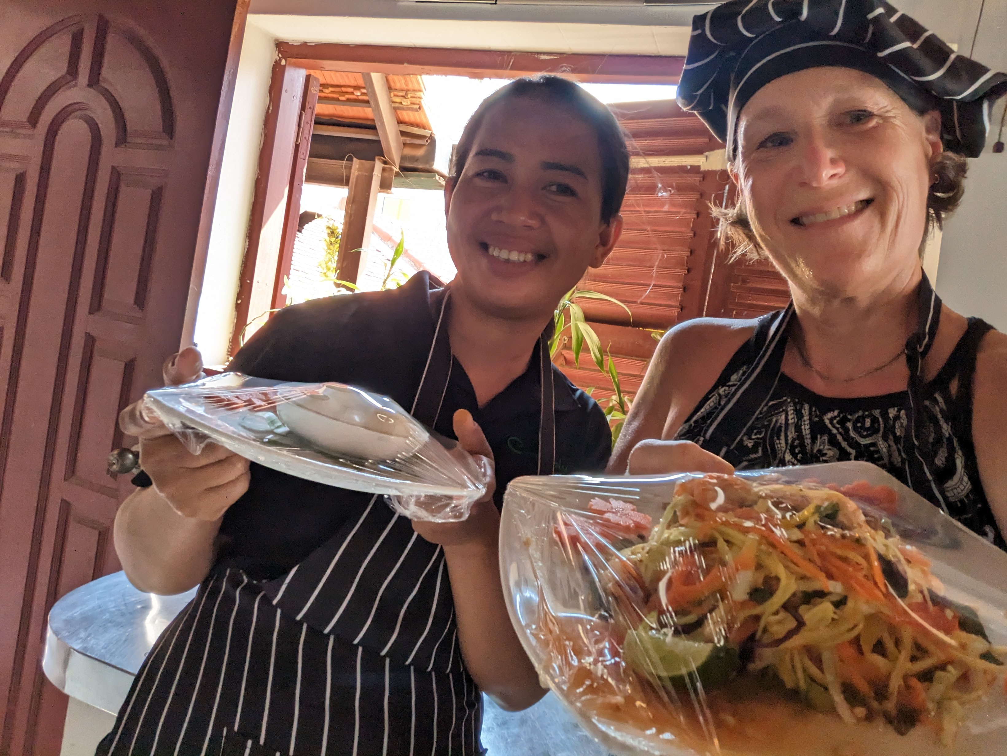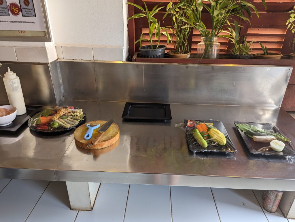 There are many things to do in Siem Reap but i needed to give my knee a break and many other activities required biking or more walking. I was happy to find a cooking class on Trip featuring two dishes i have ordered frequently in Cambodia: Fish Amok and green mango salad. A tuktuk picked me up at my hotel (a guarantee people arrive on time….) And a quick stop down the alley.