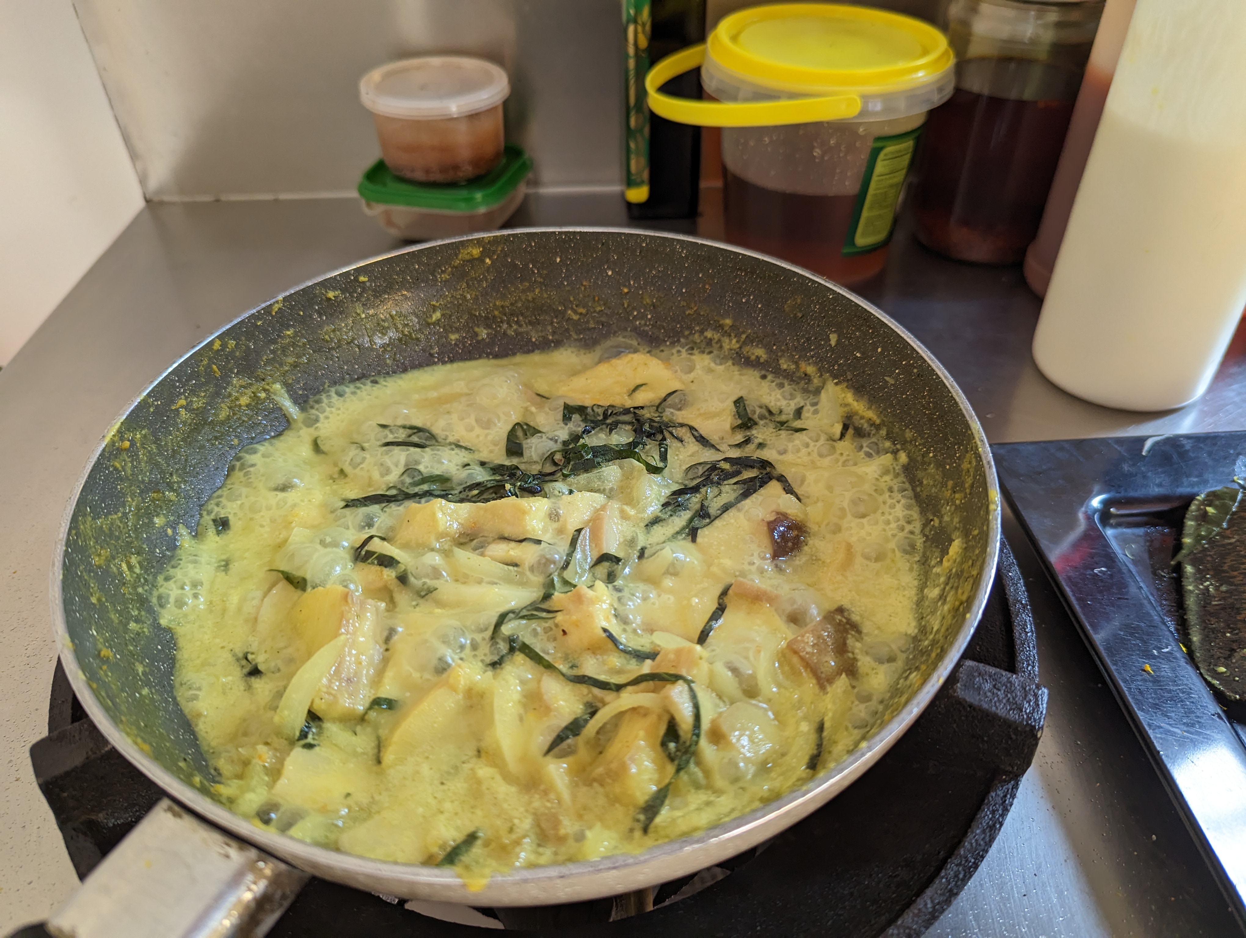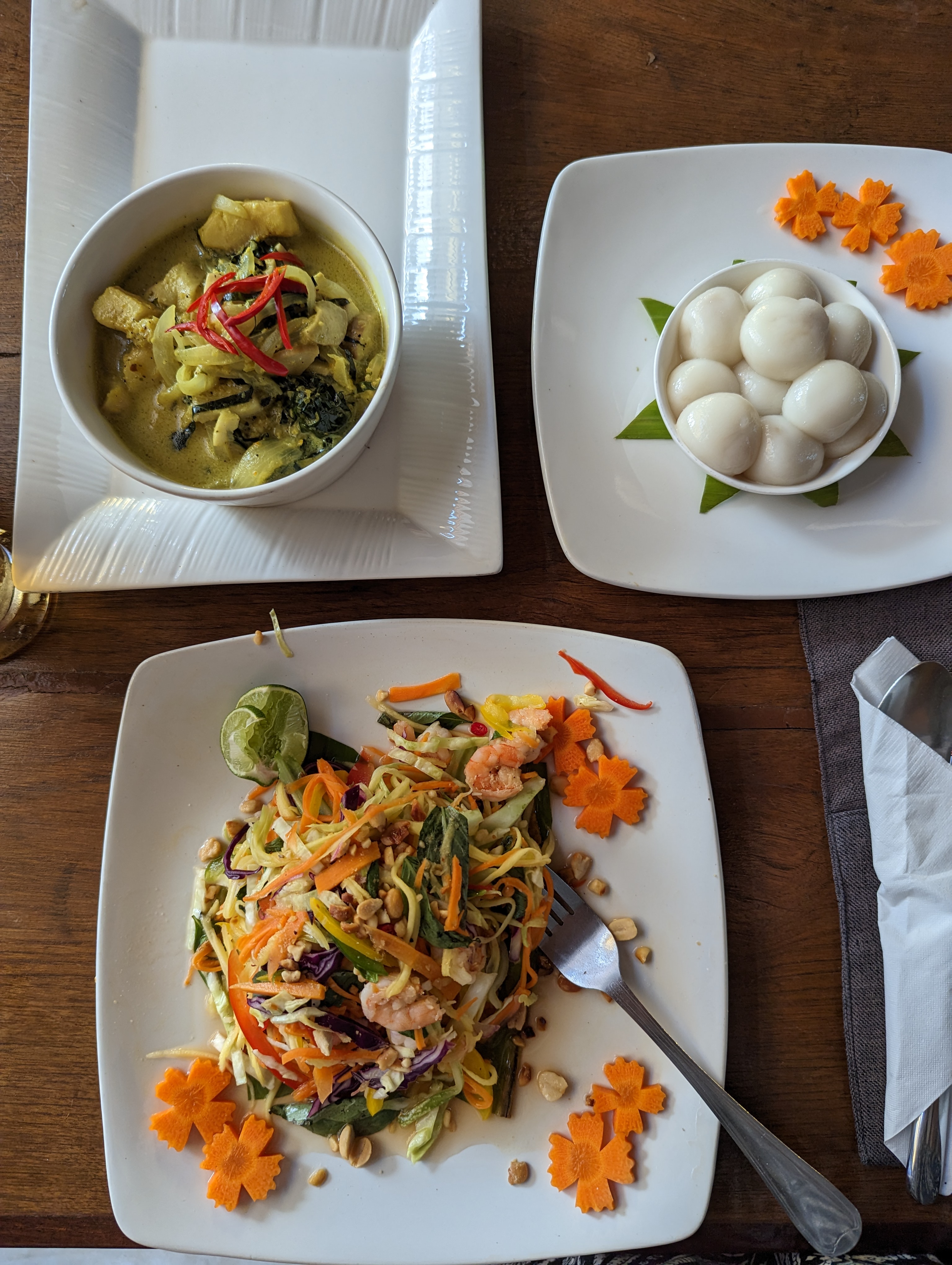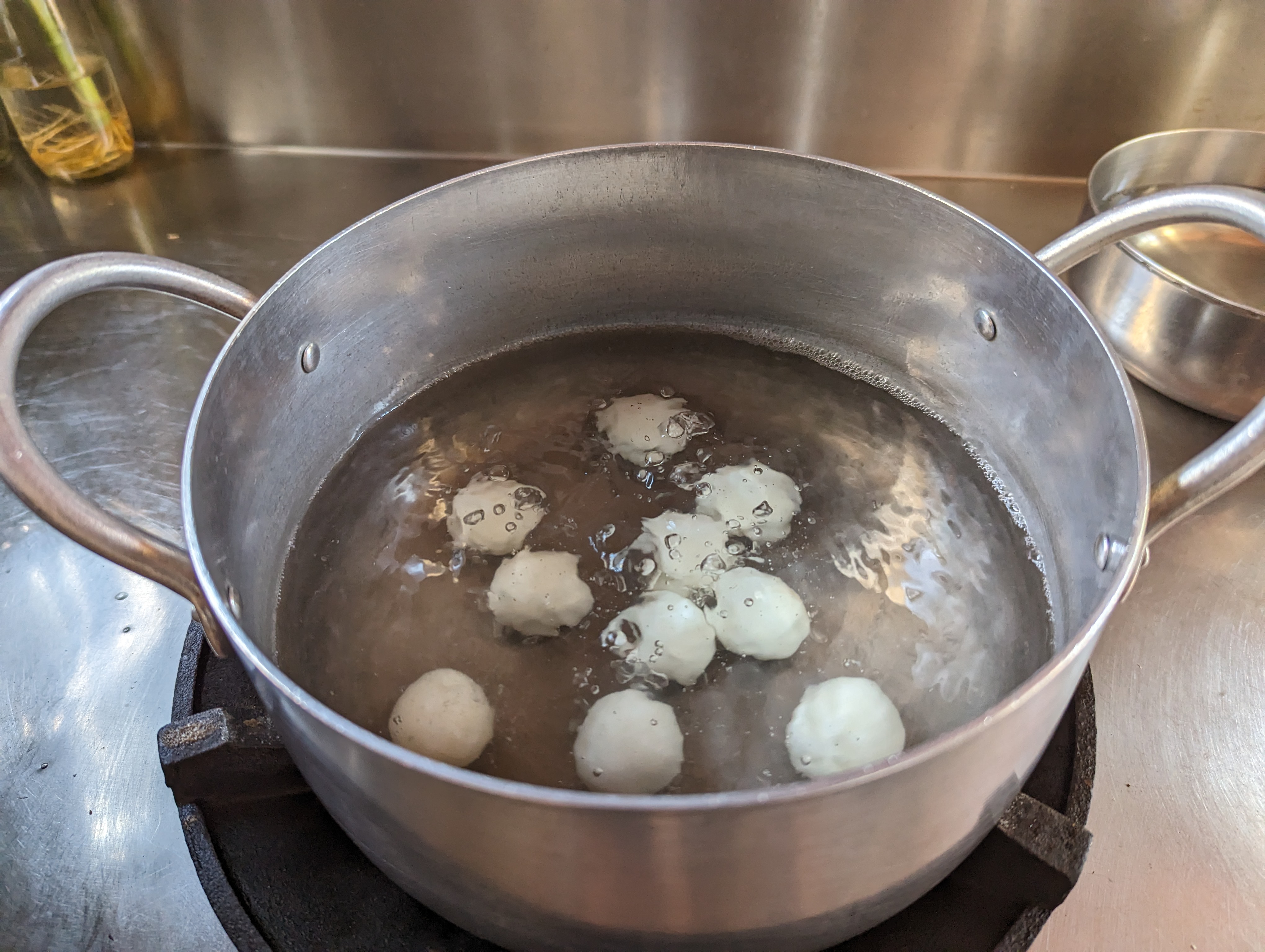 And now it is time to cook. I even made dessert. Glutinous rice balls with a palm sugar filling. They are boiled in hot water then cooled in cook water.