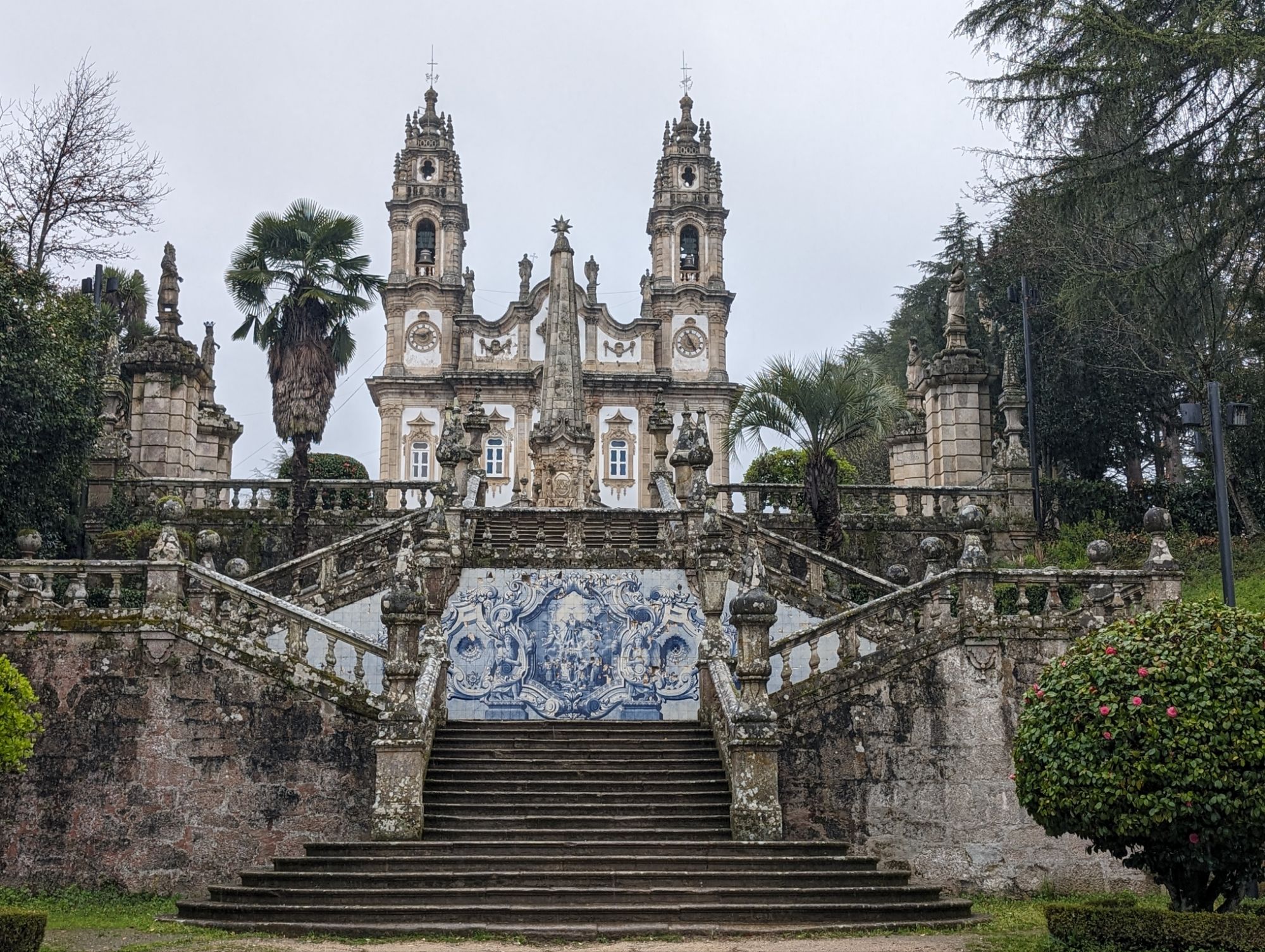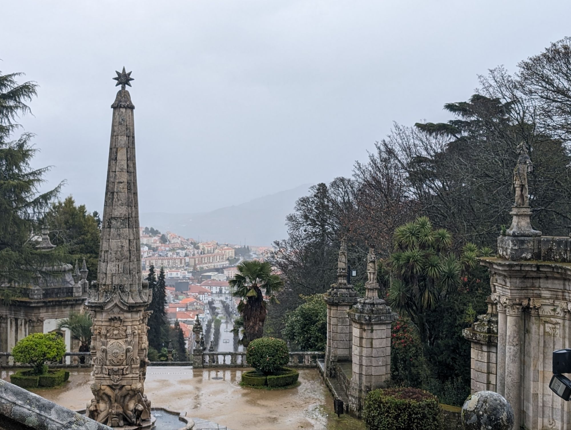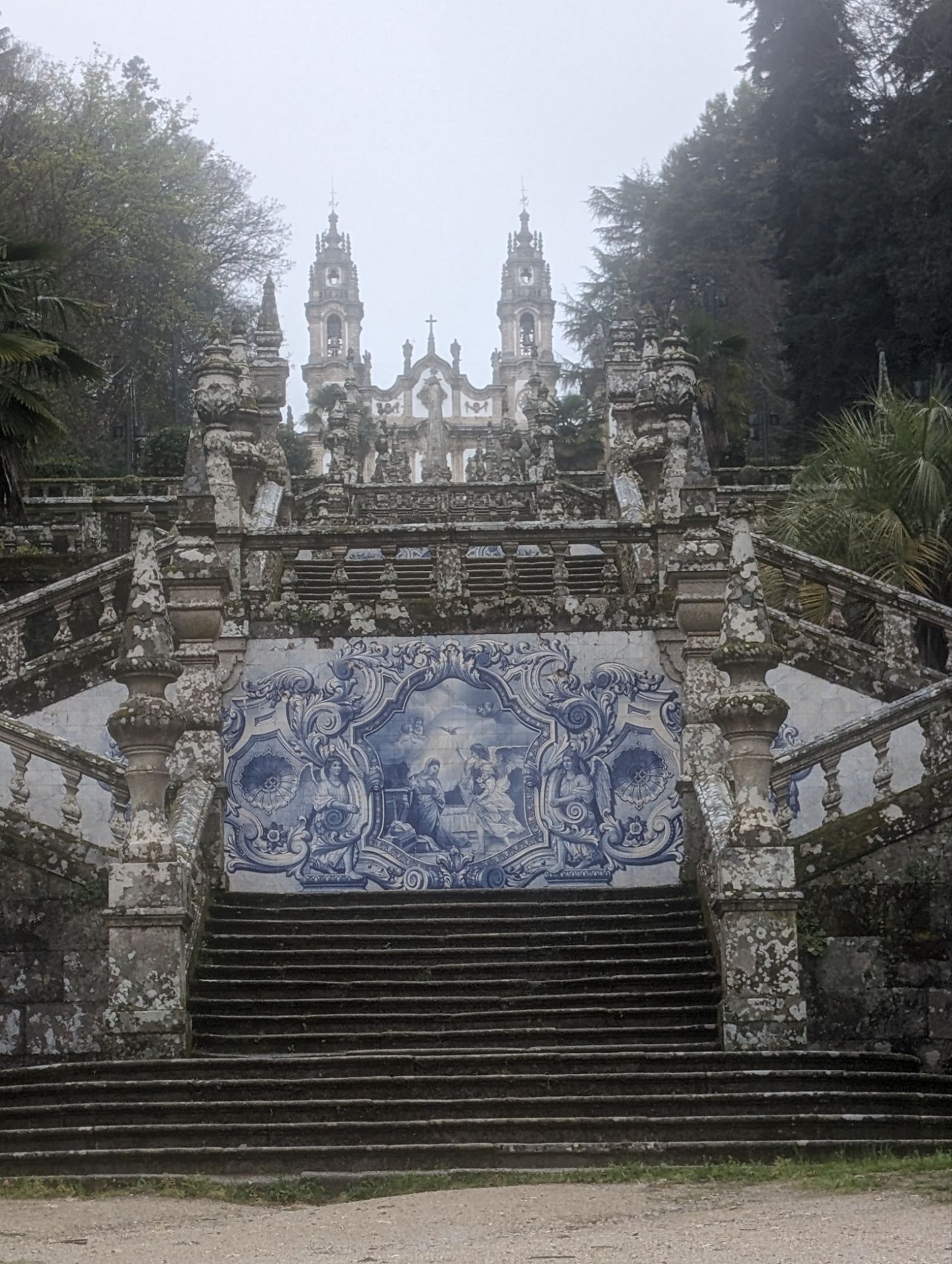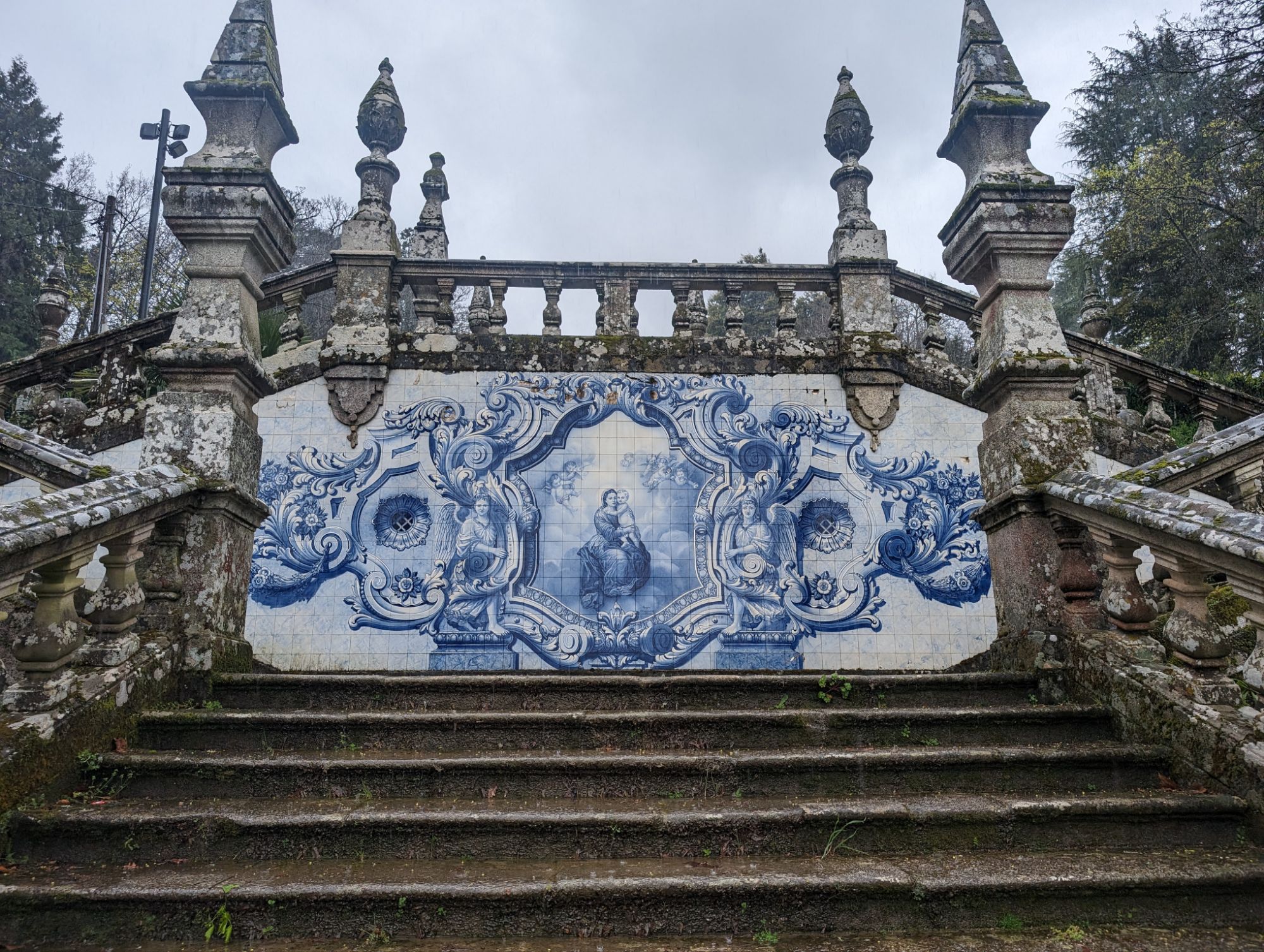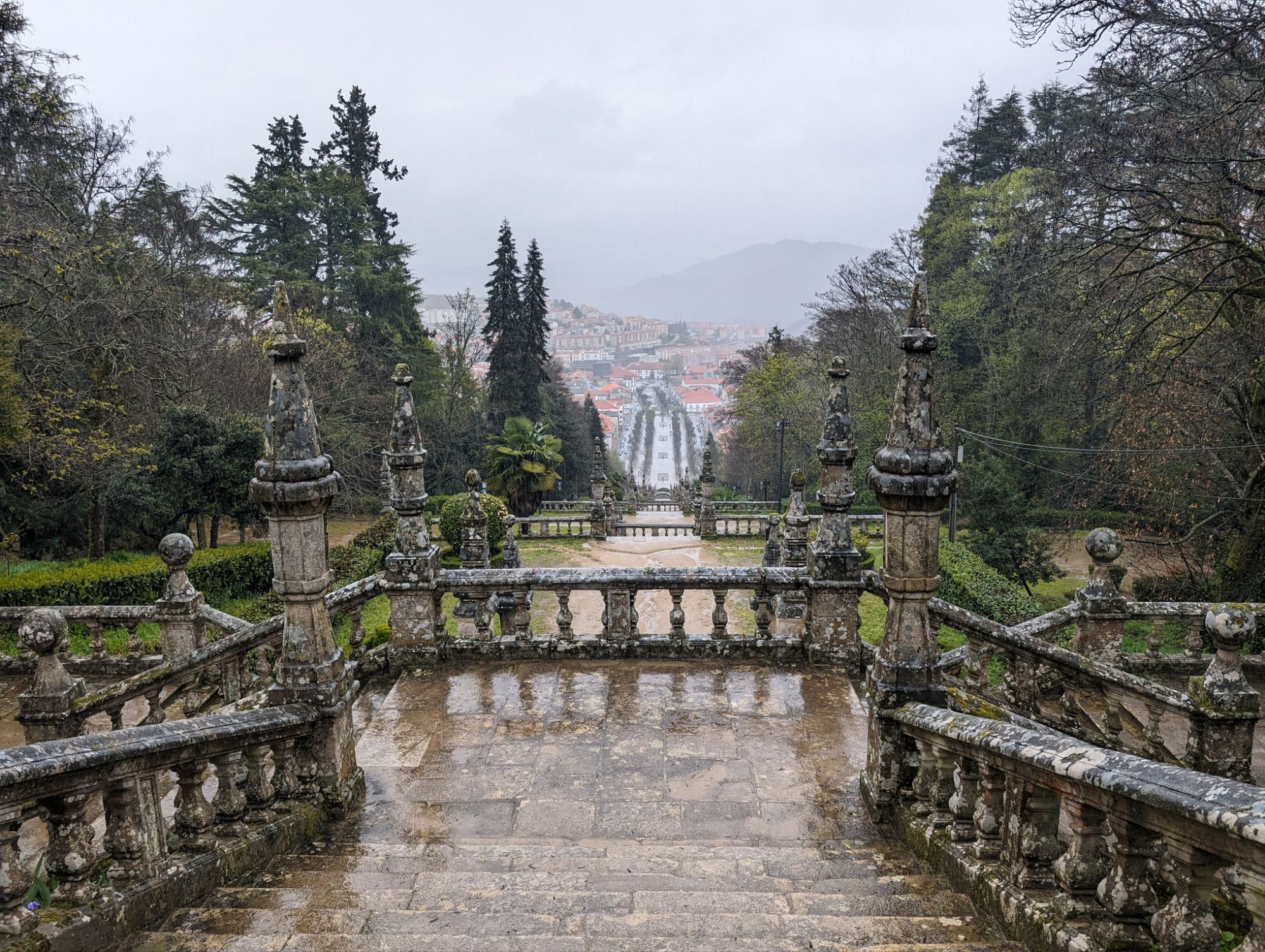 The Santuario Nossa Senhora dos Remedios is perched on a hill above the town of Lamego. To reach the Church you climb up sets of zigzag stairs from the wide avenue at the edge of the town. The view is worth the climb. Due to the rain we were dropped off at the top and viewed the inside of the church first. I then started at the top of the stairs and went down instead.