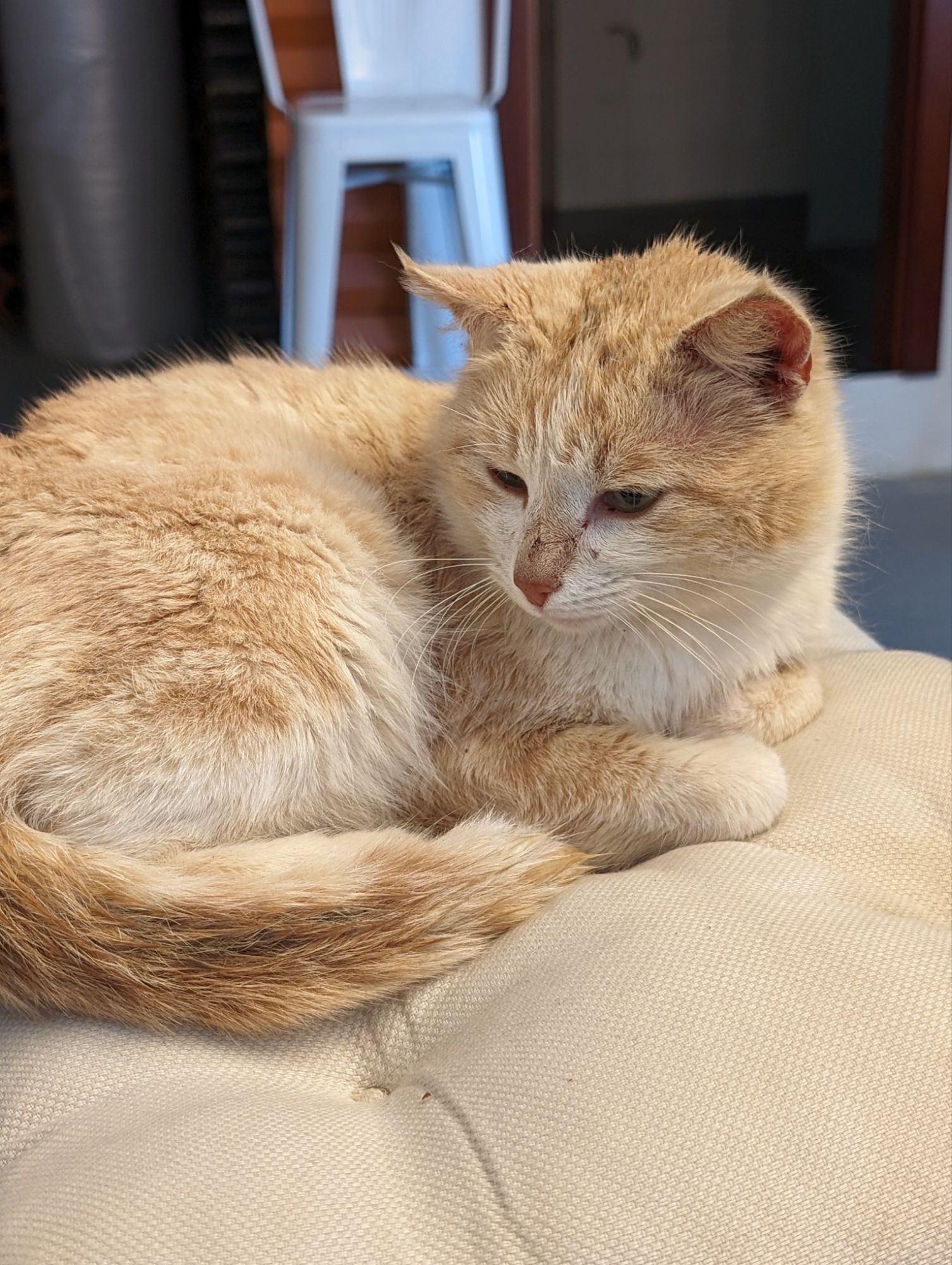 This cool dog came up to me, sat down and leaned against me. I tried to feed him but he just wanted attention.
