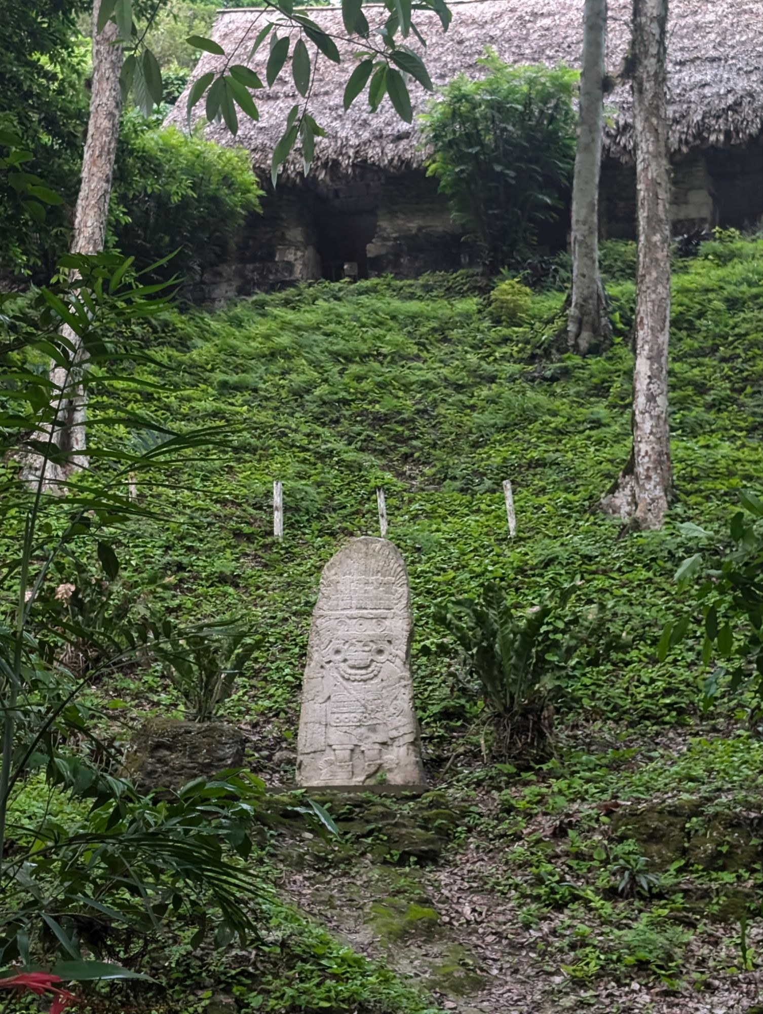 Aztec symbol An original stela that tells a story.The reproduction of the stela We climbed stairs alongside pyramid 216.Beautiful view but no view of the sunset today. Clouds were moving in again.A cicada