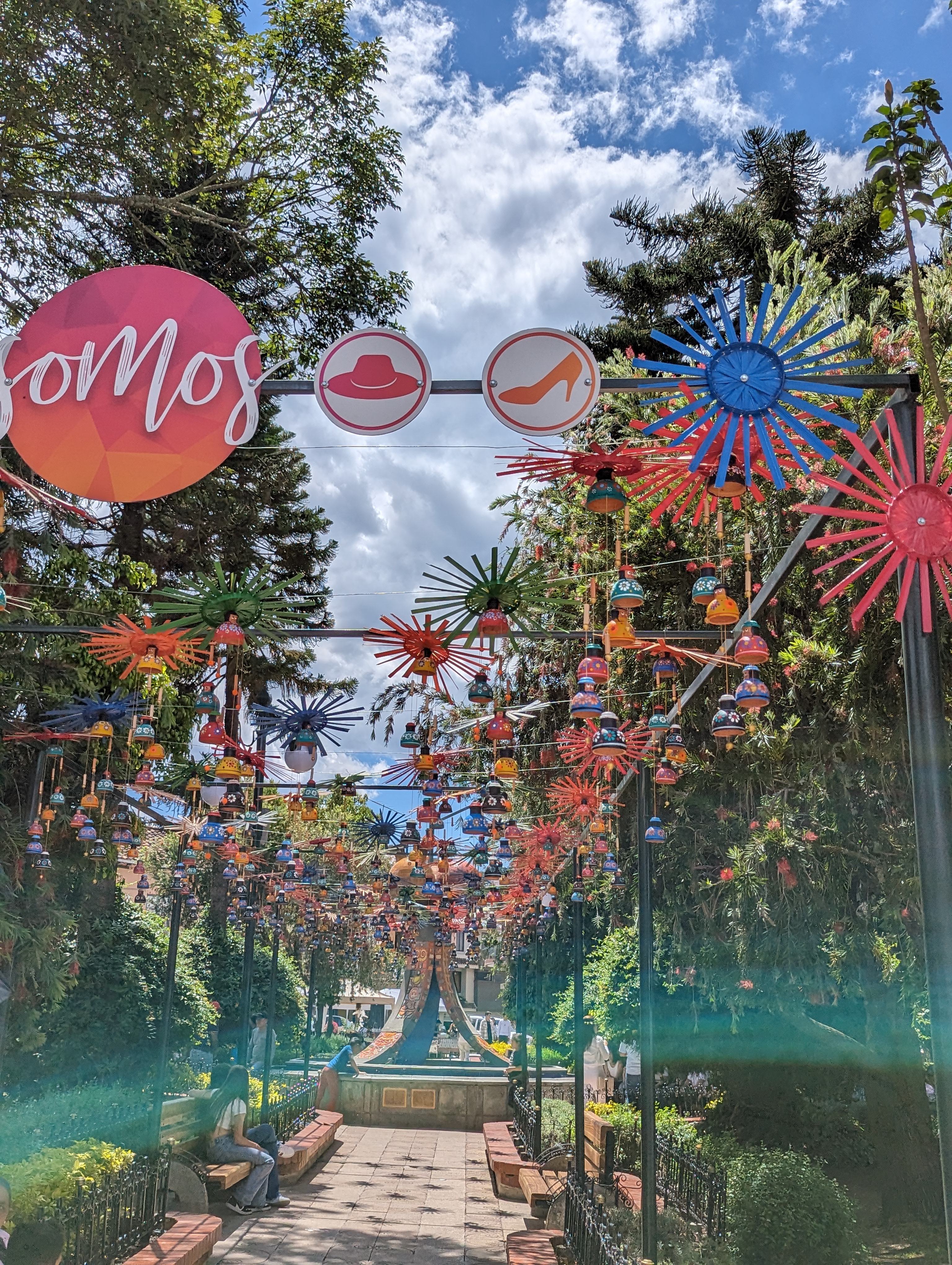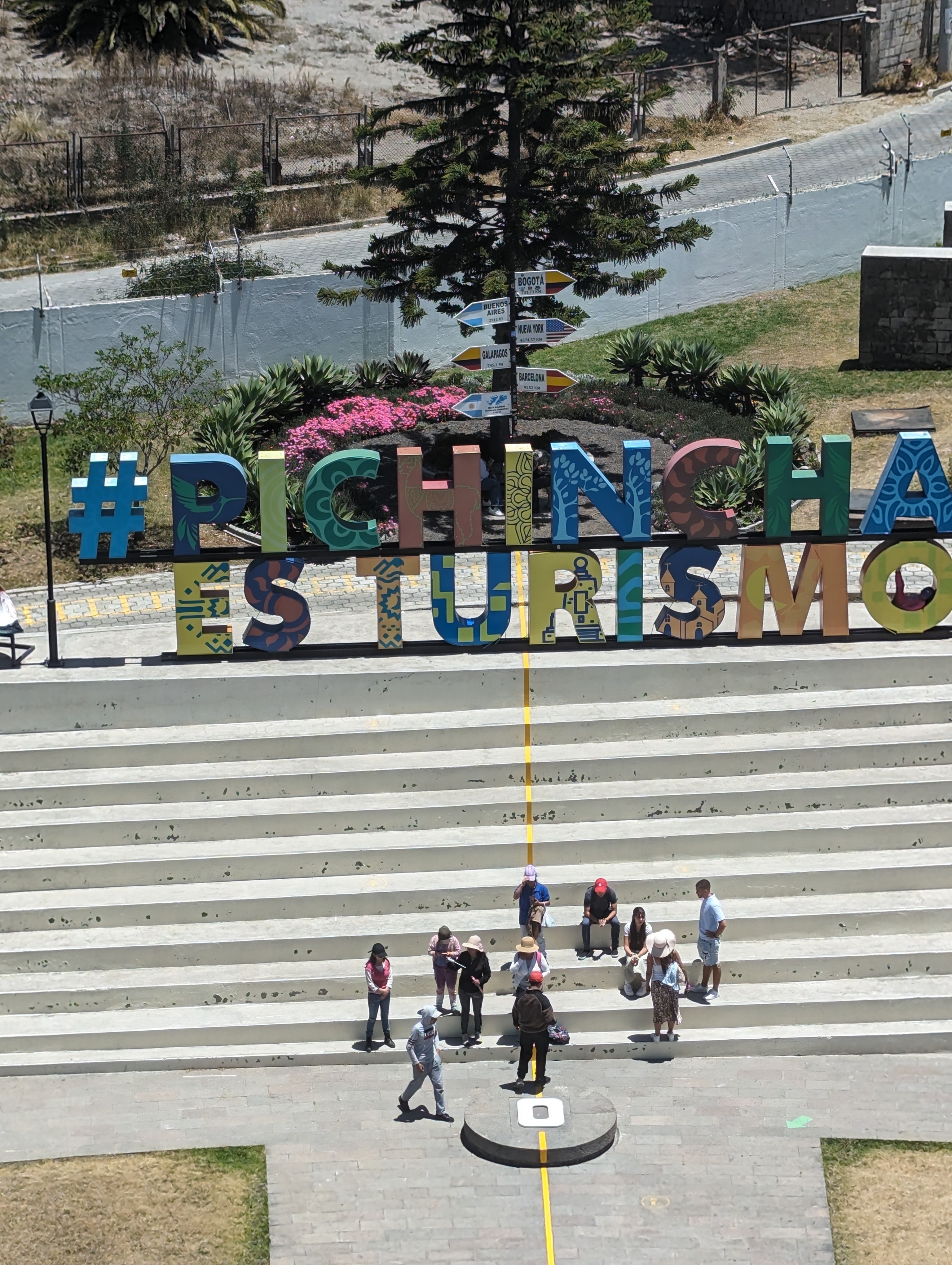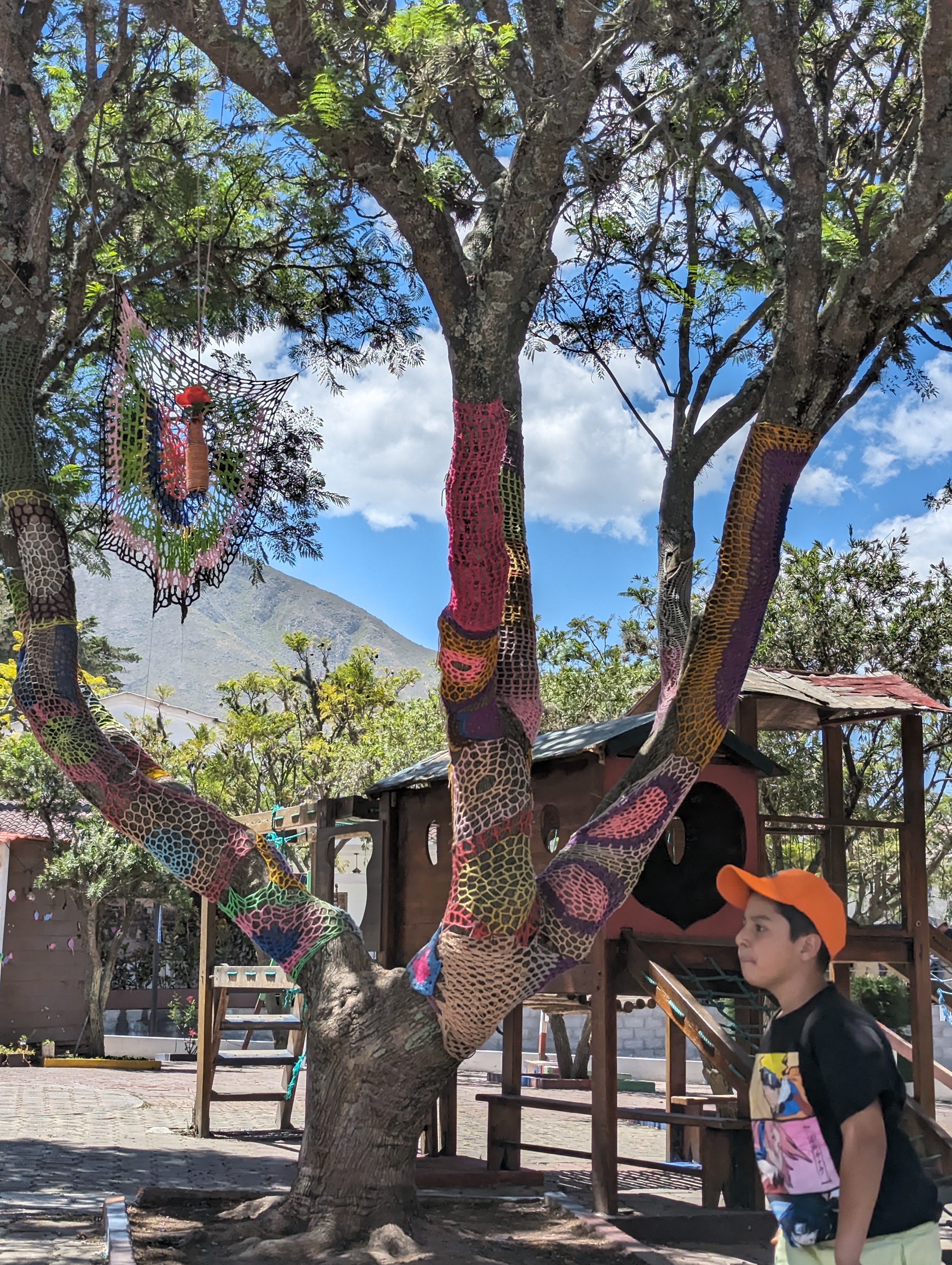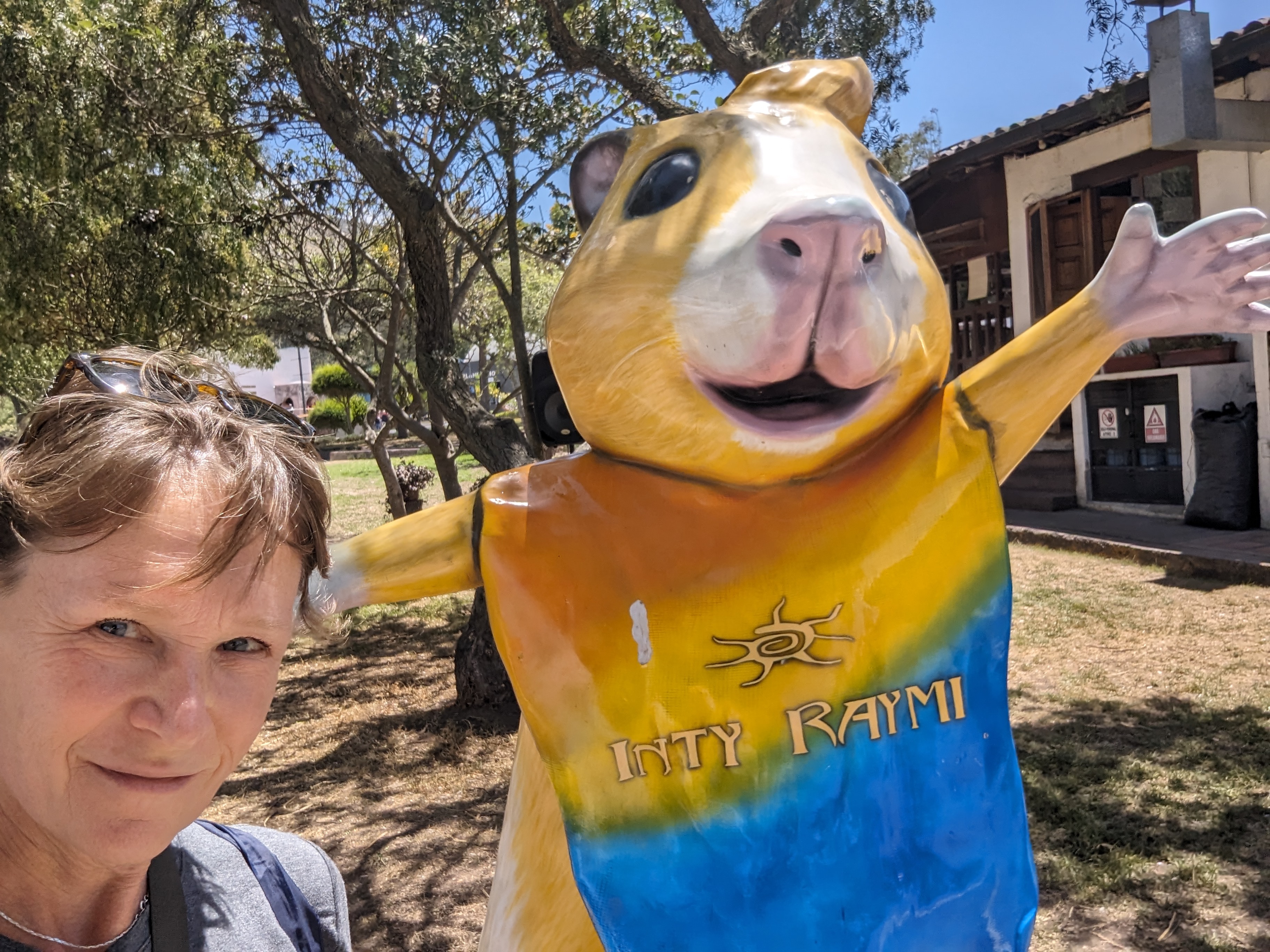 Crochet art on the tree.A little cathedral.That is a big guinea pig!I still don’t feel guilty I ate the guinea pig.Difficult to see but we are all sitting along the sign.