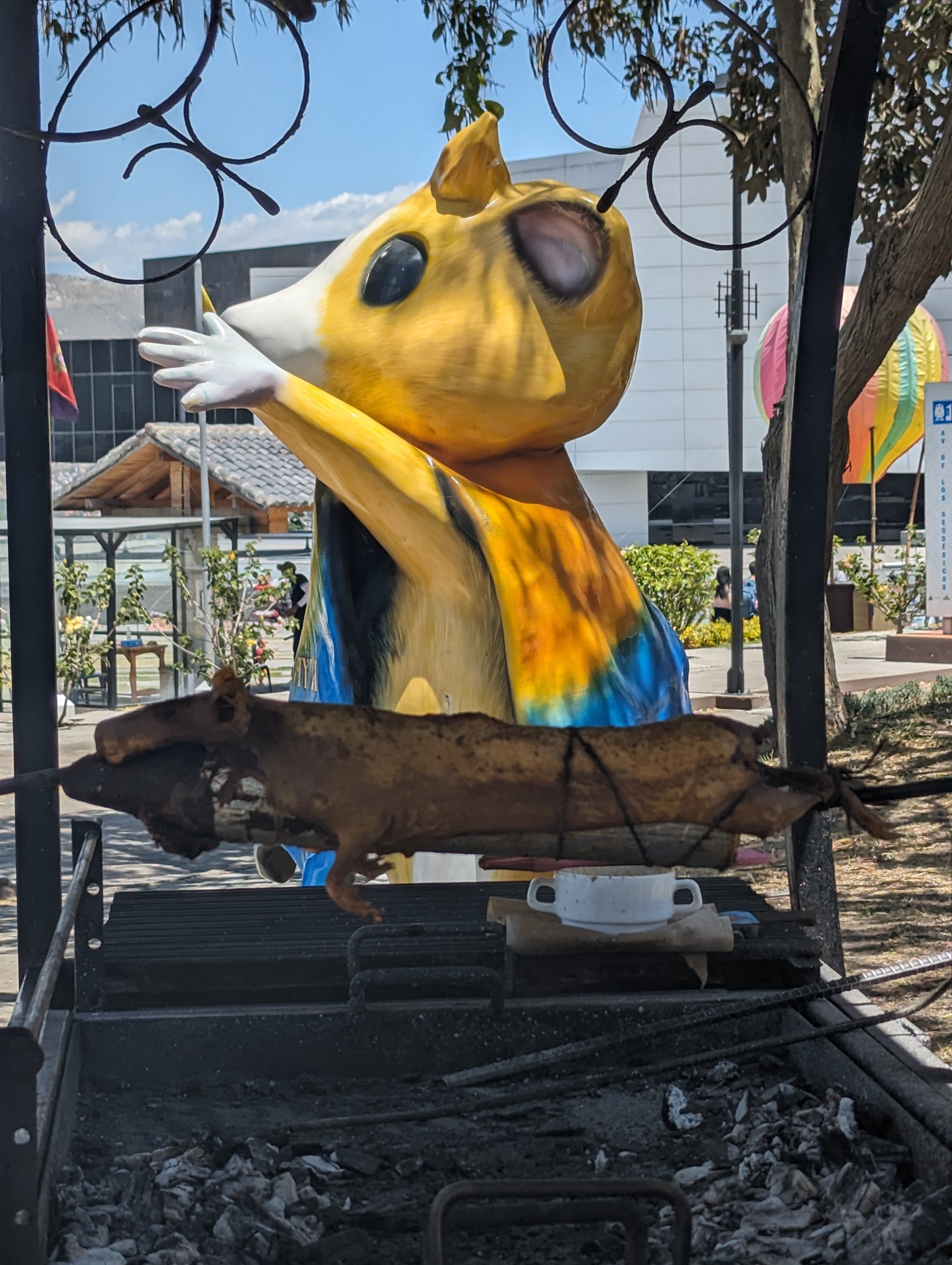 Not sure why they have a guinea pig on the spit here but it is an Ecuadorian custom and delicacy. There is a sign saying not to take it off the spit. That is actually one really big guinea pig.