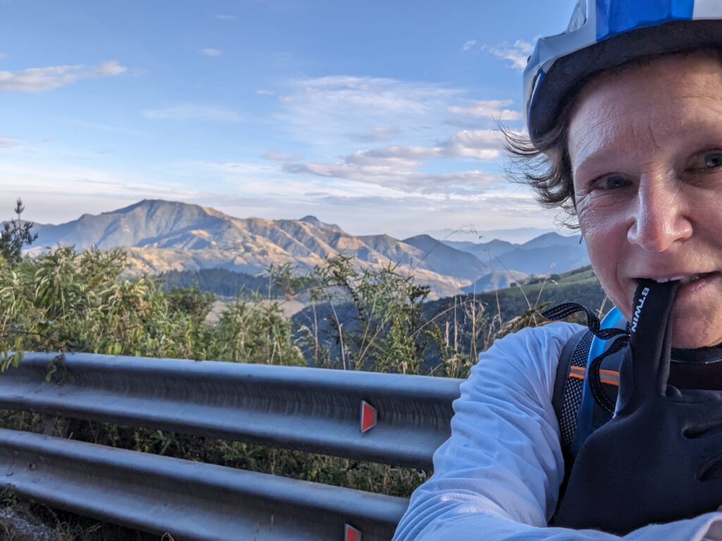 At the top of that first hill, I got on the bike but waited for the traffic to clear! I stopped along the highway going downhill to get this shot. So cold. It was just under 40 degrees. We stopped at Nono, the first town, to warm up before continuing on. So beautiful.