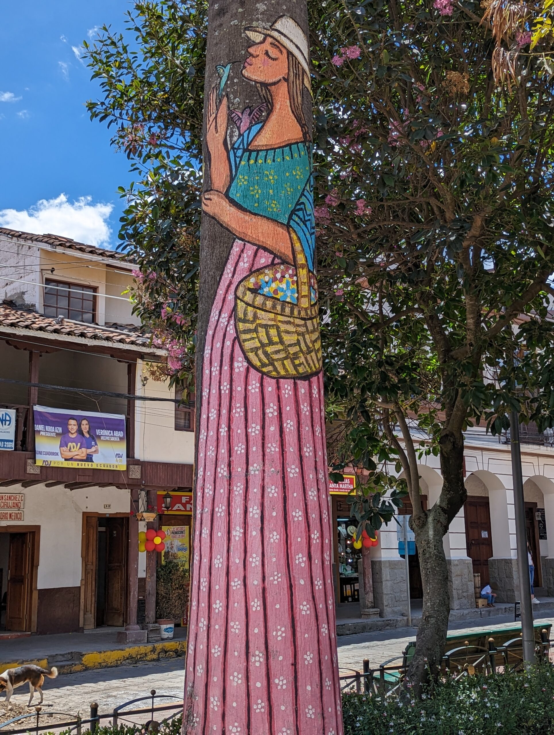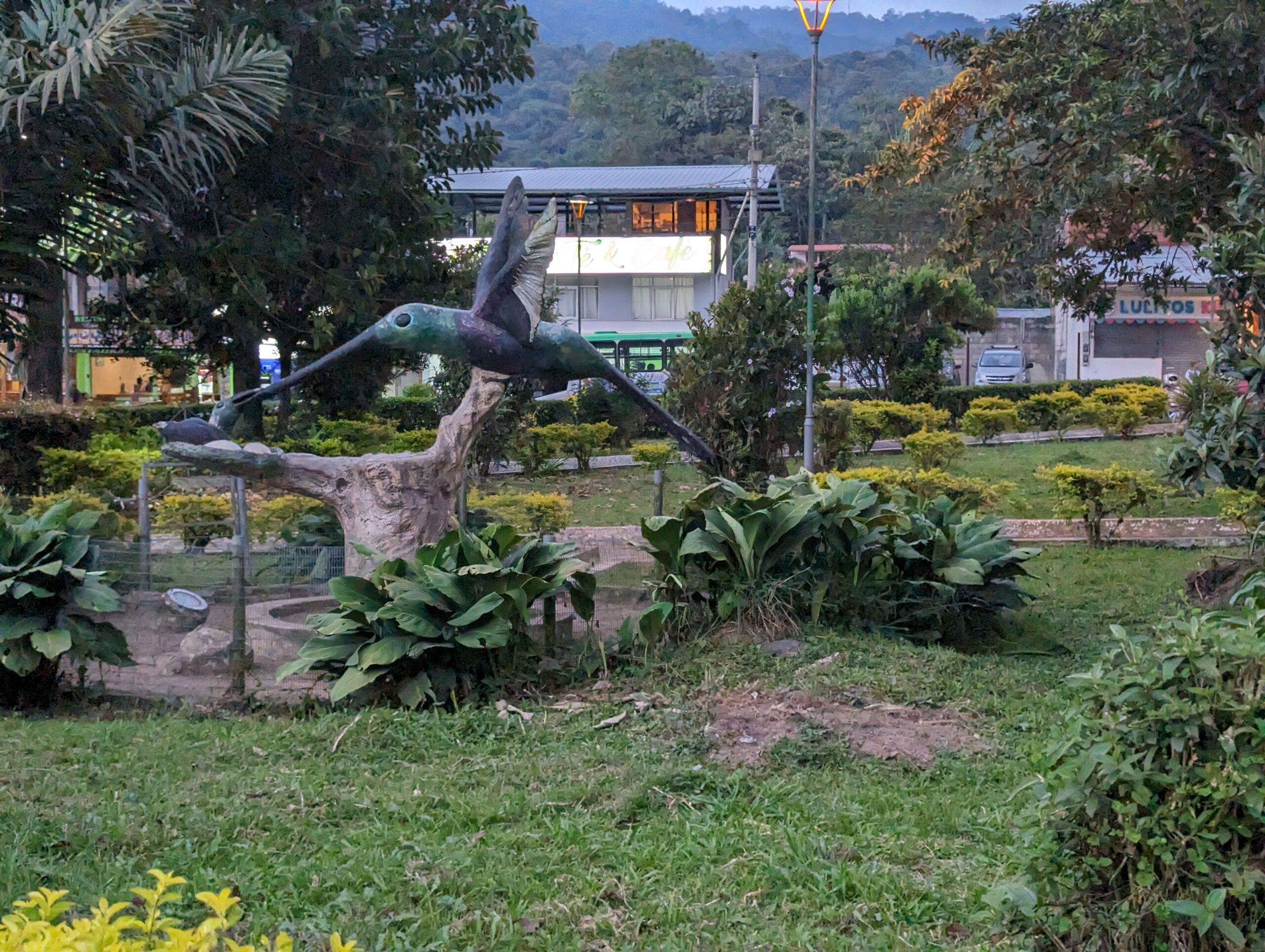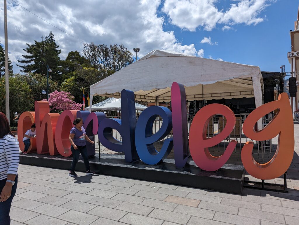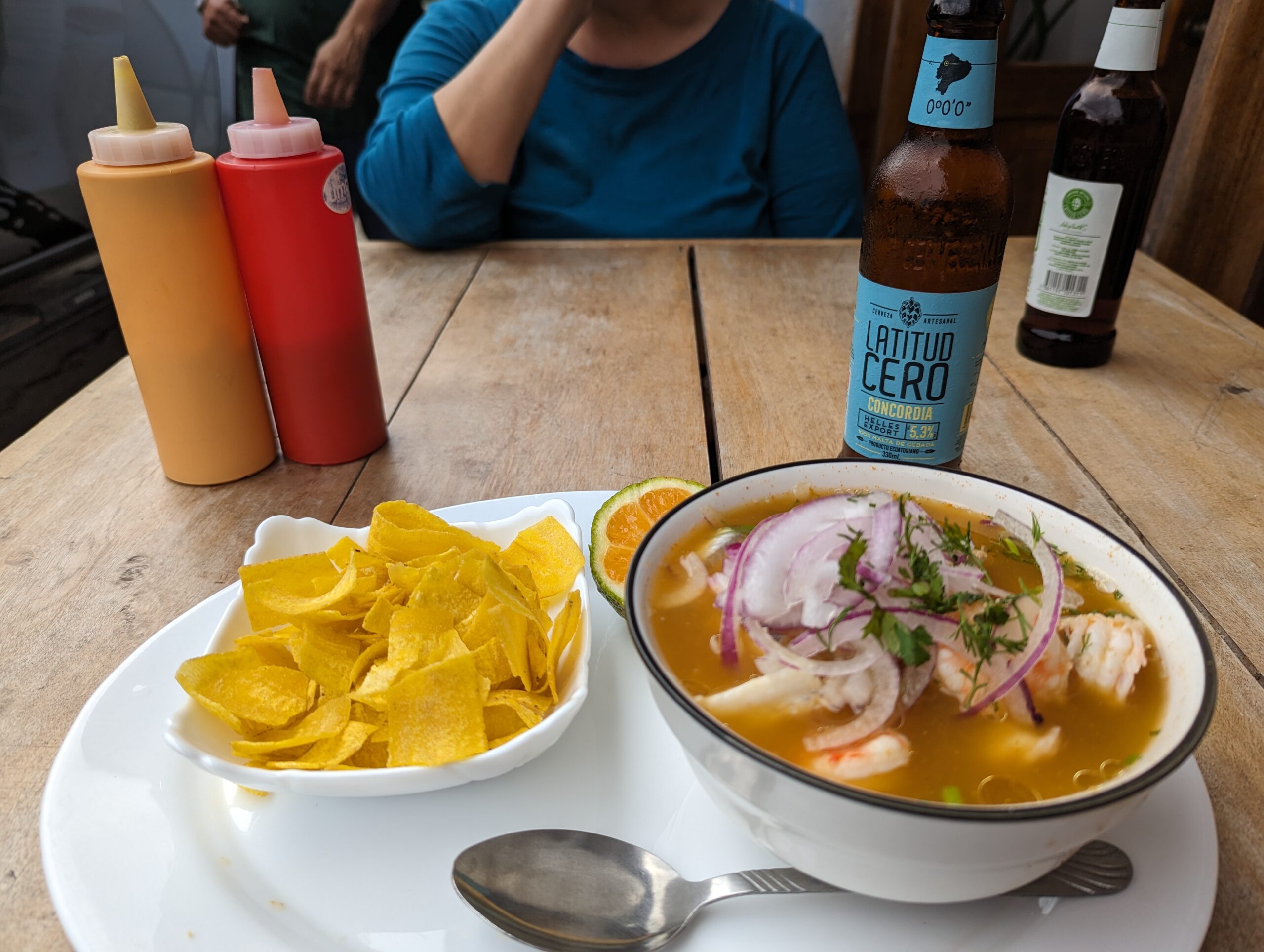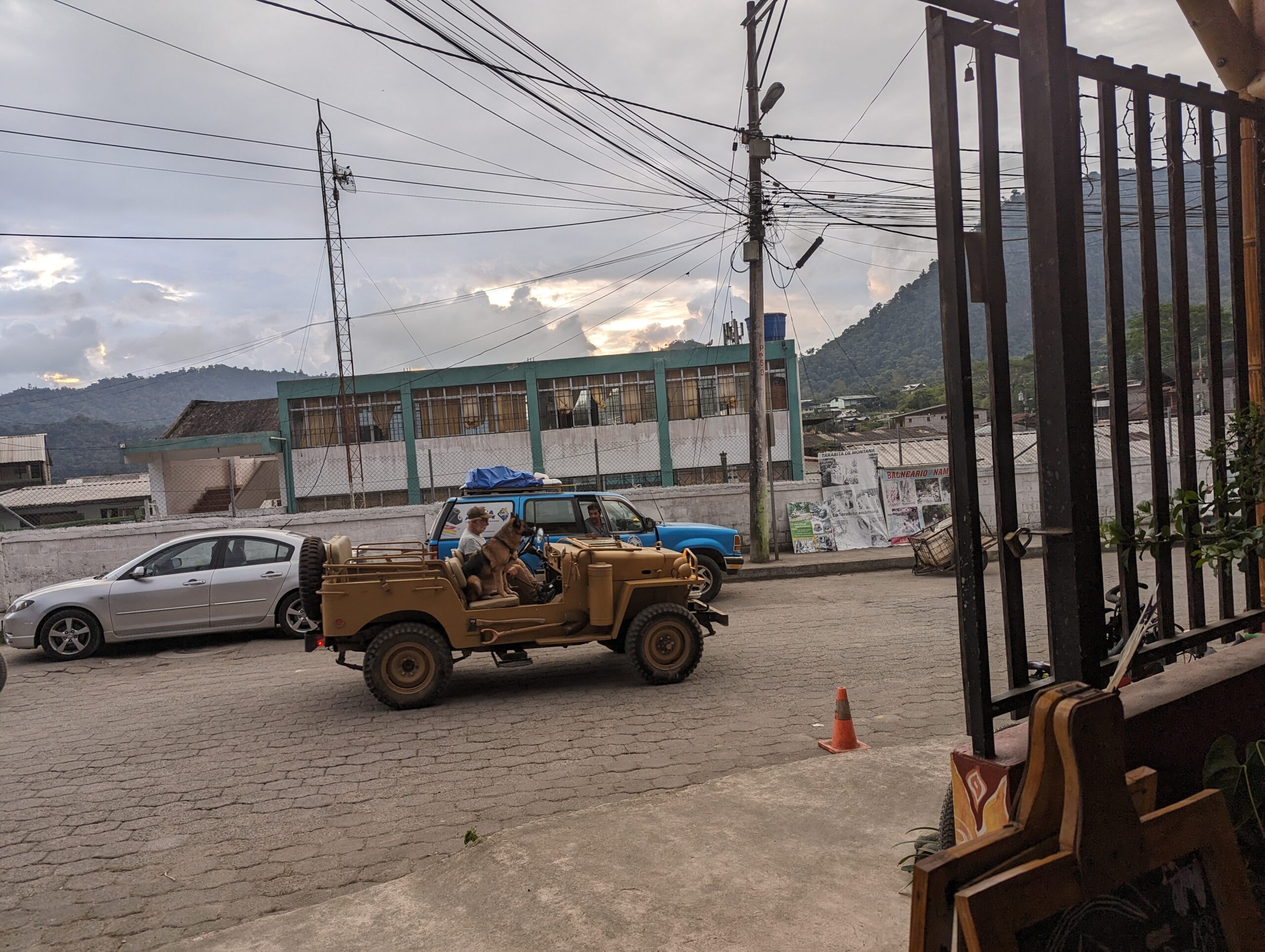 Such a cute very small town.I finally found a mixed encebollado to try. It’s a fish soup with onions, yucca, and spices. So delicious. It came with plantain chips.Just a guy and his dog out for a drive. In the center park.Service on Sunday.