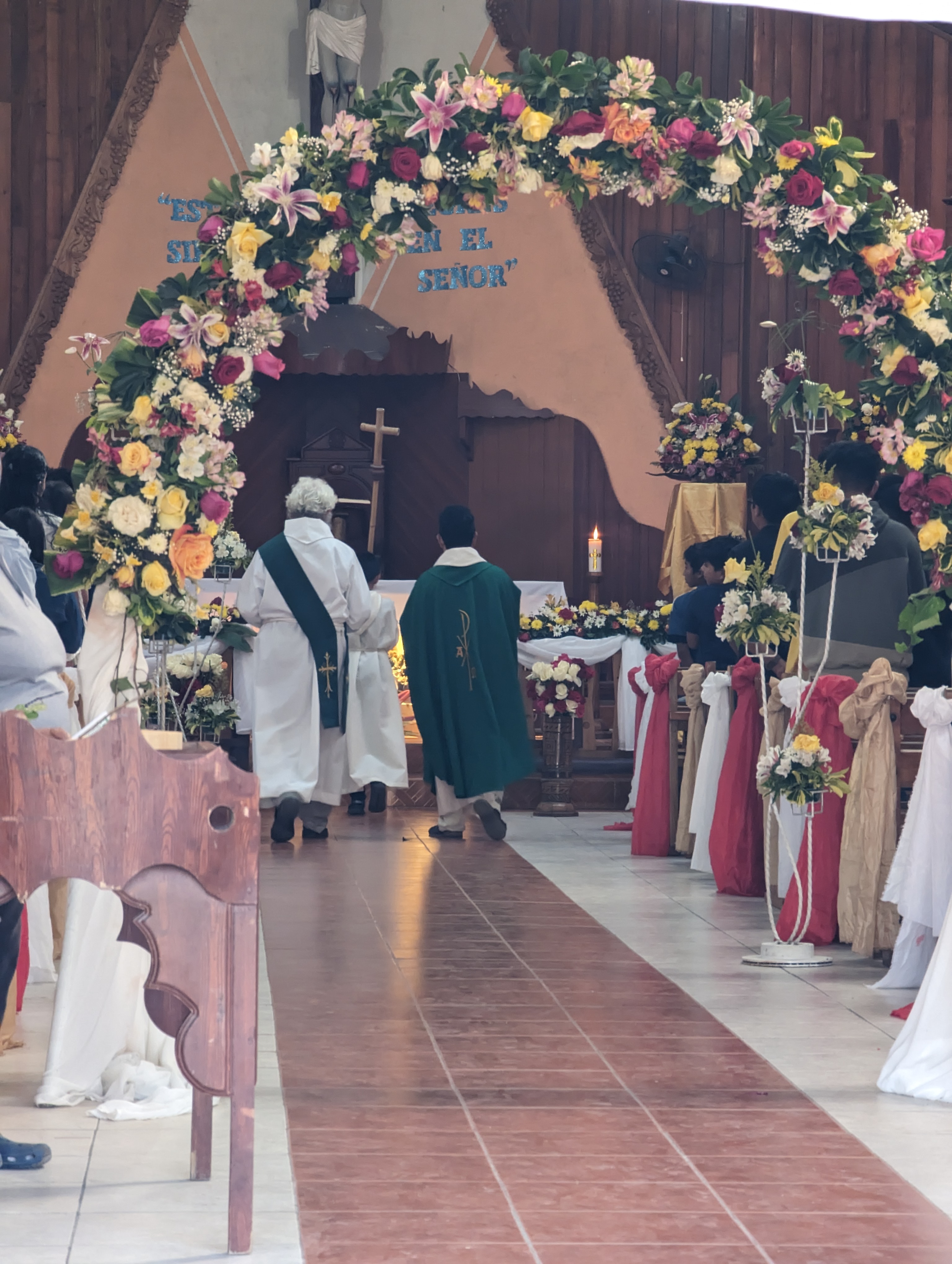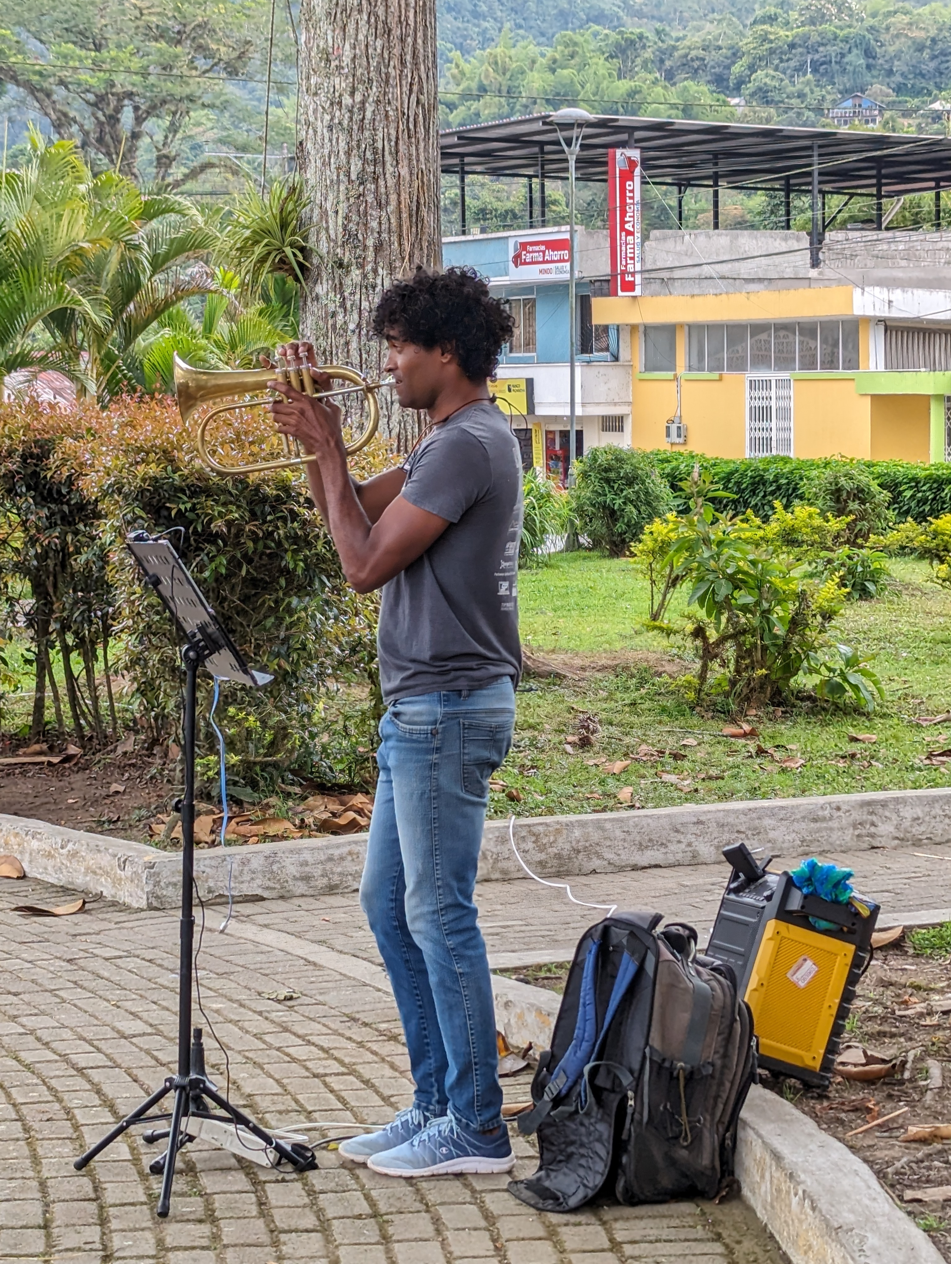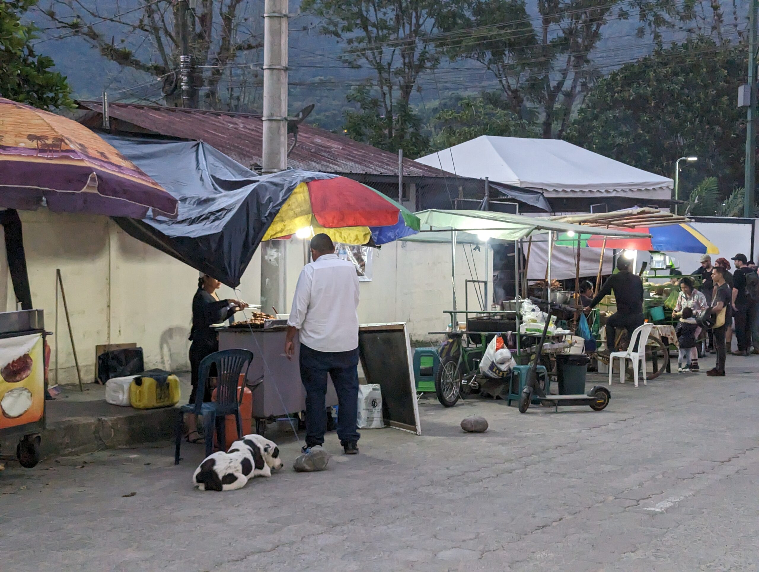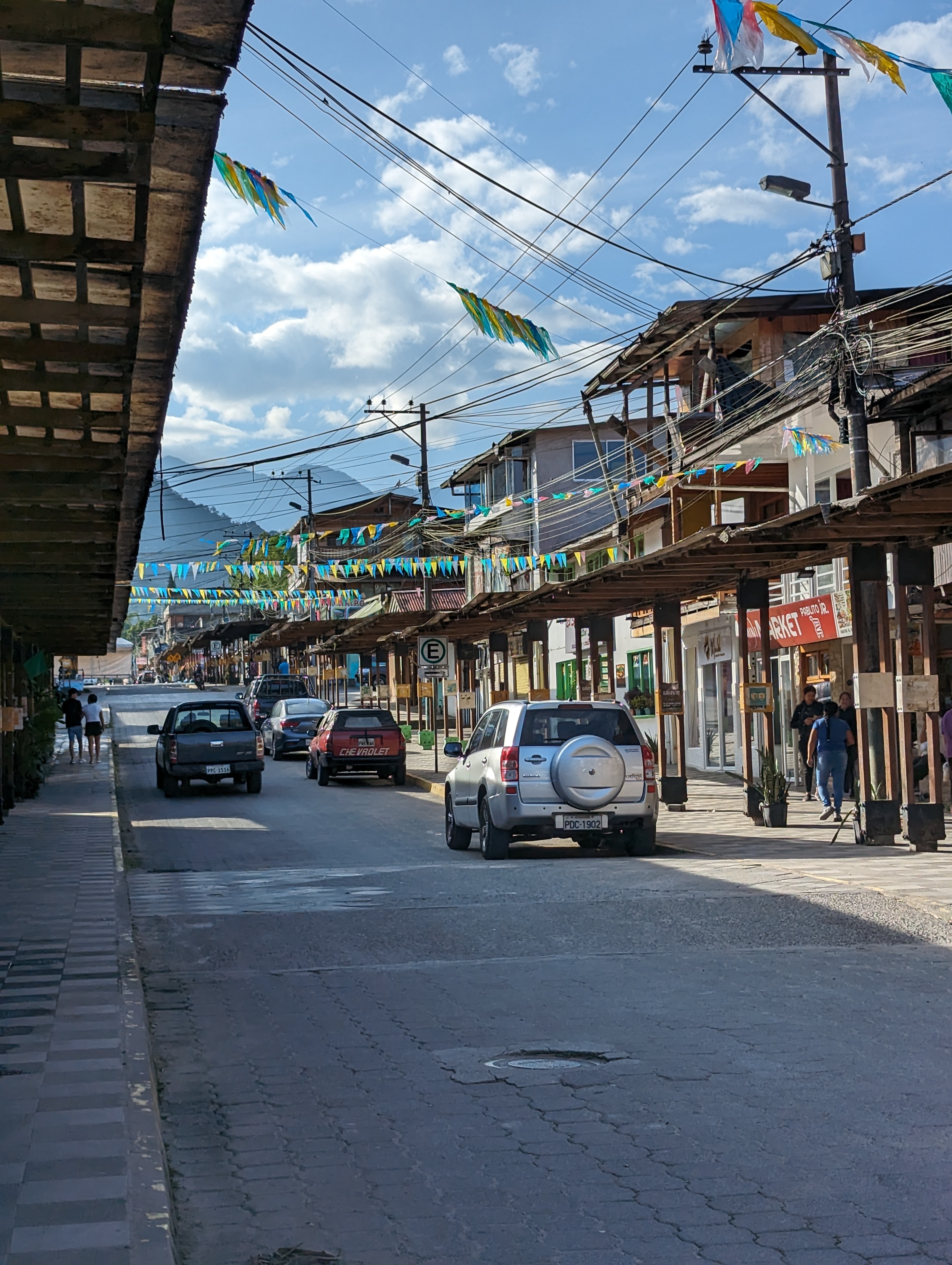 Such a cute very small town.I finally found a mixed encebollado to try. It’s a fish soup with onions, yucca, and spices. So delicious. It came with plantain chips.Just a guy and his dog out for a drive. In the center park.Service on Sunday.