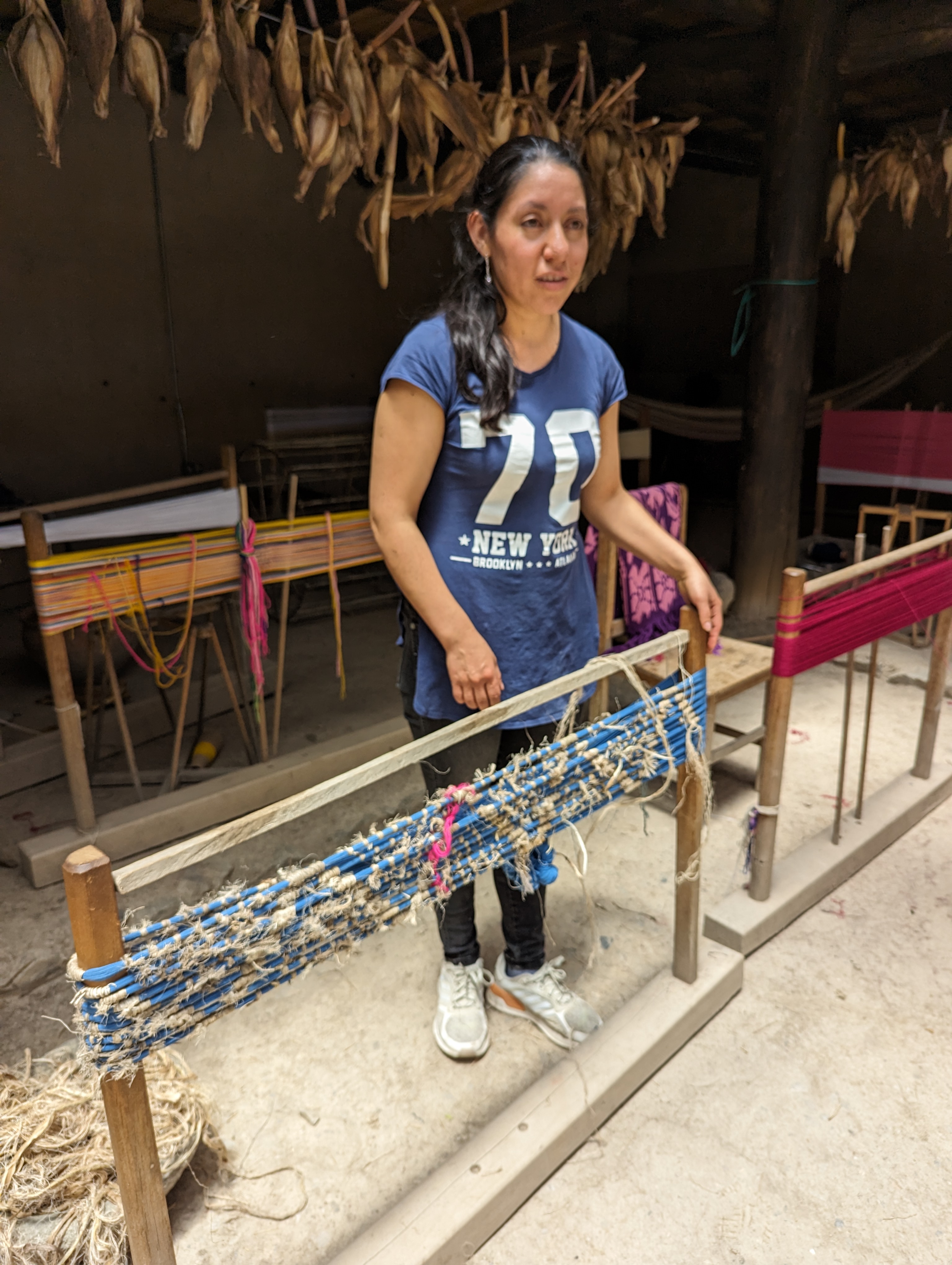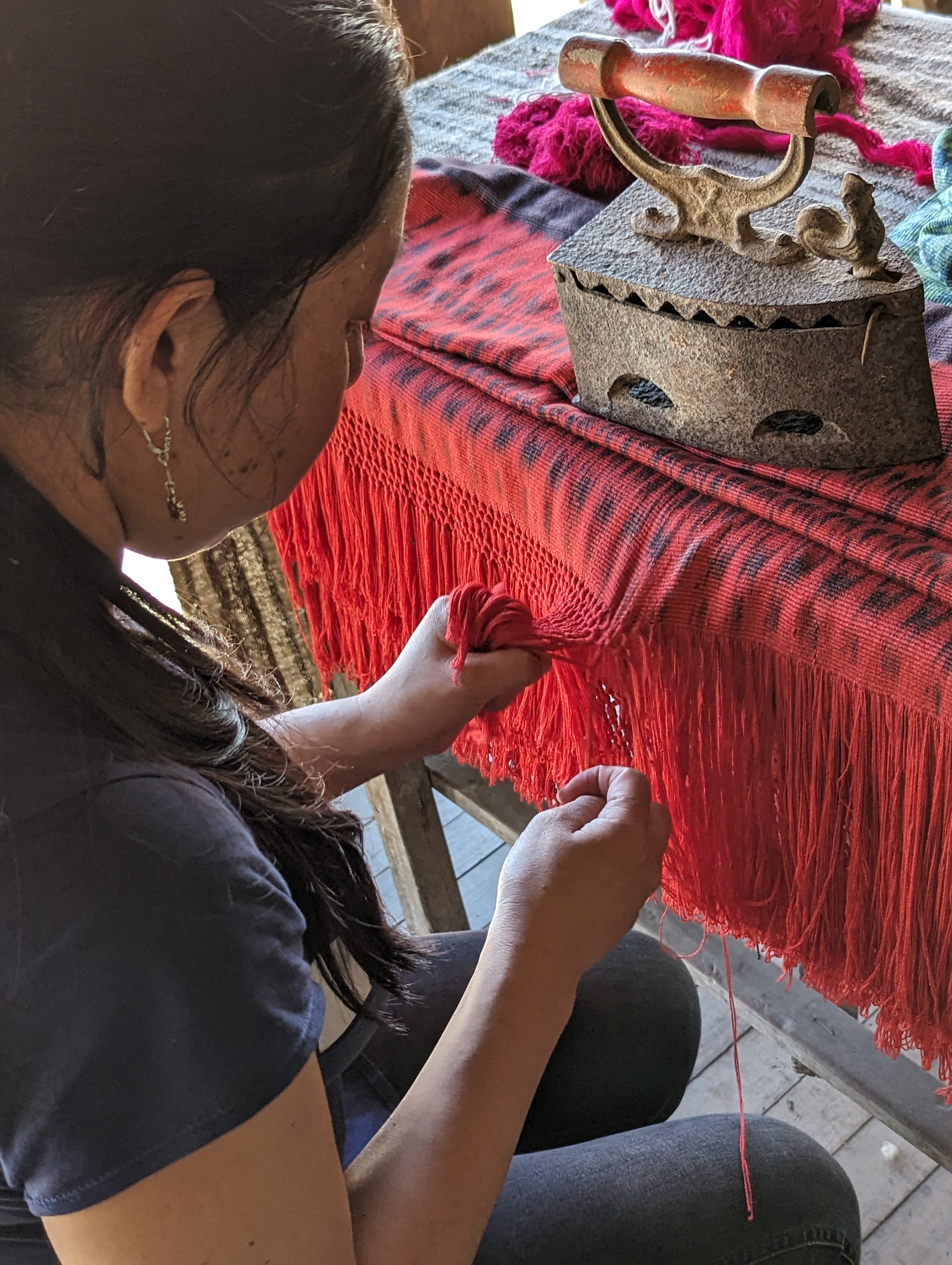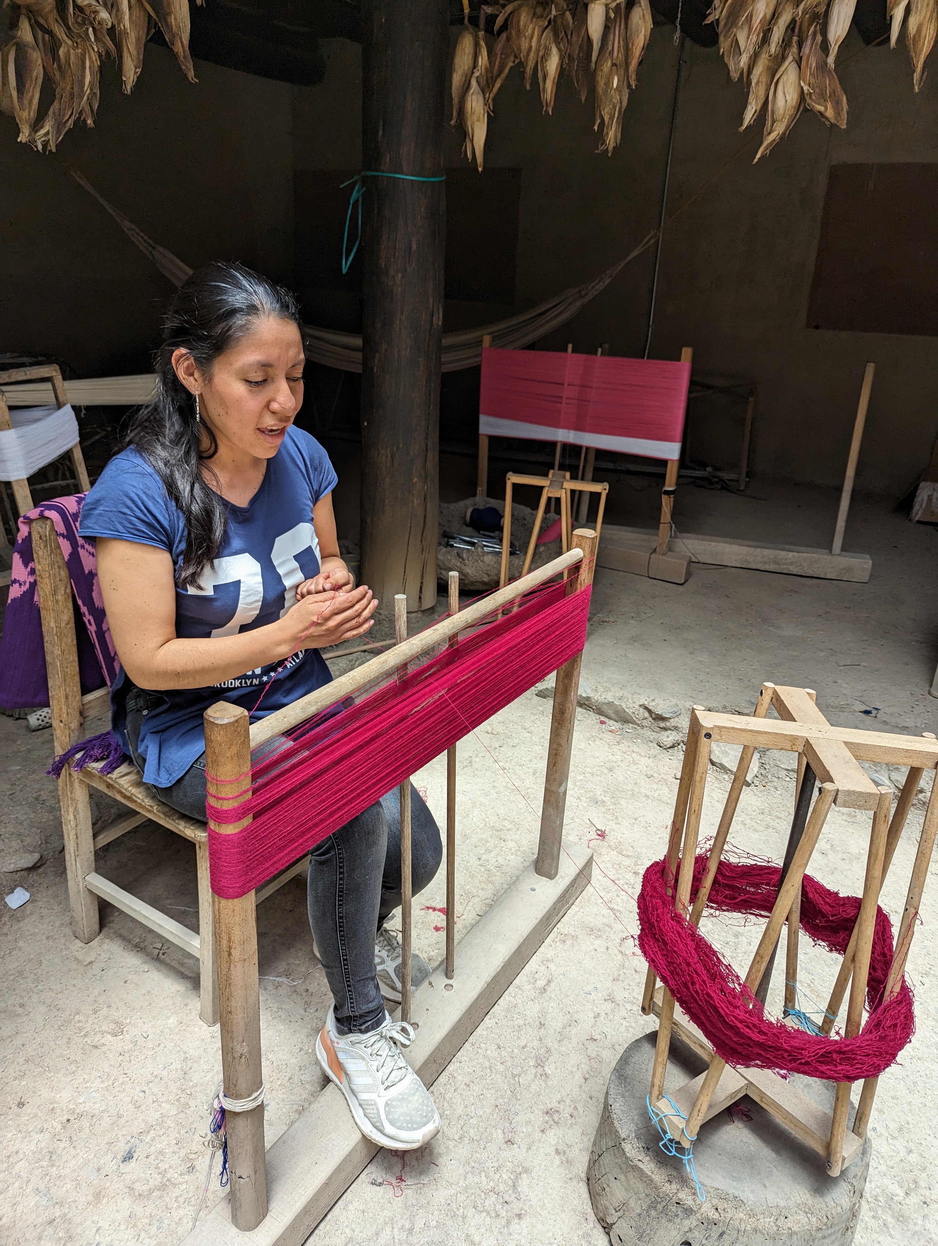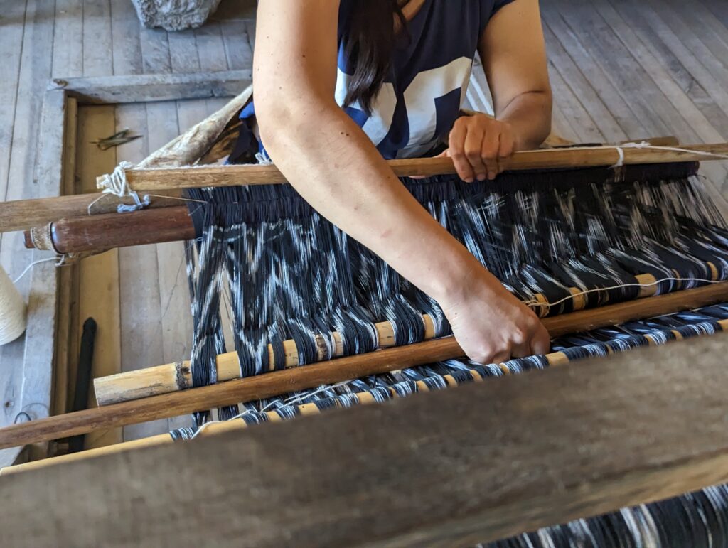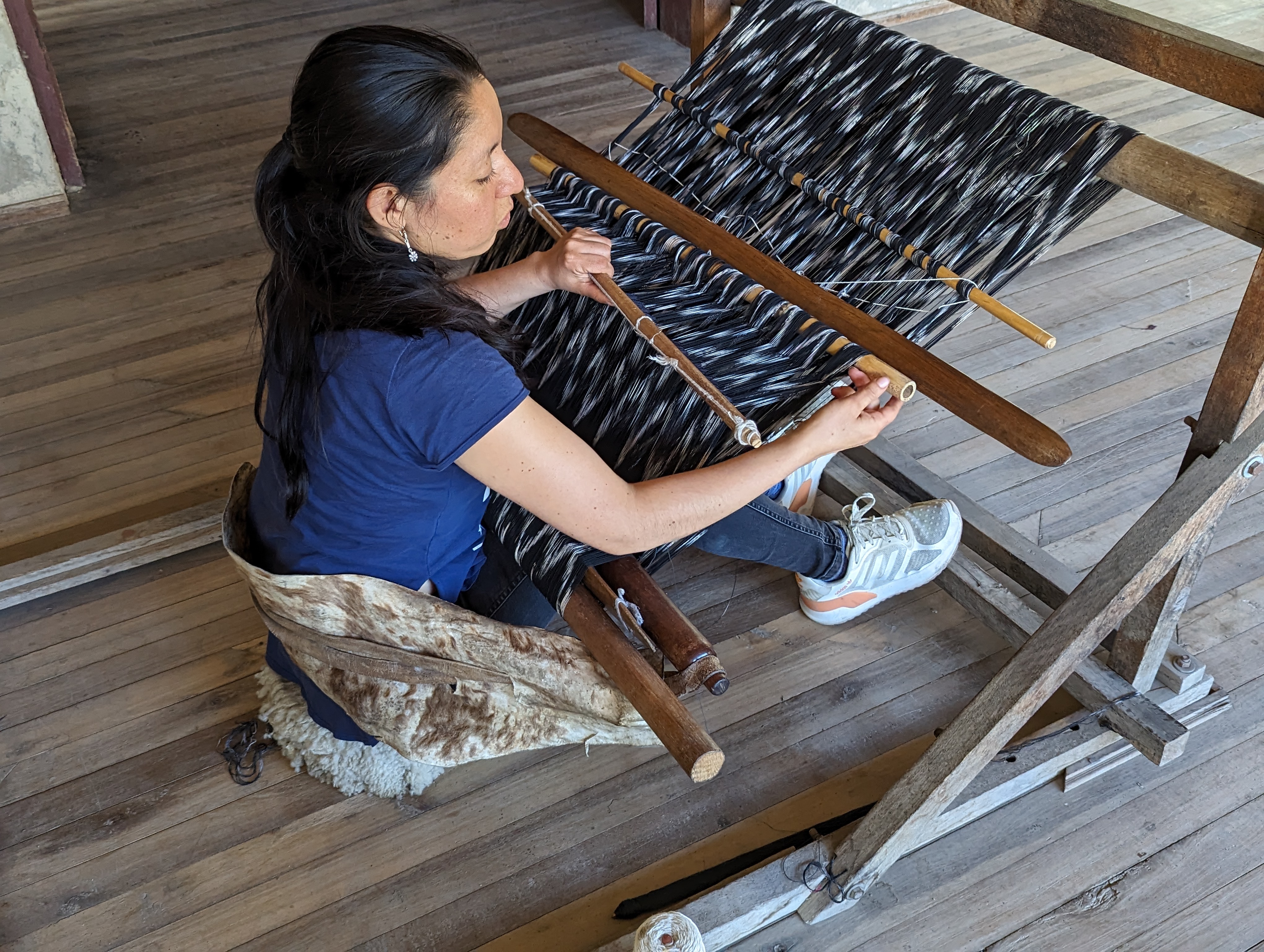 The weaving however is much different. They sit on the floor and the work is done with the arms instead of using peddles to tighten the weft threads.