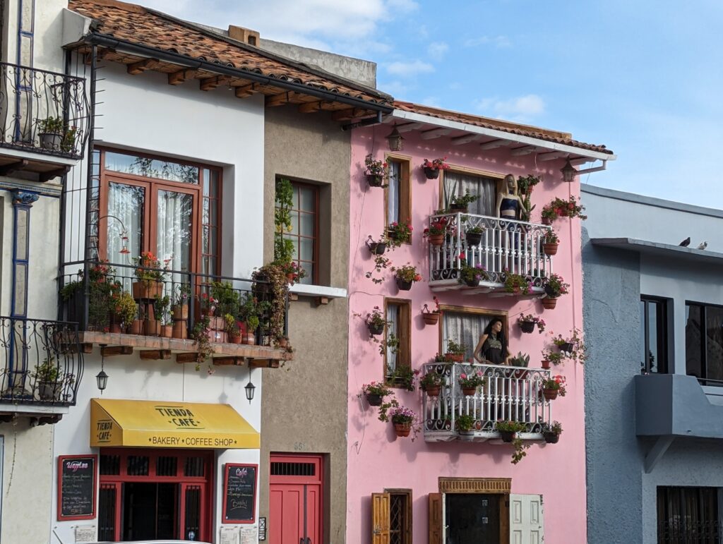 Note the mannequins on there balconies of the pink building.Tortillas de Tiesto.